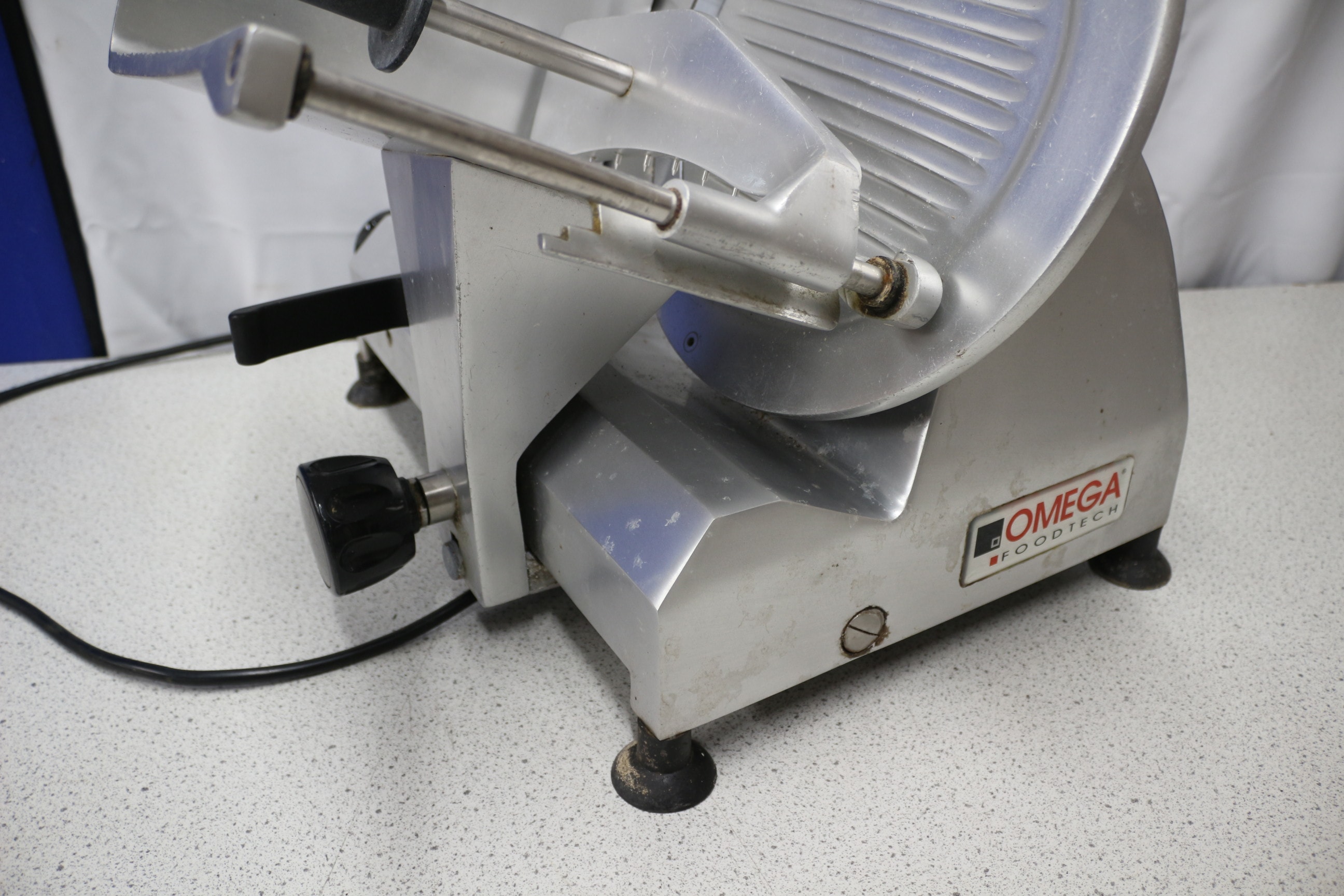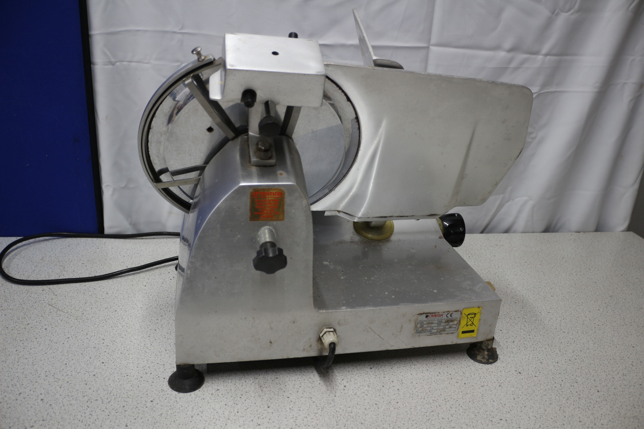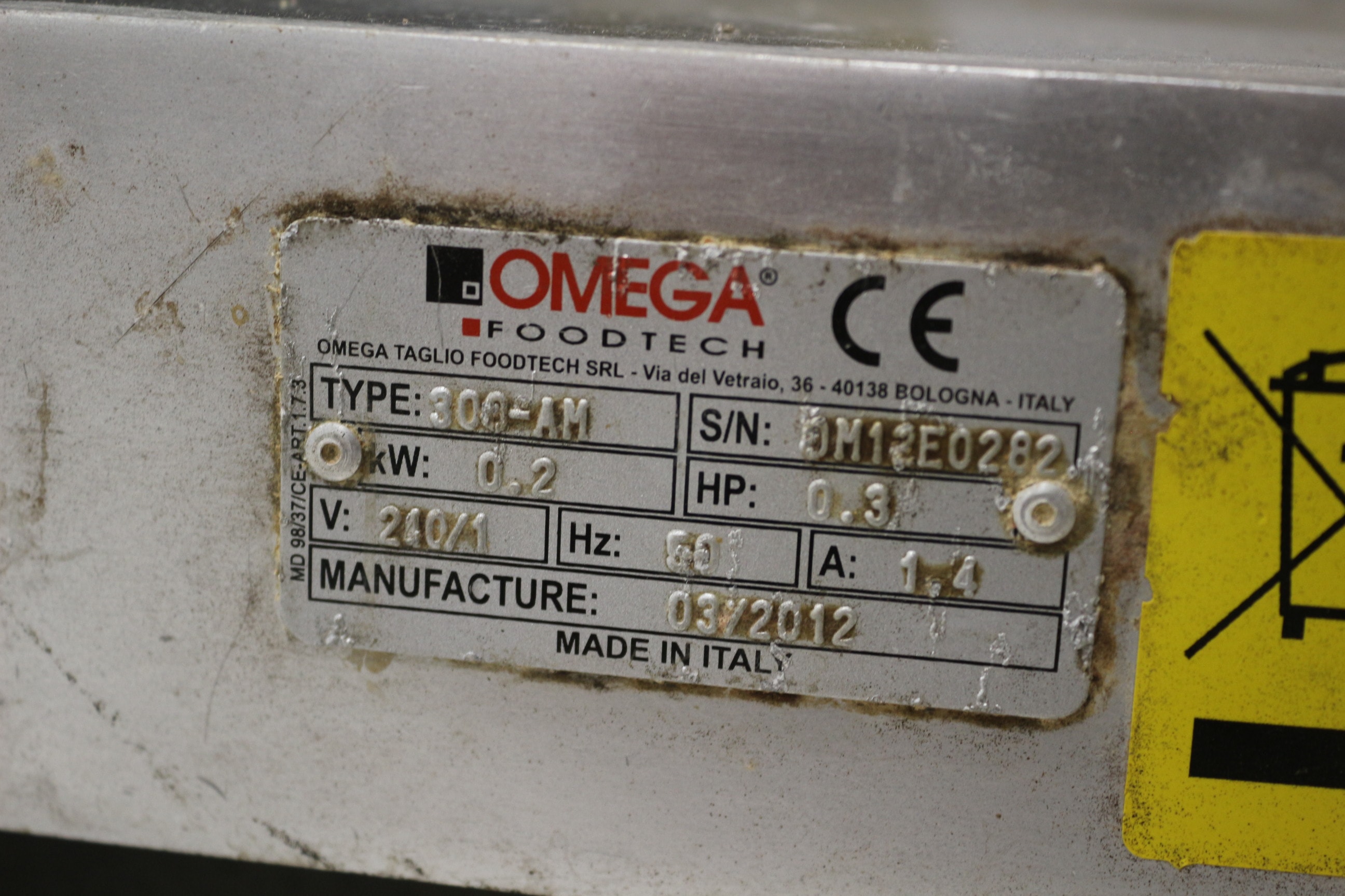 A stainless steel commercial food slicer by OMEGA FOODTECH, Type 300-AM, manufactured 03/2012 in Italy with a CE mark. Untested
