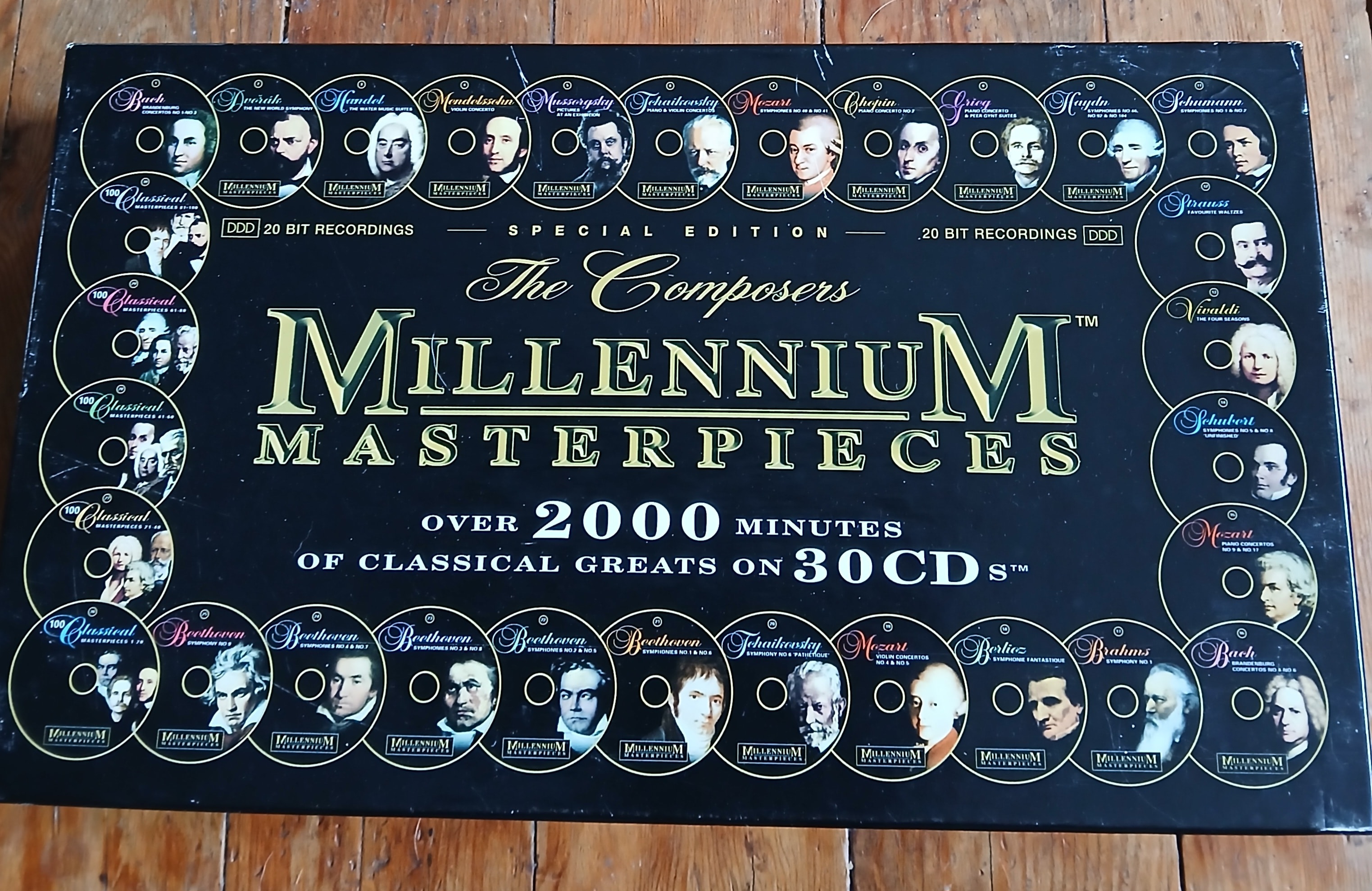 A black and gold “The Composers Millennium Masterpieces Special Edition” 30-CD classical music box set by Prism Leisure, featuring “DDD 20 Bit Recordings” and “Over 2000 Minutes of Classical Greats”, with composers like Bach, Beethoven, Tchaikovsky, and Mozart.