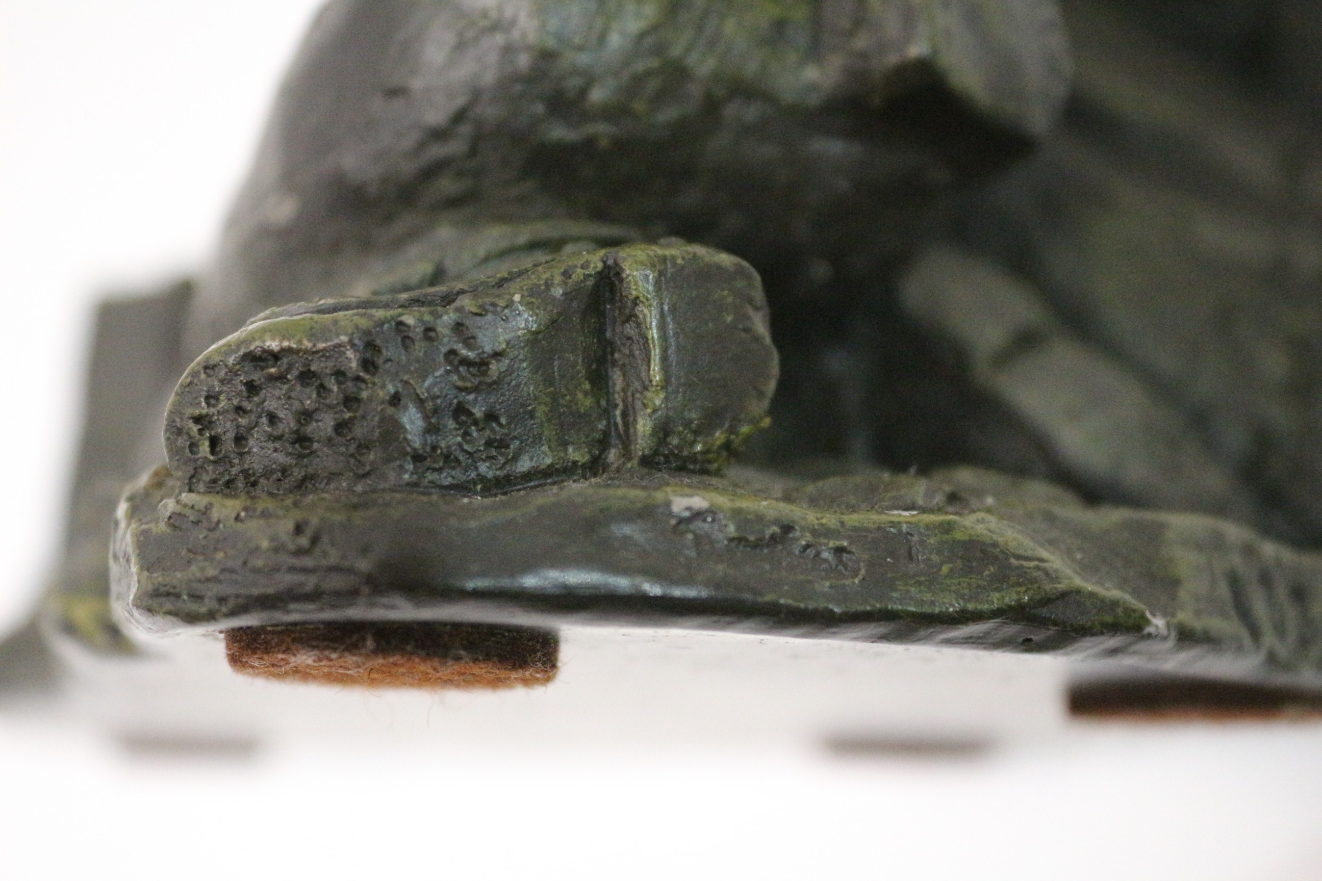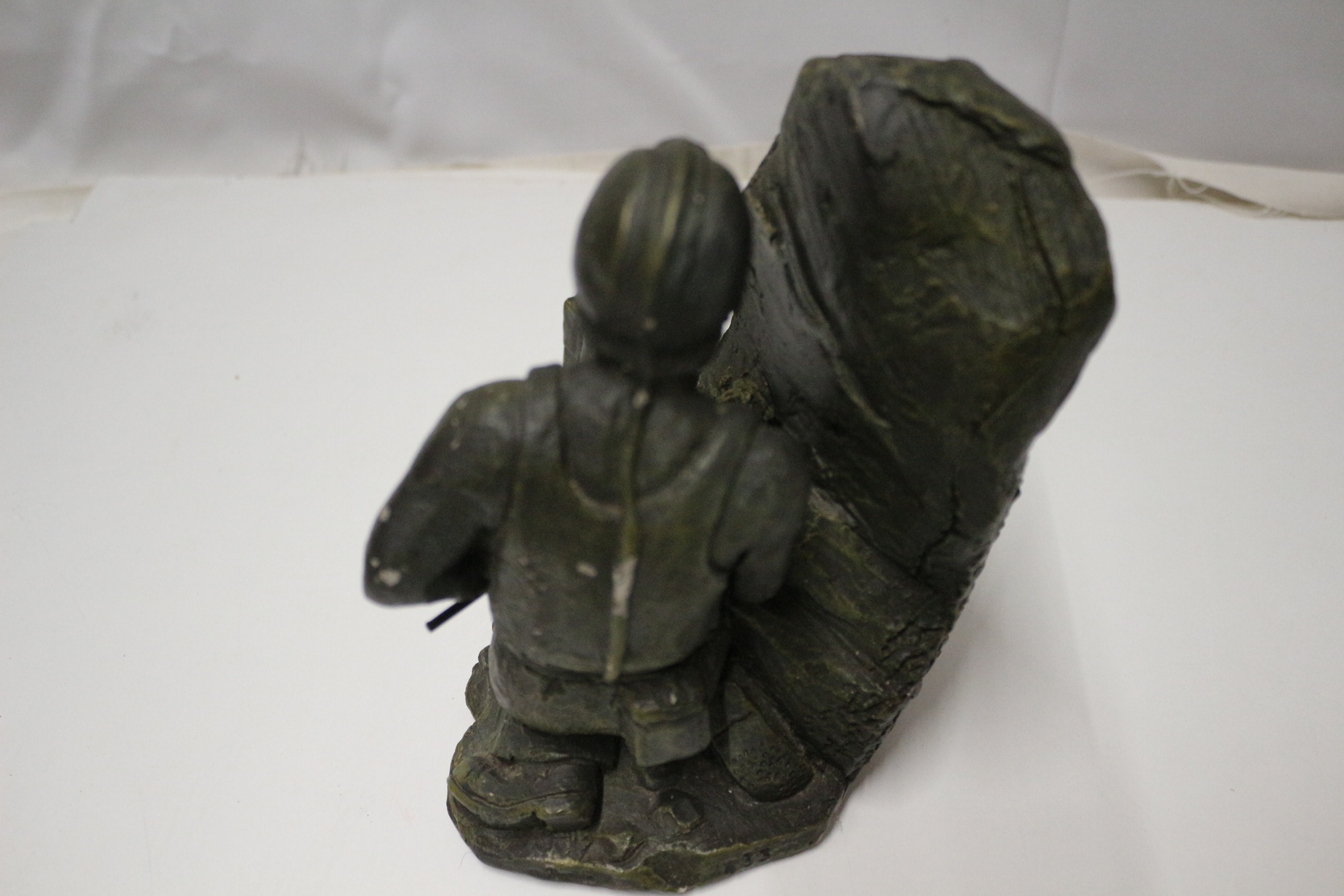 A dark green statue depicting a miner kneeling with a pickaxe and lamp, possibly plaster 17.5cm tall