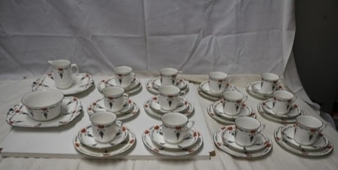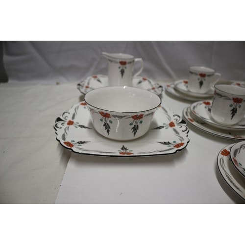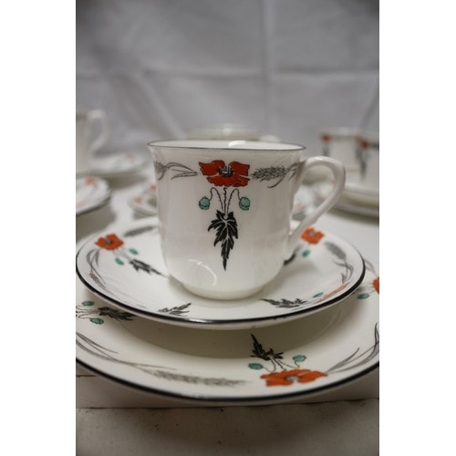 A 40-piece Shelley porcelain tea/coffee service, primarily white with an orange poppy, black foliage, and grey wheat stalk pattern, comprising 12 cups, 12 saucers, 12 plates, one creamer, and one serving bowl, marked ‘Shelley ENGLAND’ and pattern number ‘11326’.