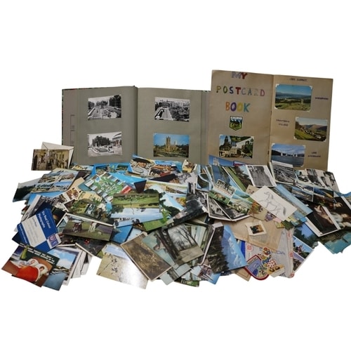 A large collection of vintage postcards, some loose and others housed in two “My Postcard Book” albums. Selection of written and unwritten