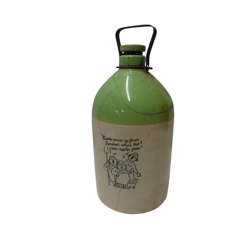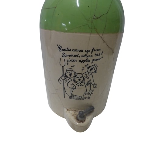 A two-toned green and cream ceramic empty cider jug with a spigot and metal handle, inscribed “Coates comes up from Somerset, where the cider apples grow” alongside an illustration of three figures. 47cm tall