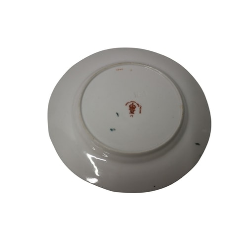 Three white plates with pink floral and green vine patterns and gold rims, marked ‘ROYAL CROWN DERBY ENGLAND’ with a crown symbol, ‘U’, and ‘C. 6942’ on the back. 15cm Dia
