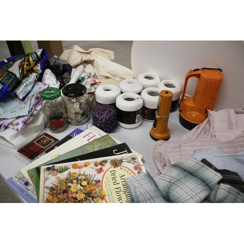 A collection of mens shirts, haberdashery, spools of thread, books, jars, and a flashlight.
