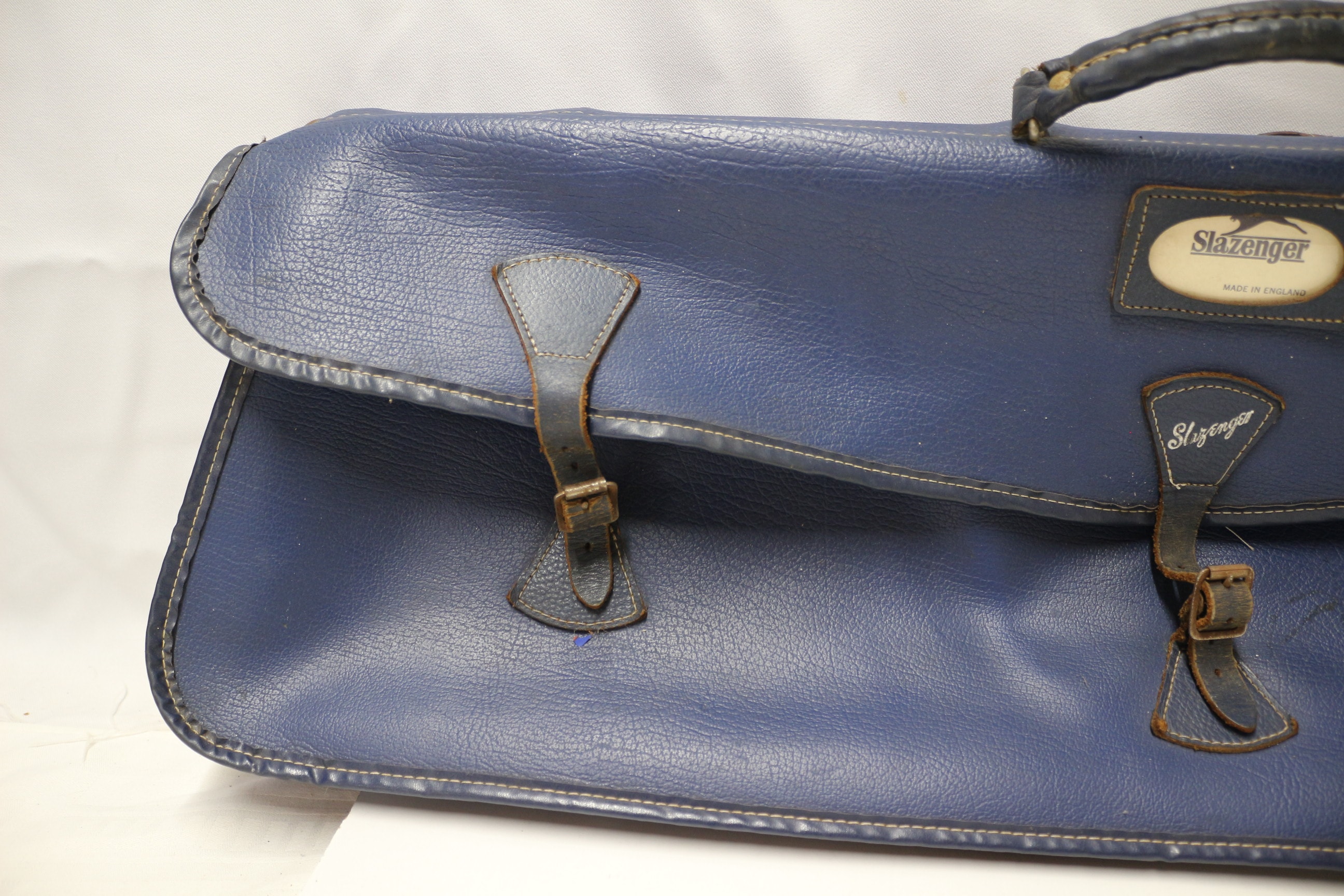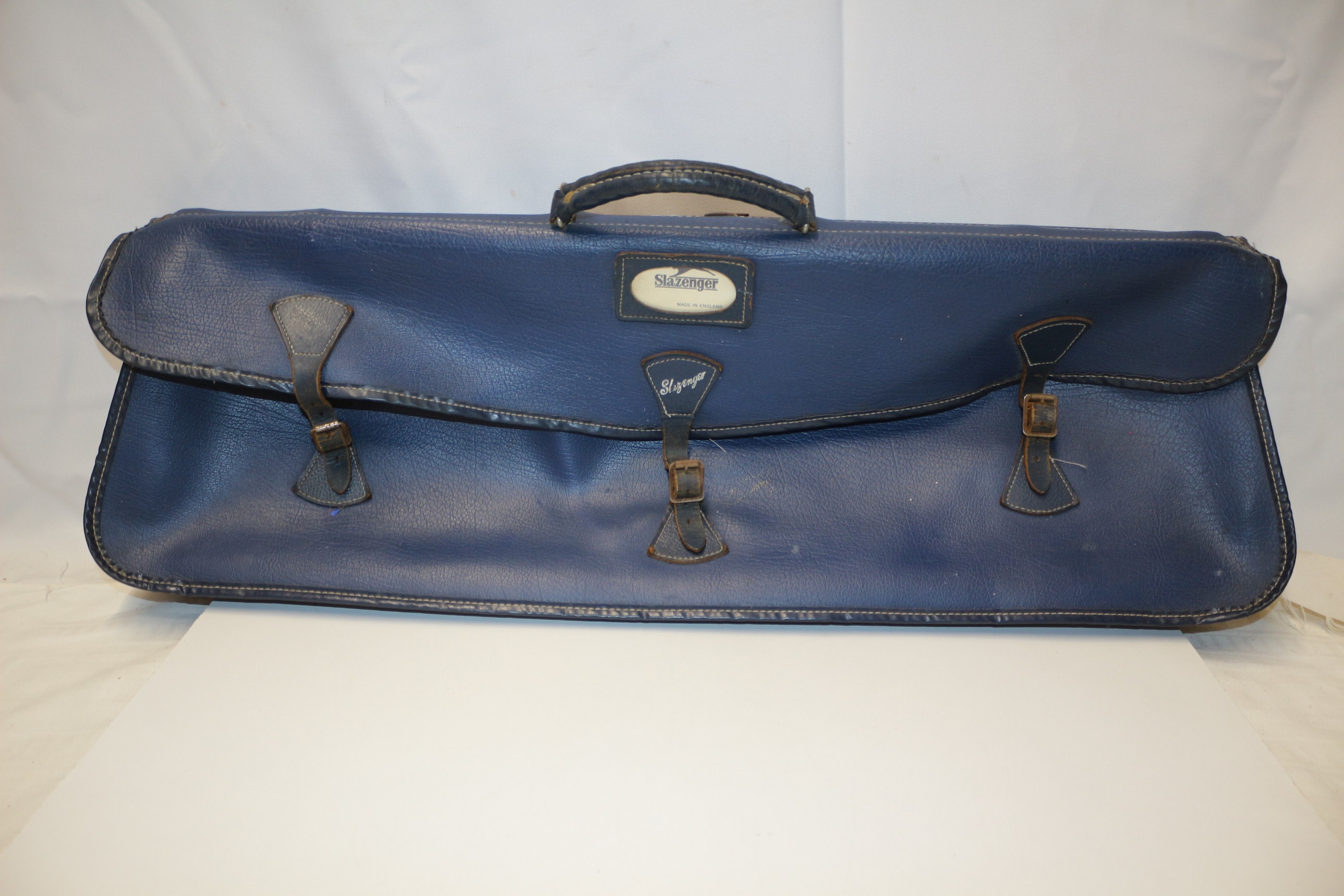 A Vintage blue Slazenger tennis bag with dark brown/black straps and handle, featuring labels that read “Slazenger” and “MADE IN ENGLAND”.
