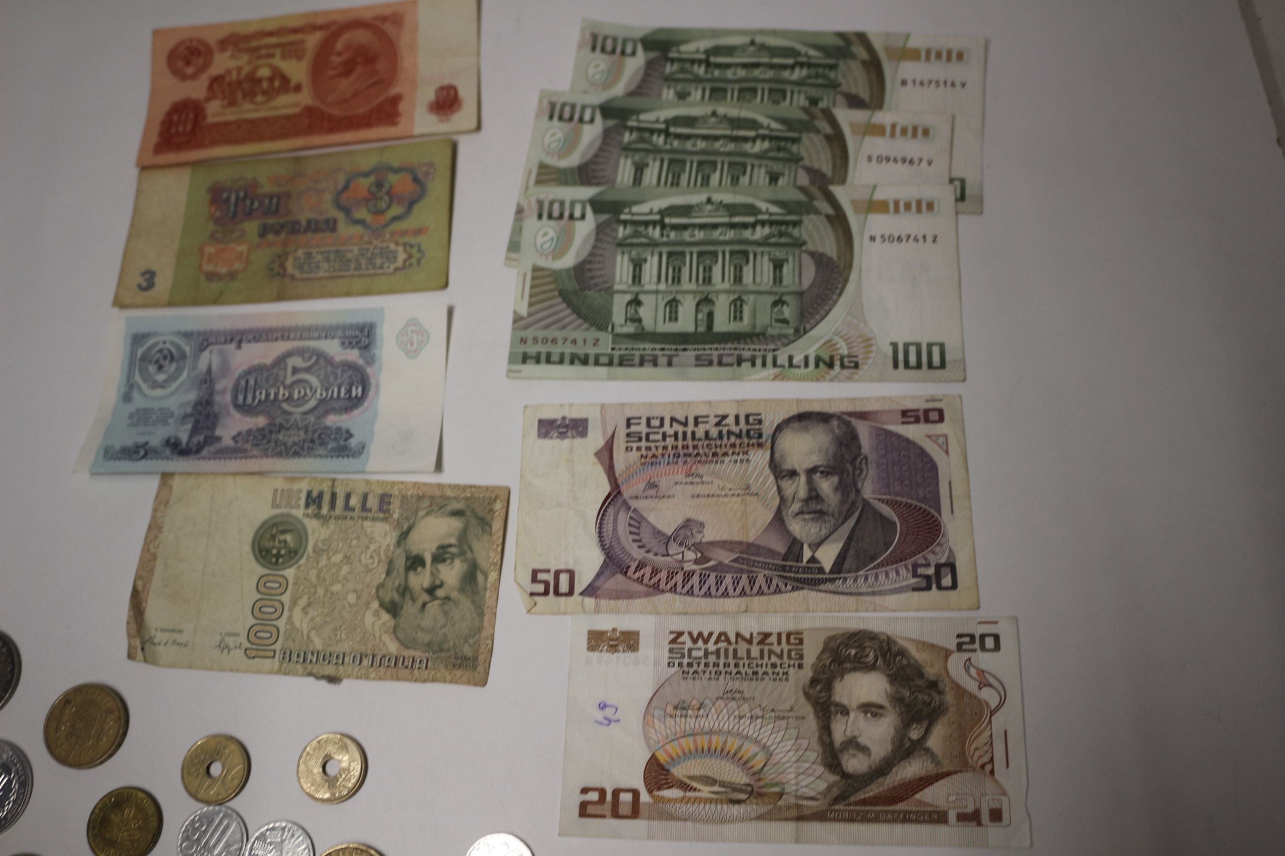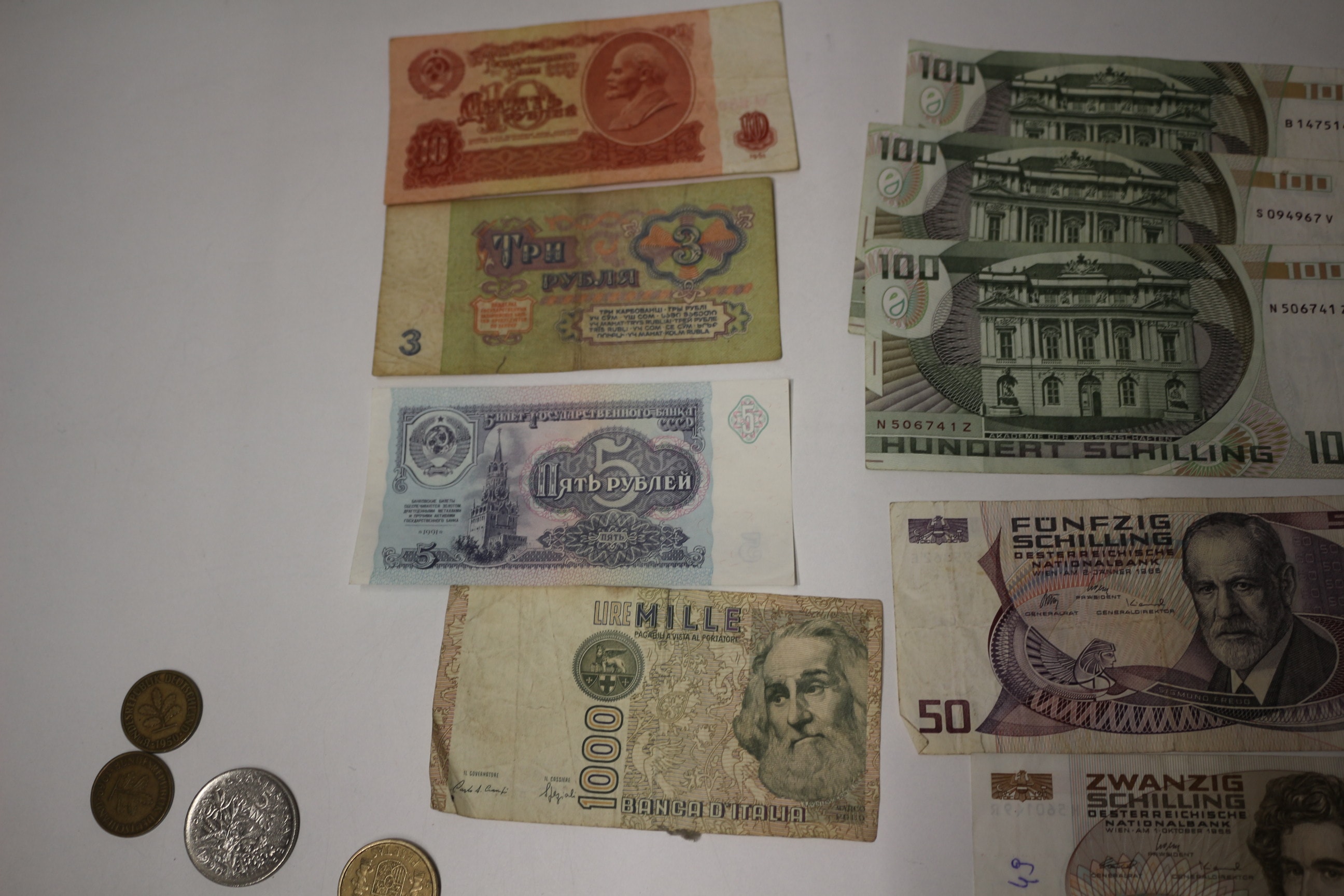 This lot contains three 1961 Soviet Union ruble banknotes: a red/orange 10 Rubles featuring Lenin, a green 3 Rubles featuring a building, and a light blue/purple 5 Rubles featuring the Kremlin, along with four Austrian 100 Schilling banknotes, one Austrian 50 Schilling banknote, one Austrian 20 Schilling banknote, one Italian 1000 Lire Marco Polo banknote, and a group of various world coins.