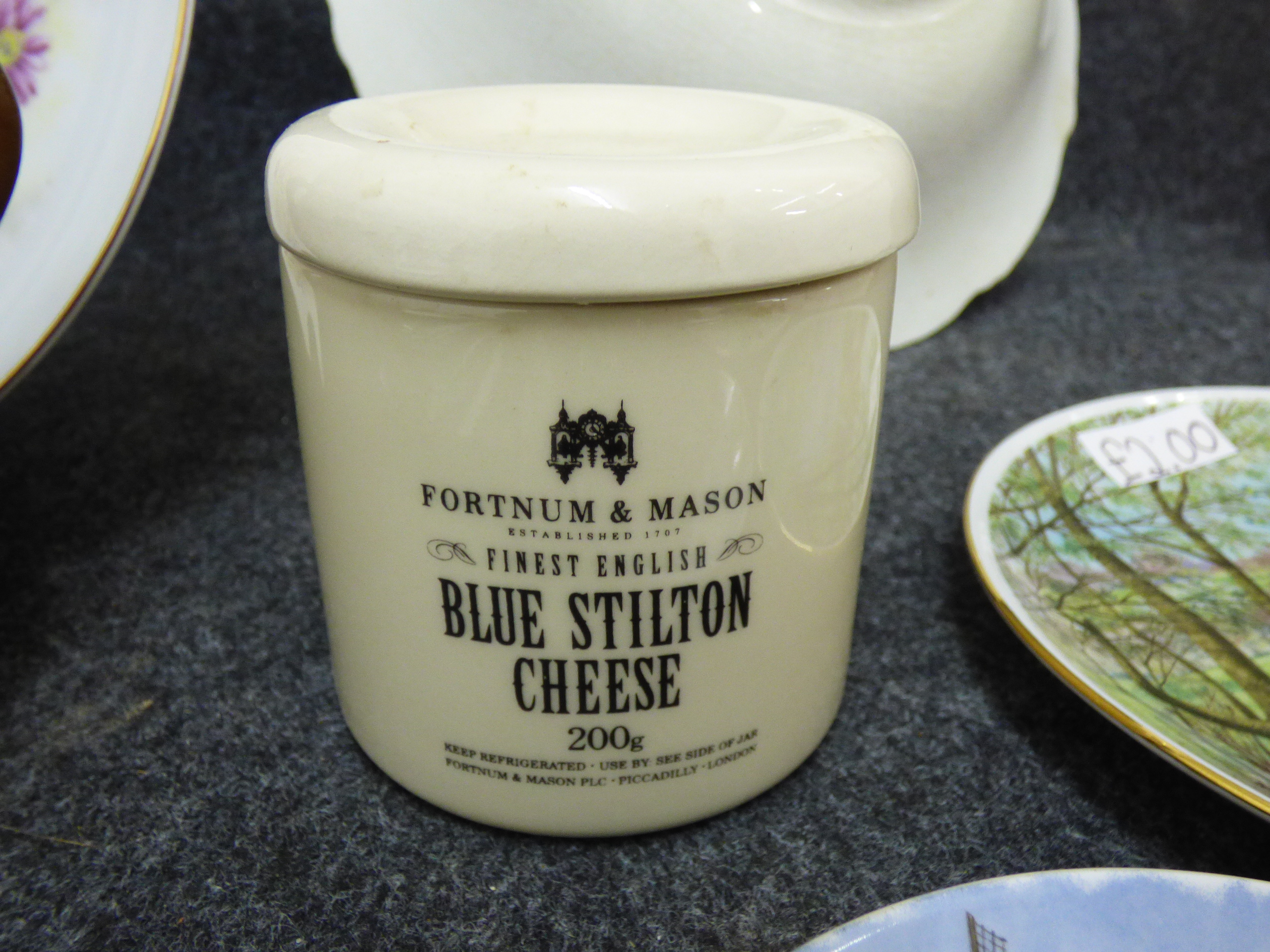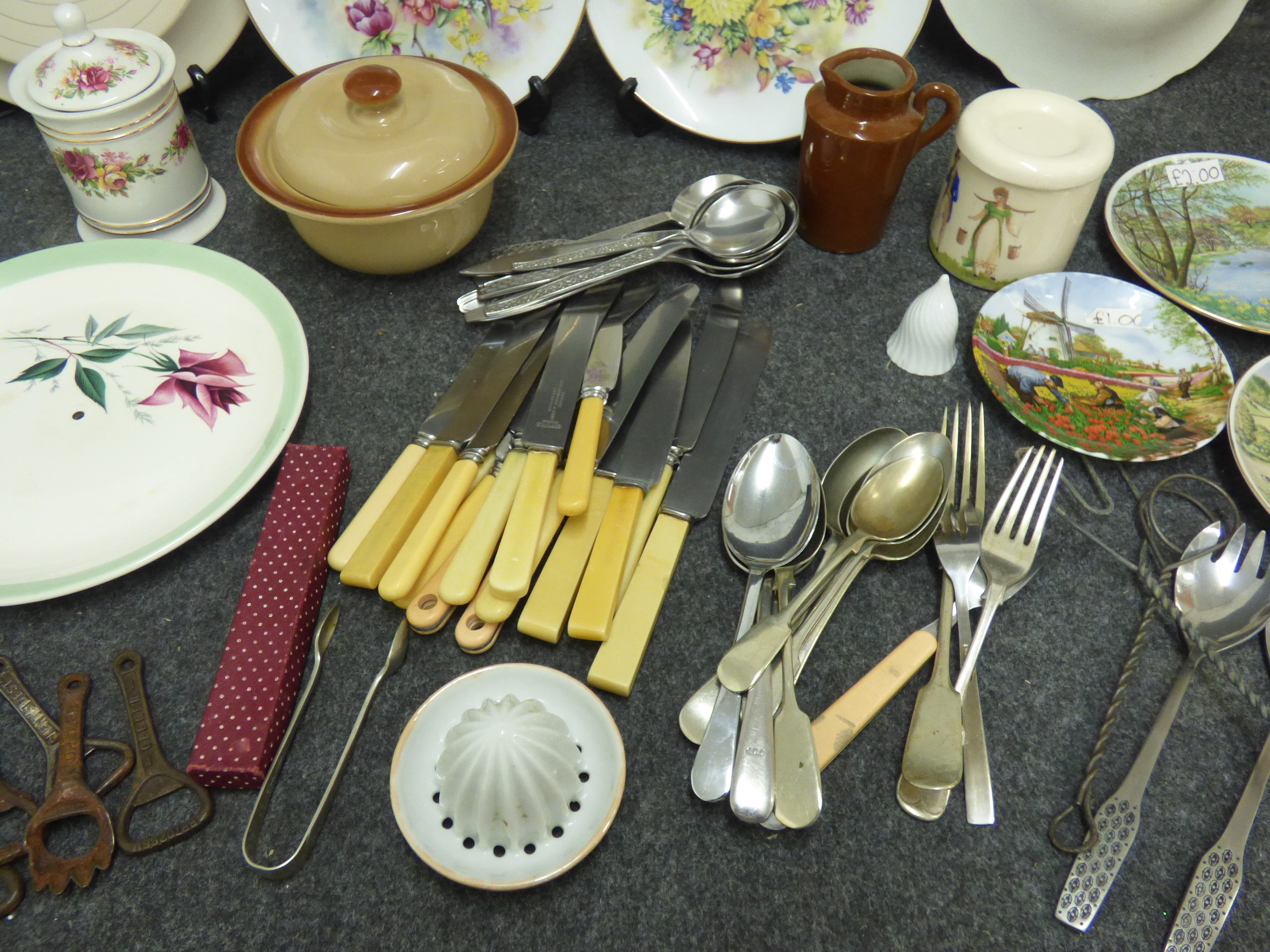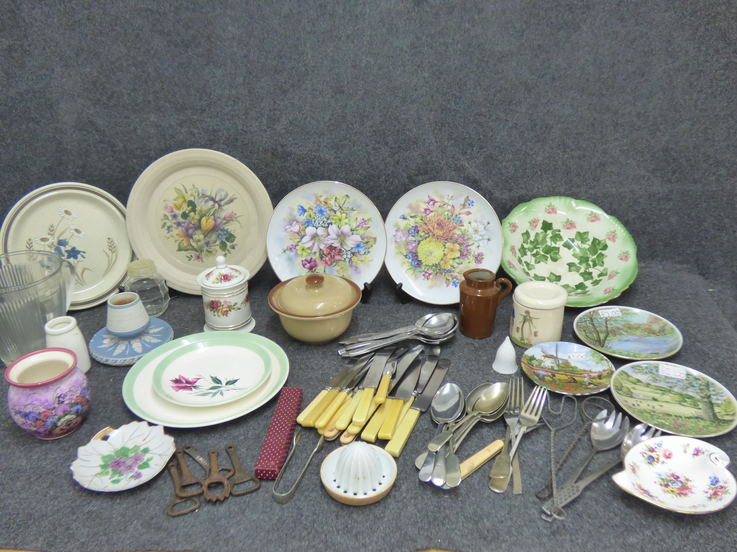 A collection of miscellaneous kitchenware and tableware in various colours including items marked Hornsea England, Ridgways England, Hammersley & Co, and a Fortnum & Mason cheese jar, together with assorted cutlery and kitchen tools.
