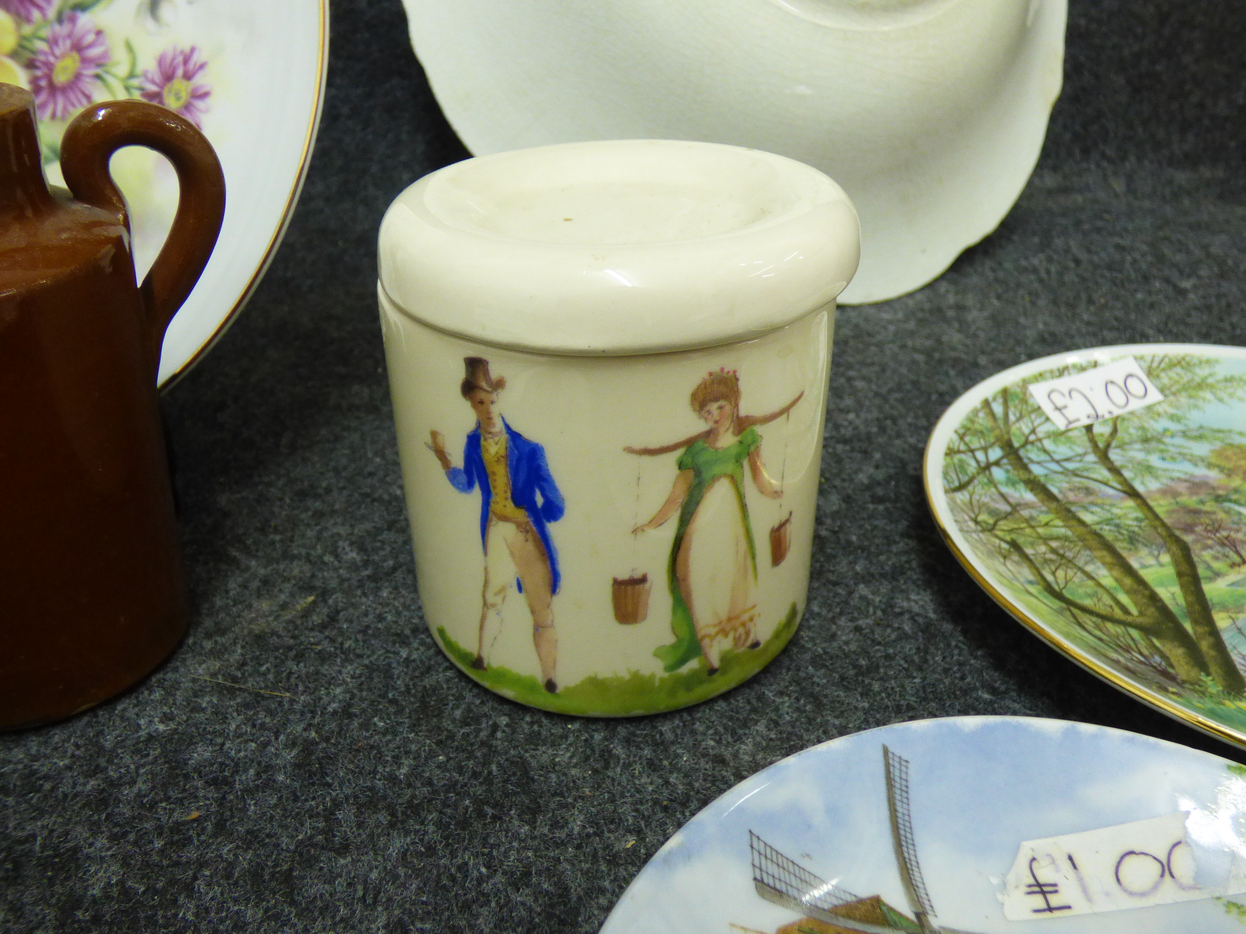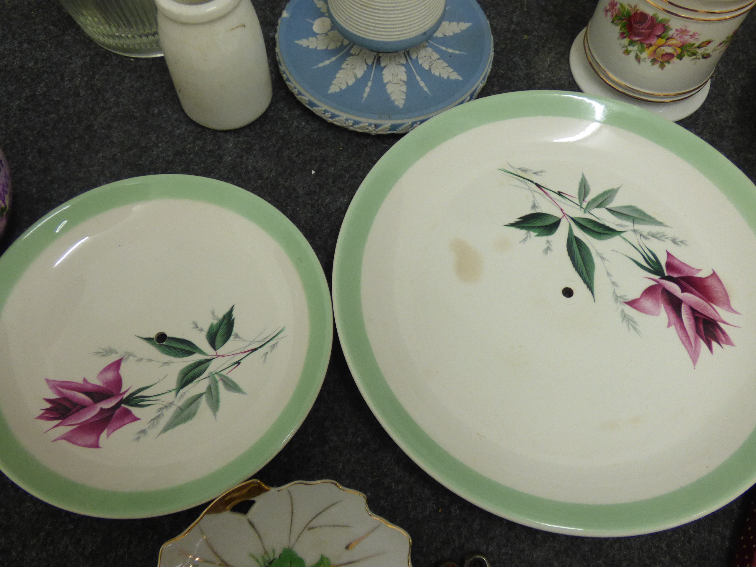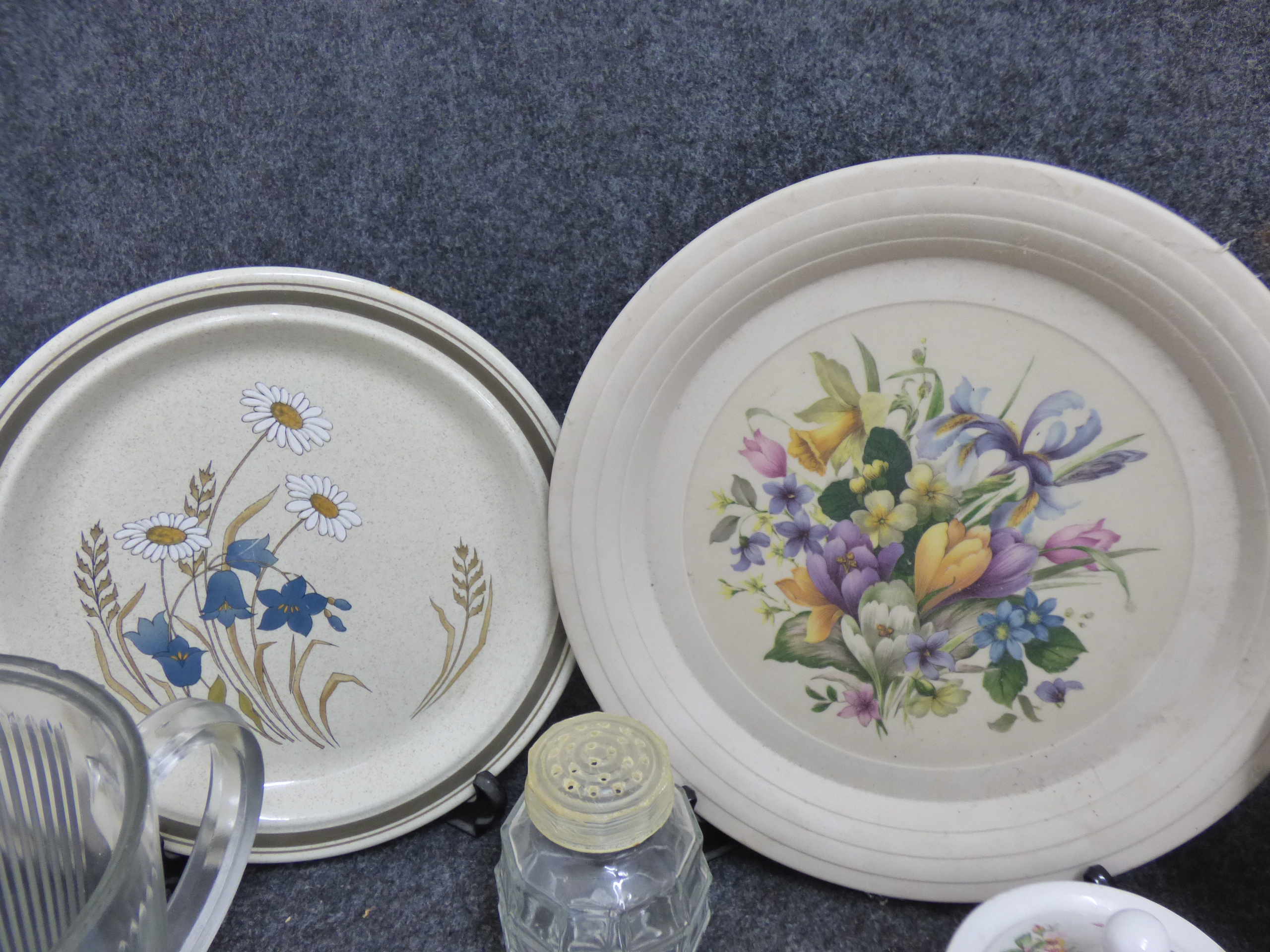 A collection of miscellaneous kitchenware and tableware in various colours including items marked Hornsea England, Ridgways England, Hammersley & Co, and a Fortnum & Mason cheese jar, together with assorted cutlery and kitchen tools.