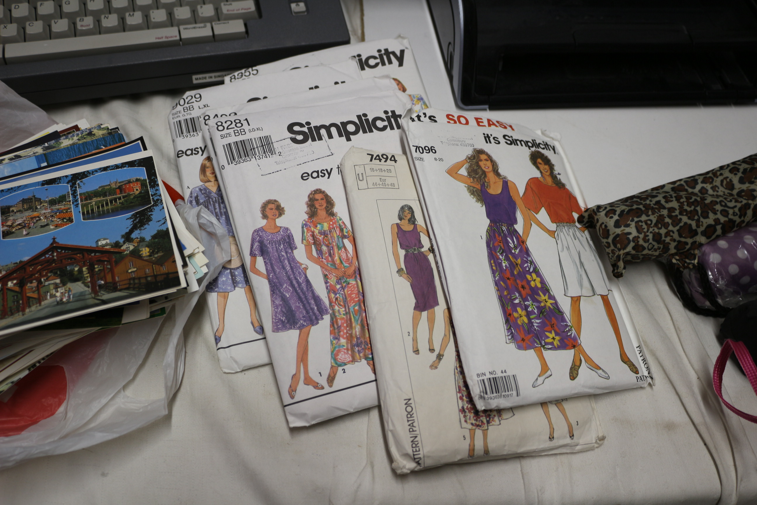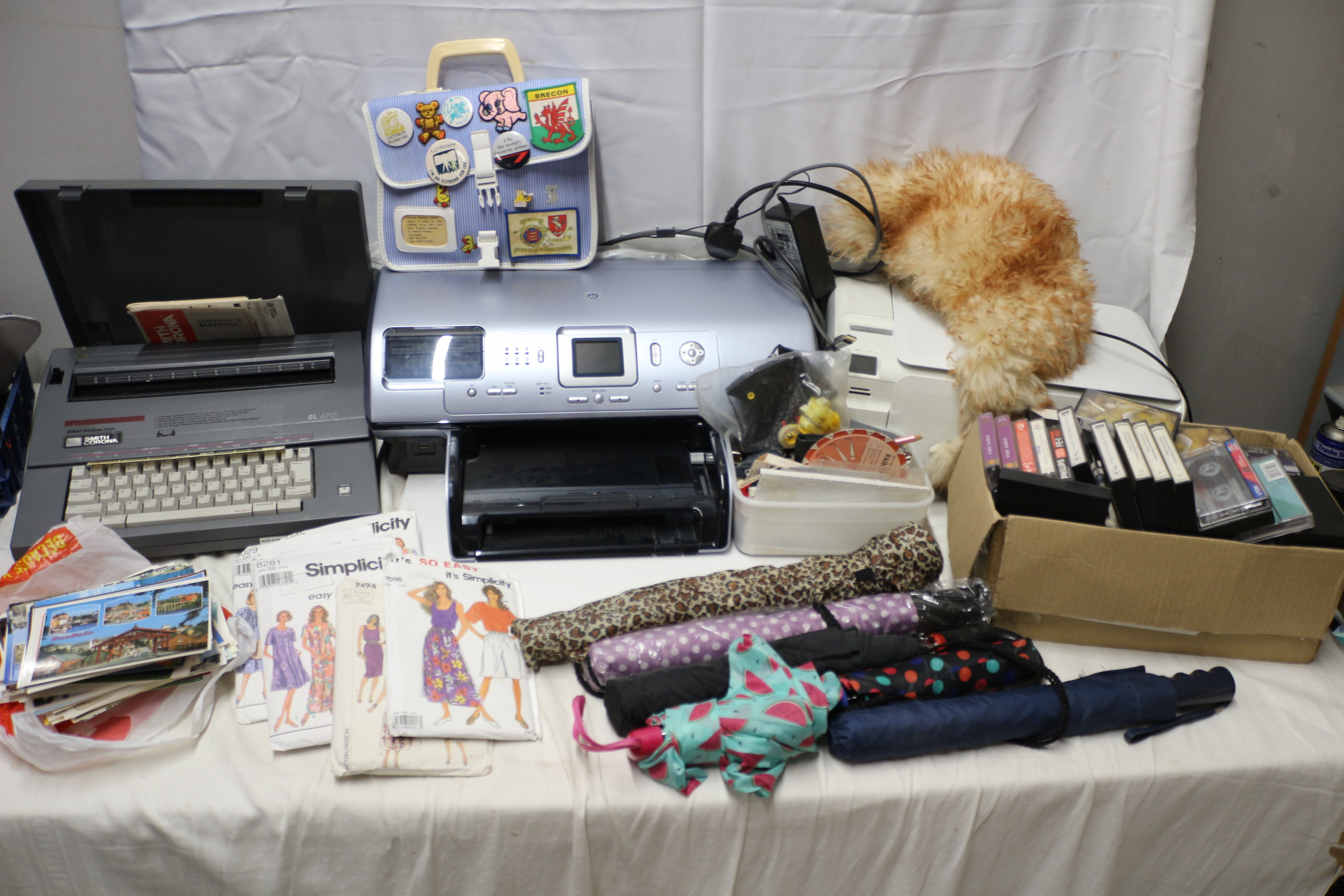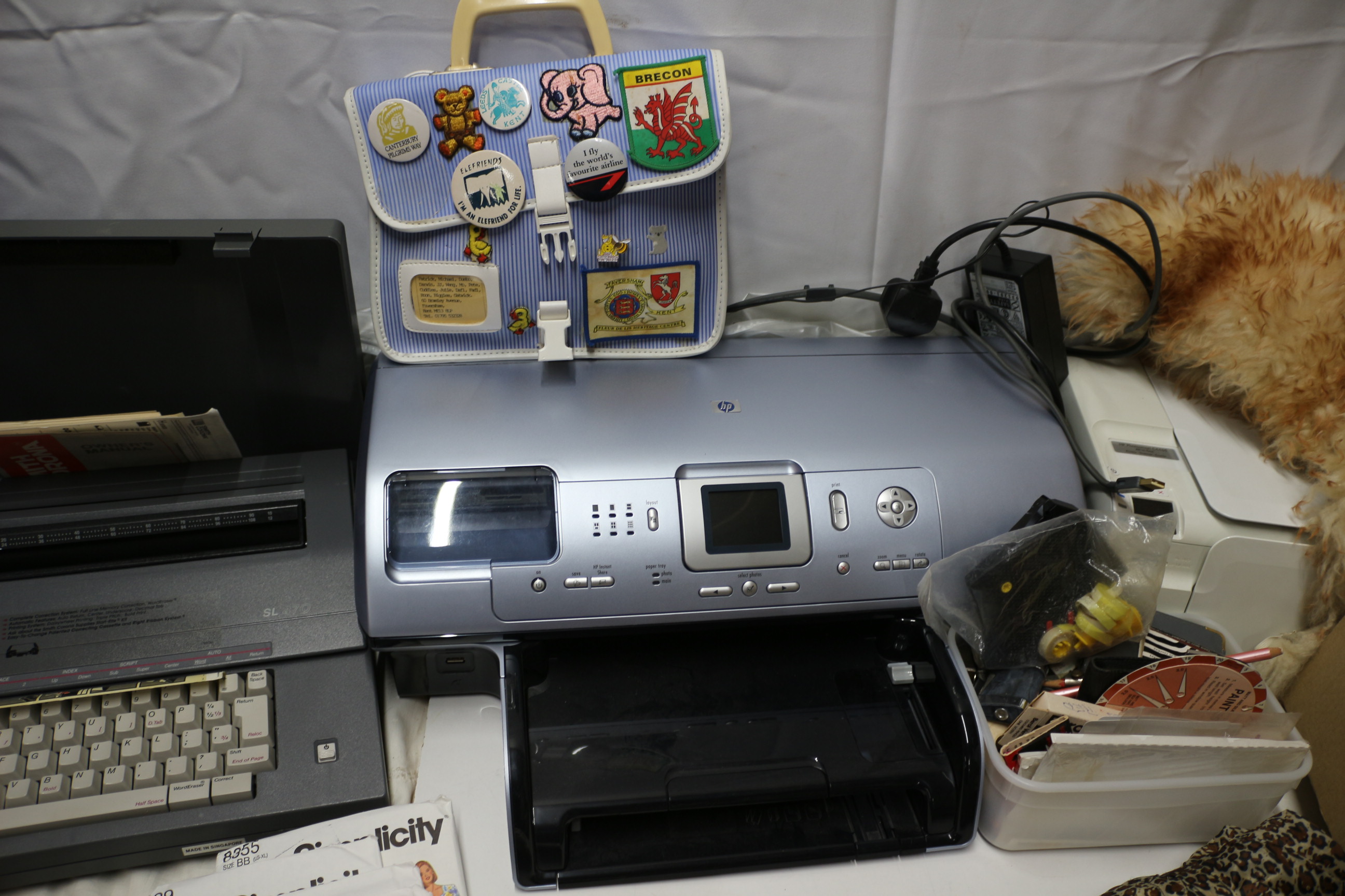 Lot includes typewriter, 2x printers, cassettes, postcards, satchel with teddy bear outfits and more