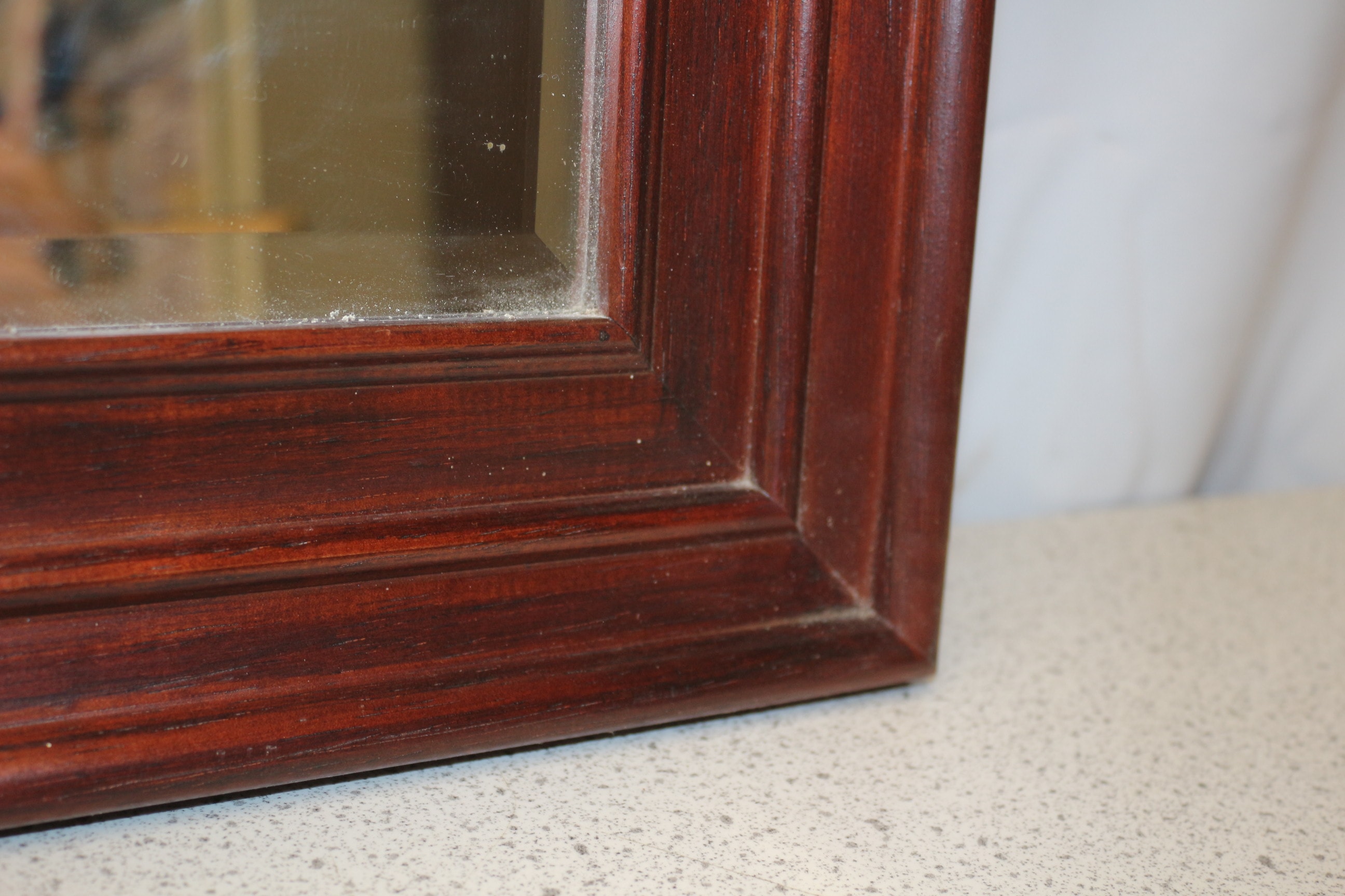 A rectangular bevelled edge mirror with a dark reddish-brown wooden frame. 57.5 75cm