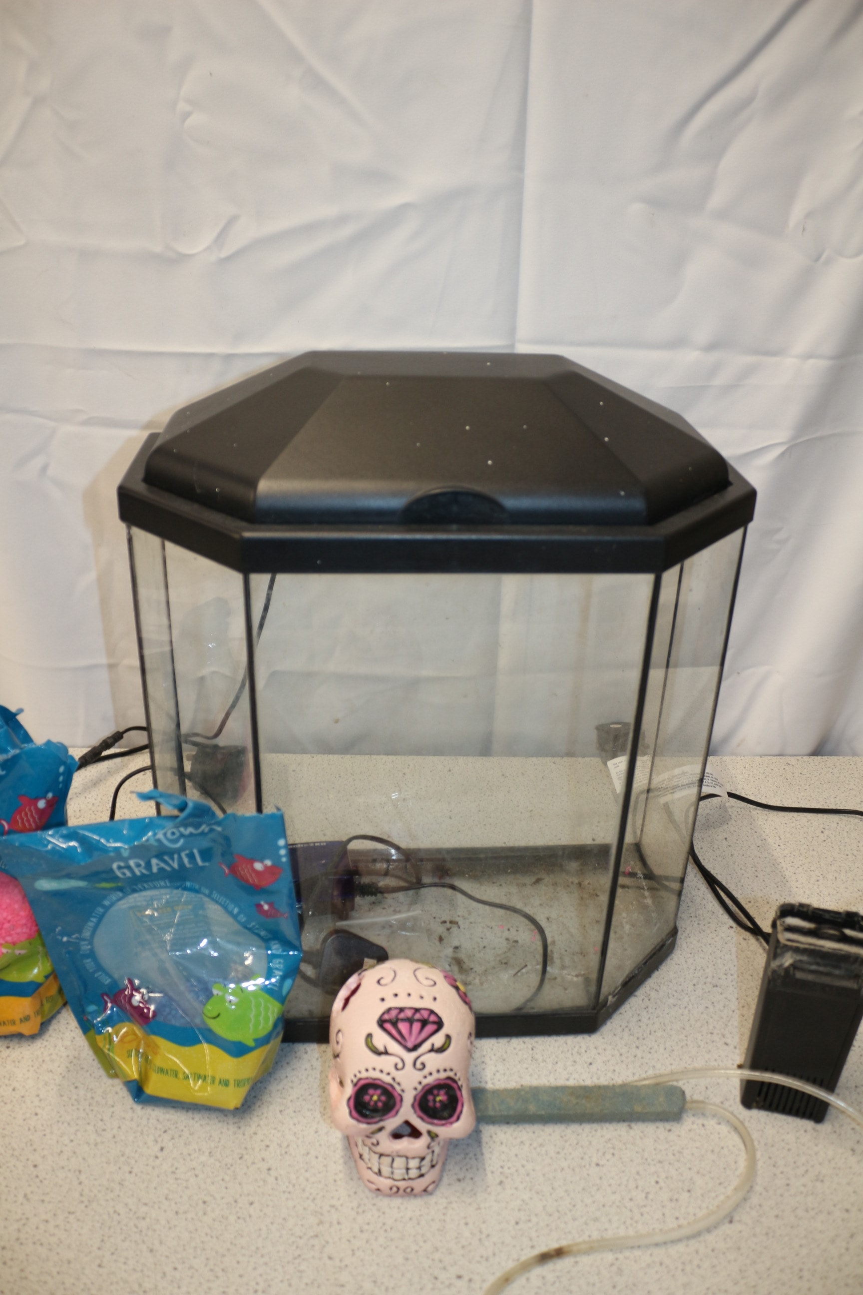 An octagonal glass fish tank with a black lid, two bags of Aquatown GRAVEL, a pink sugar skull decoration, a black aquarium filter, and a grey air stone with clear tubing. Untested