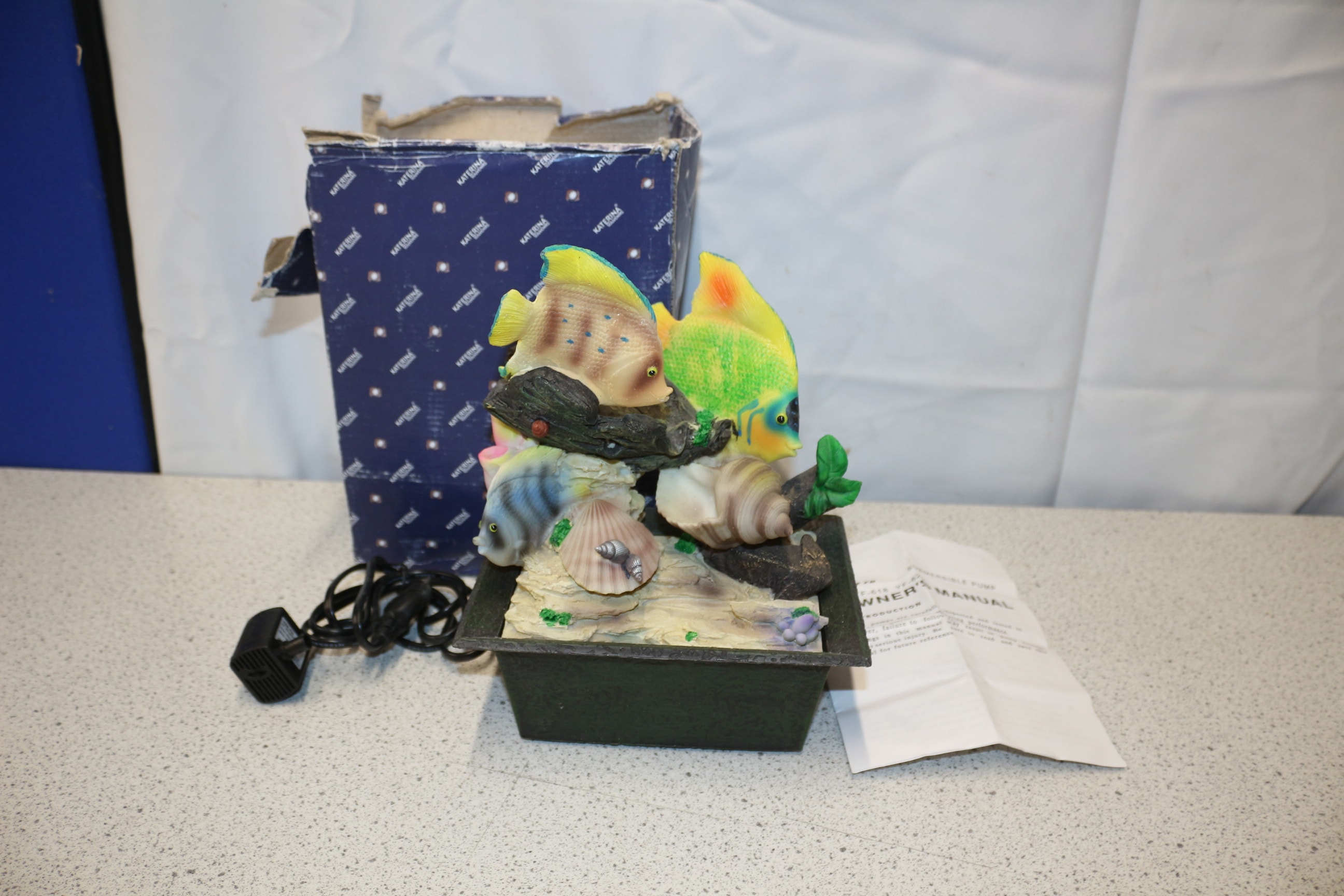 A decorative fish tank fountain with three multi-coloured fish (yellow, green, blue) and natural-coloured seashells on a sand-coloured base, accompanied by a black power adapter, a KATERNA branded box, and an owner’s manual for a pump. Untested
