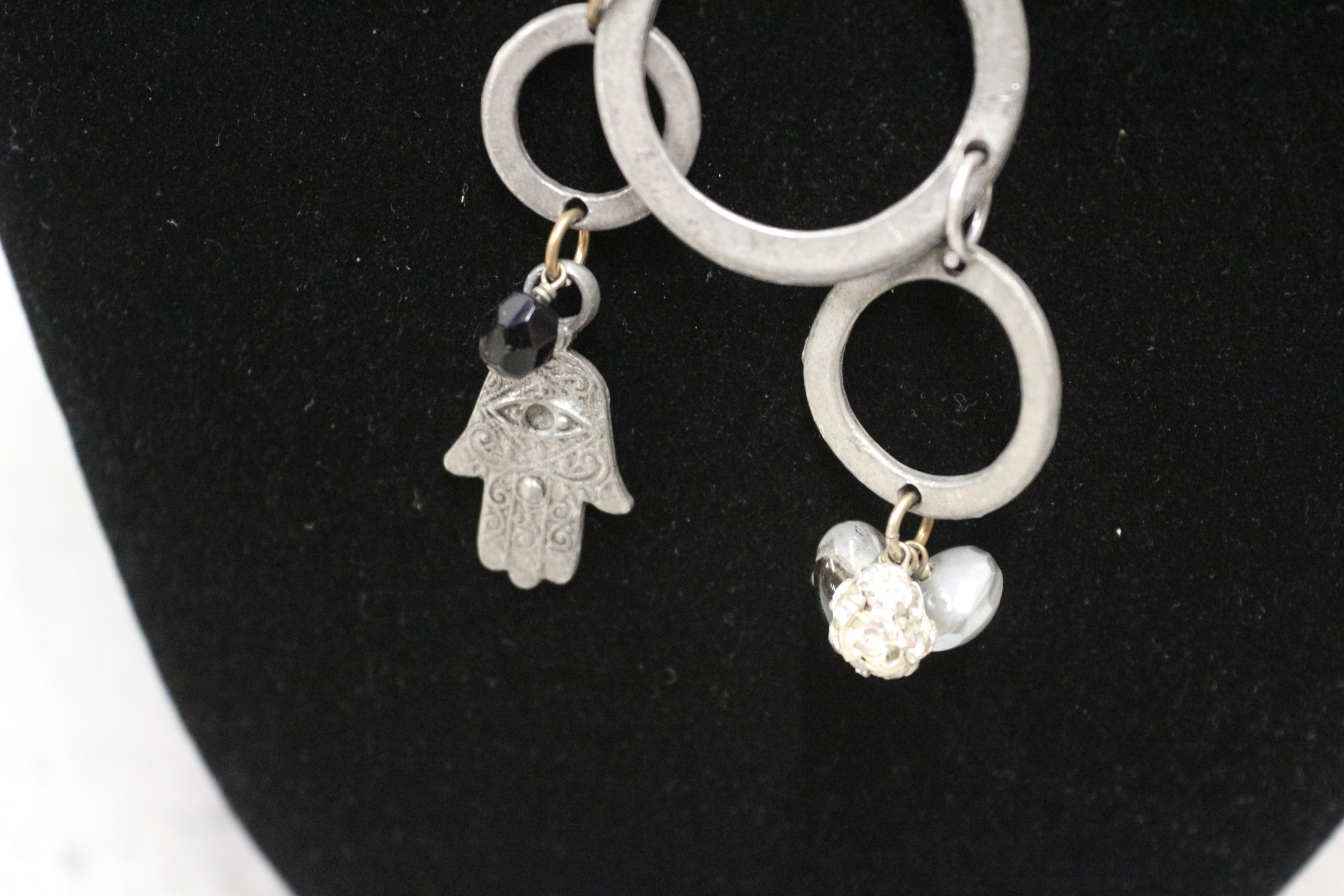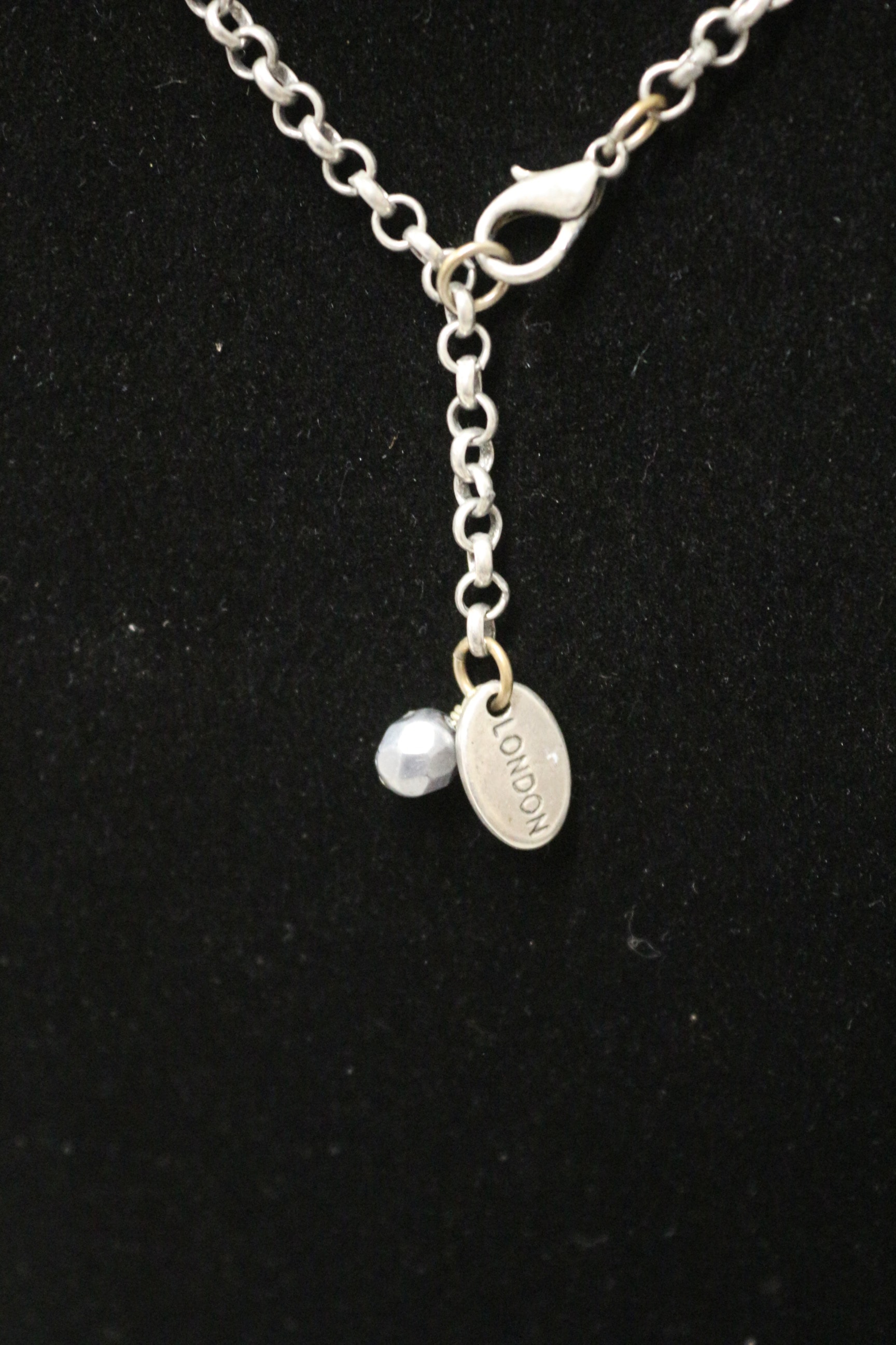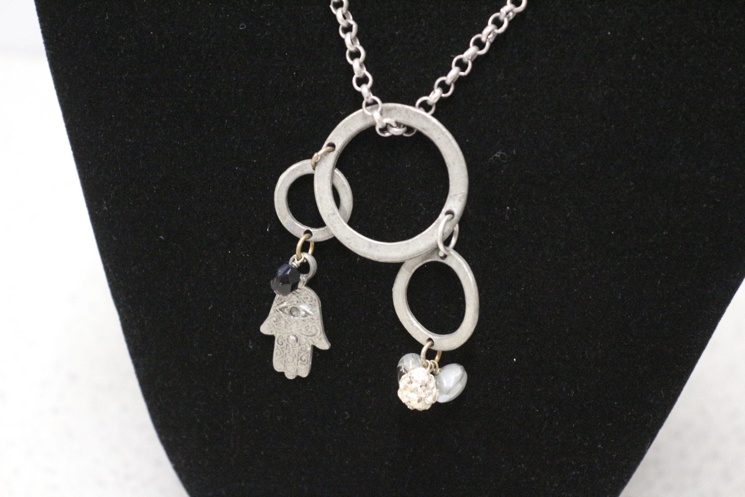 A silver-toned necklace features a pendant with three interconnected rings, a Hamsa hand charm with a black bead, a charm with clear faceted and grey heart-shaped beads, and an oval tag inscribed “Jamie” and “LONDON”.
