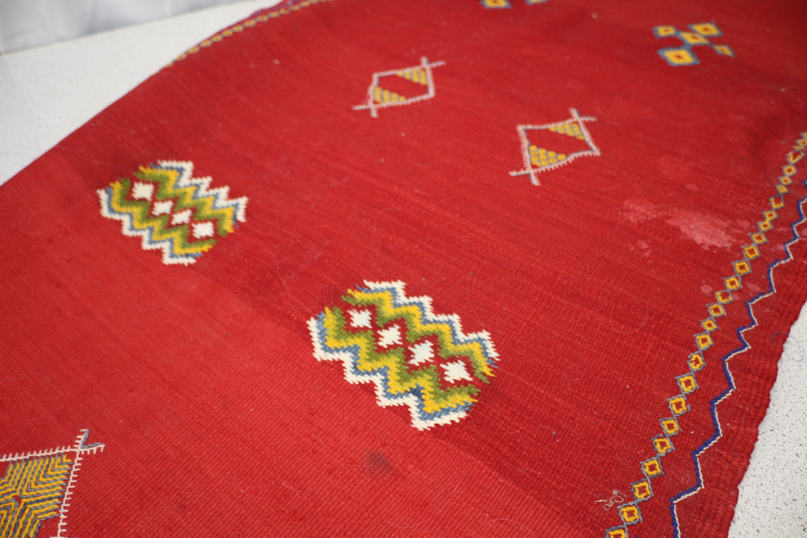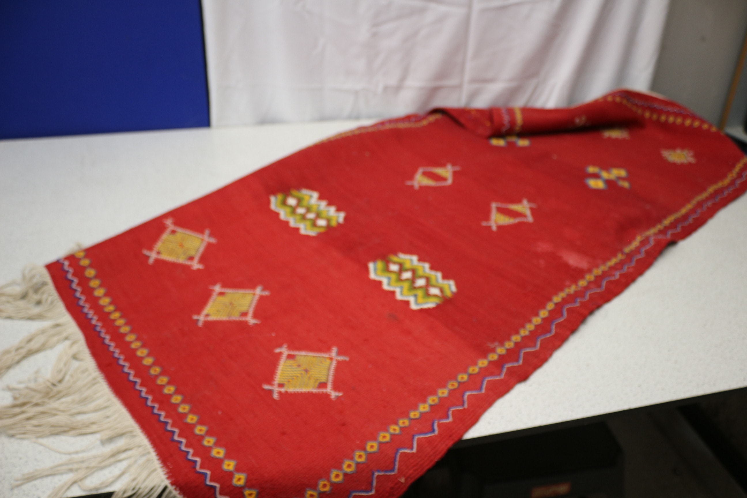 A predominantly red textile rug with white fringe and colourful geometric patterns in yellow, green, blue, and white. (AF) 161x78cm