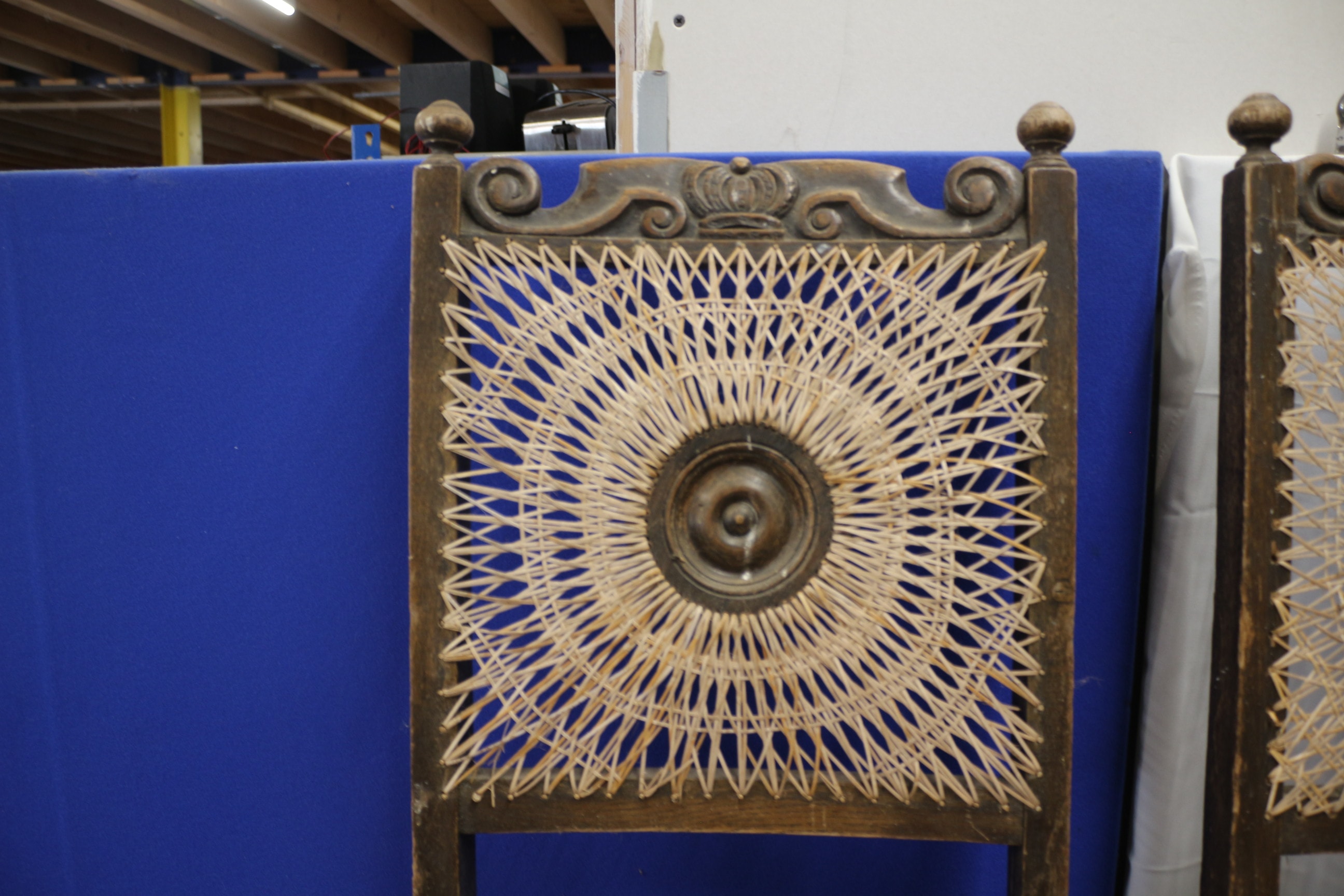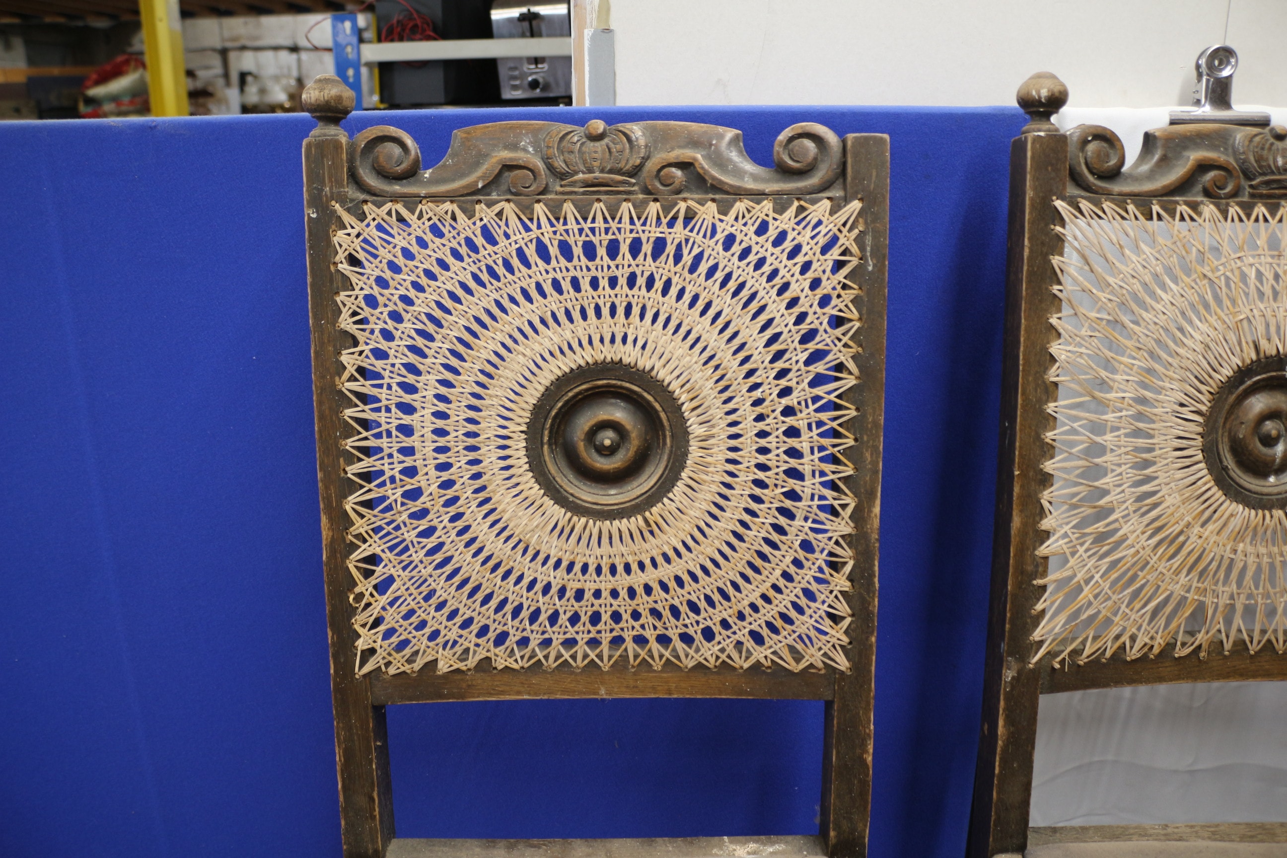 A set of four French Oak Breton Styled chairs with carved dark wood frames, woven cane backs featuring a central medallion, and upholstered seats. AF
