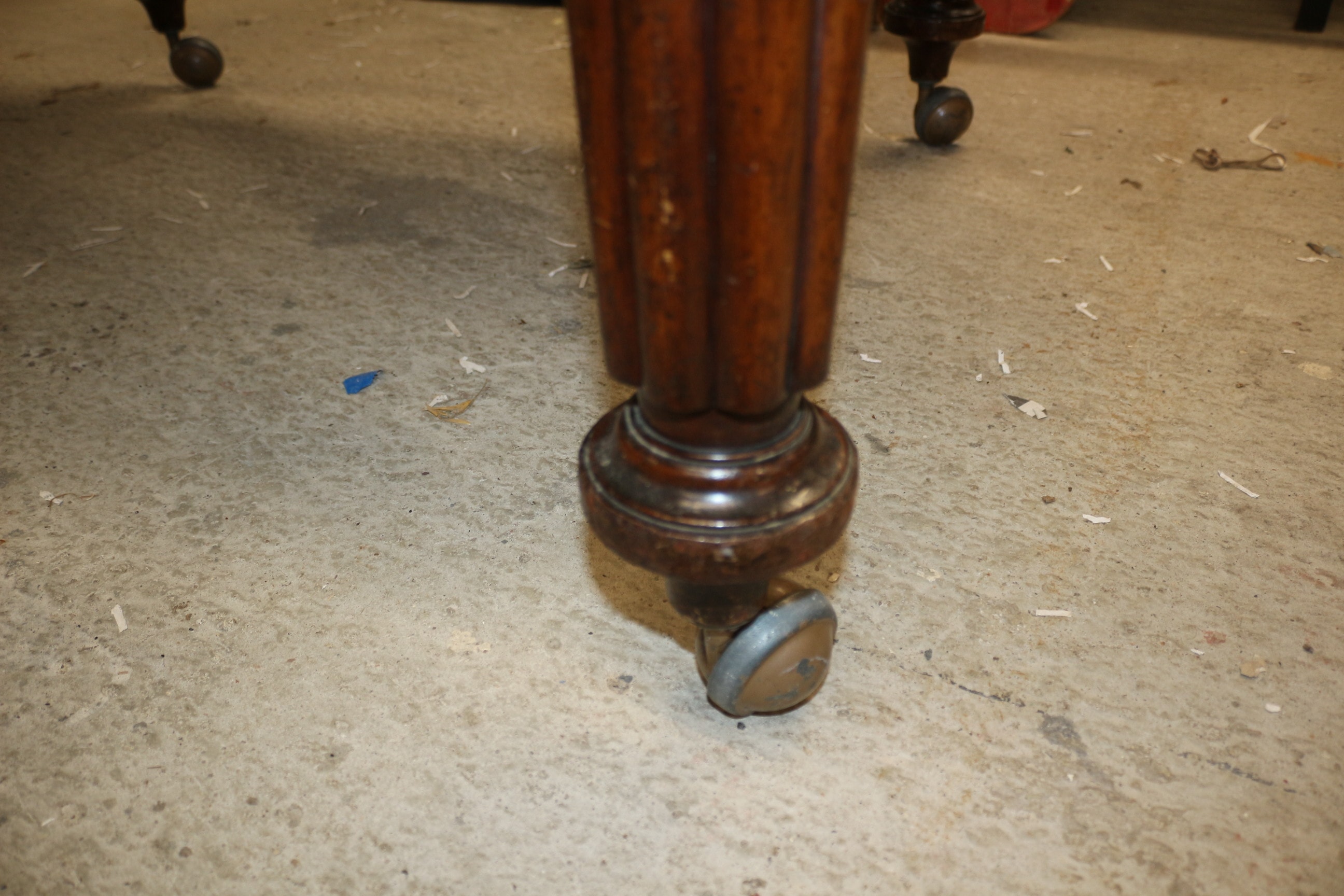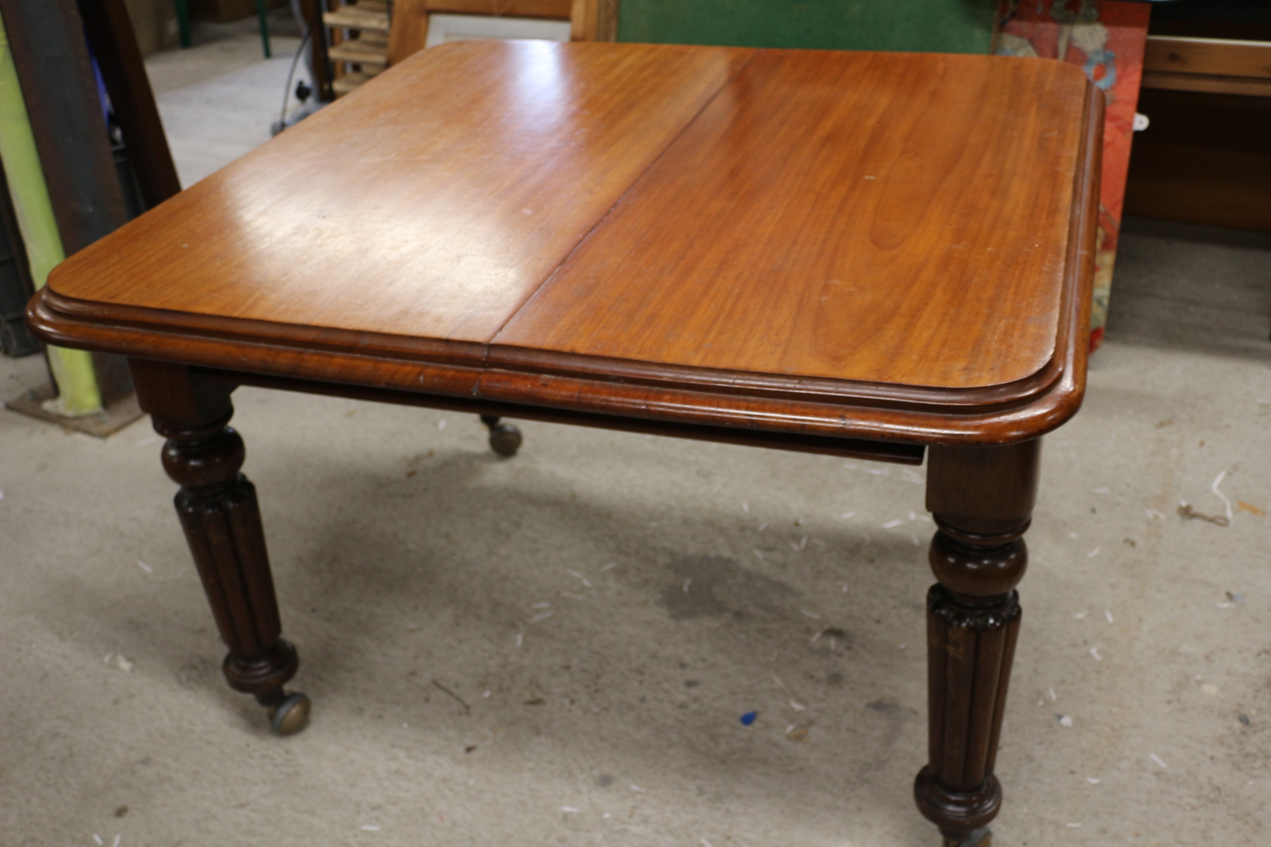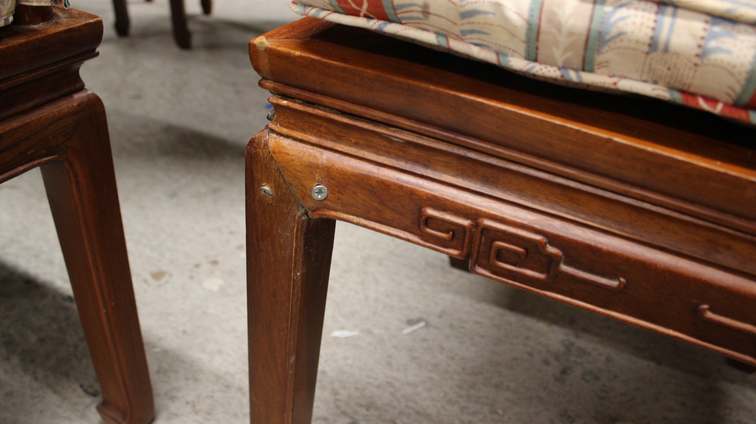 An extendable Early Victorian age wooden dining table with turned legs in a reddish-brown finish with central extension sections, accompanied by eight matching wooden dining chairs in reddish-brown, featuring carved “Shou” character motifs on their backrests and geometric “leiwen” patterns on the aprons, with cream-coloured cushions displaying blue and red striped patterns. Some chairs have had a basic repair. Extended 207x 115cm