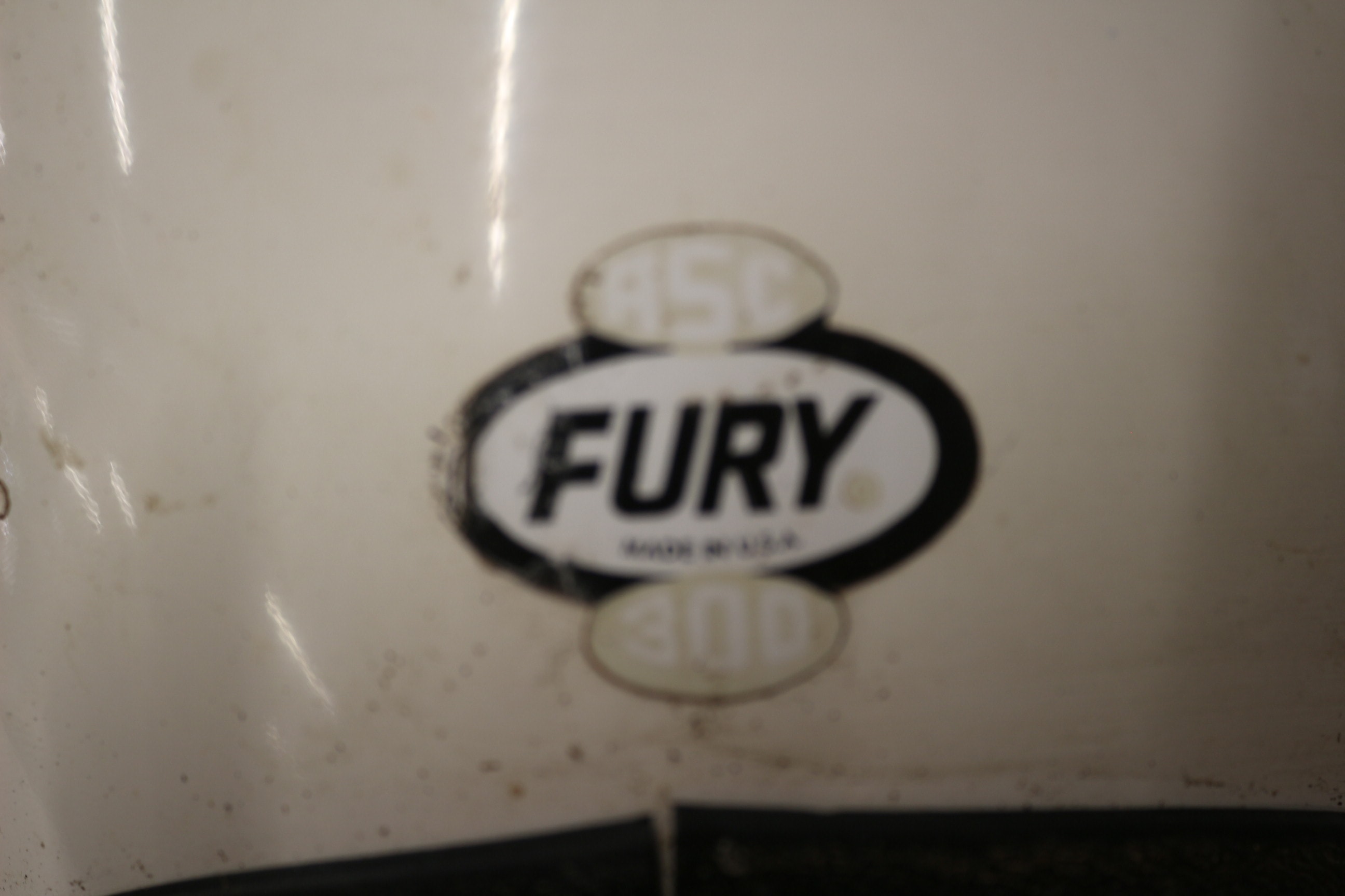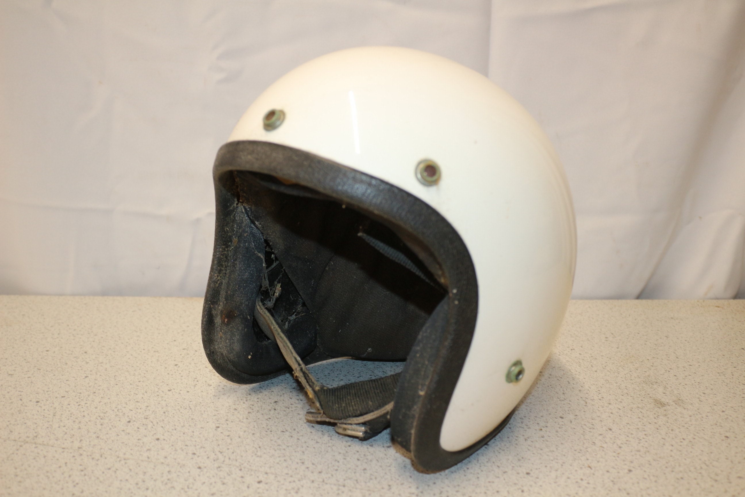 A 1970’s white and black open-face helmet with a label on the back reading ‘ASC FURY 300 MADE IN USA’. AF