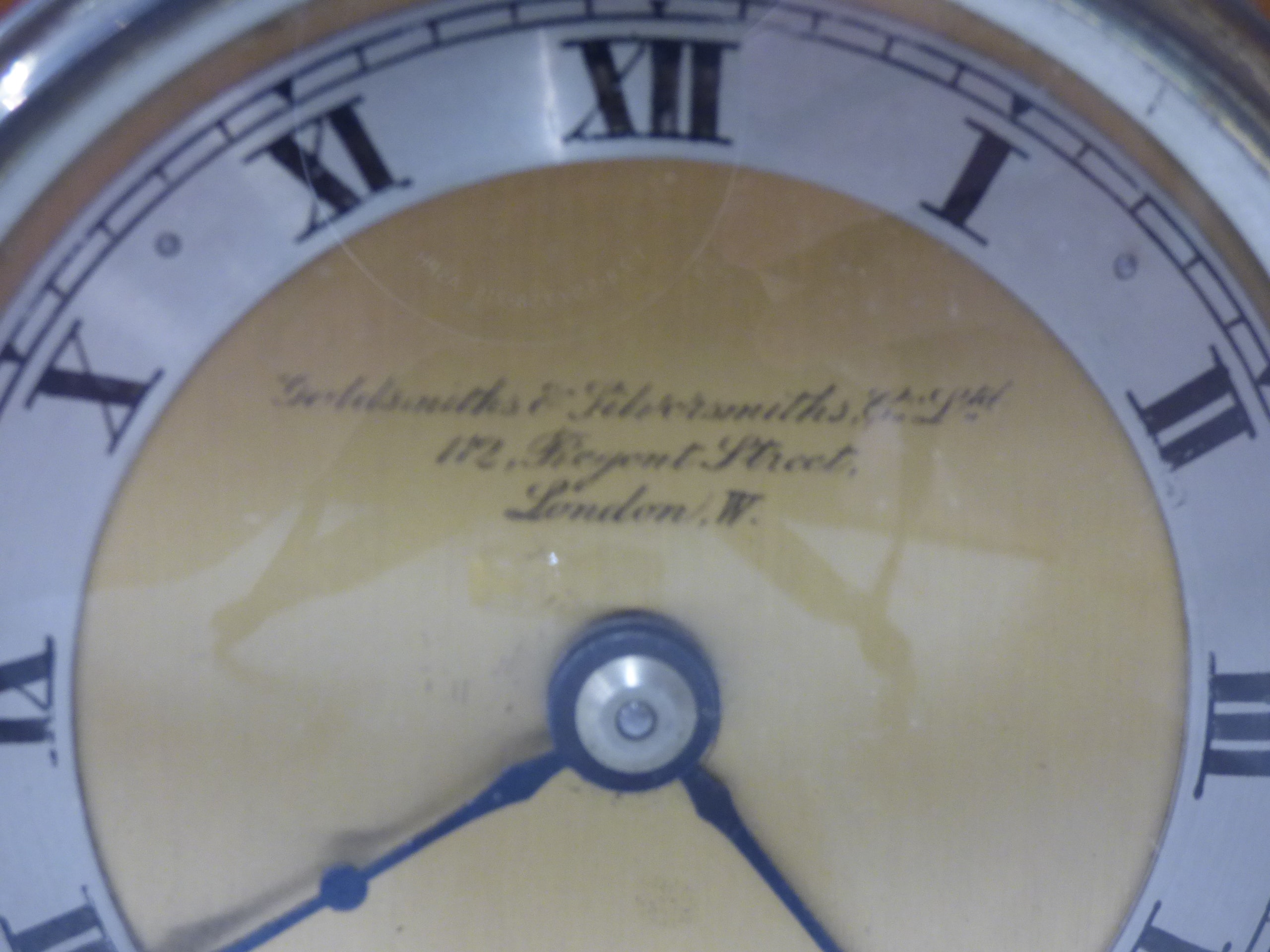 A brown wooden mantle clock with a gold face and silver bezel, inscribed ‘Goldsmiths & Silversmiths Co Ltd, 112, Regent Street, London. W.’ on the dial. 26.5cm Wide