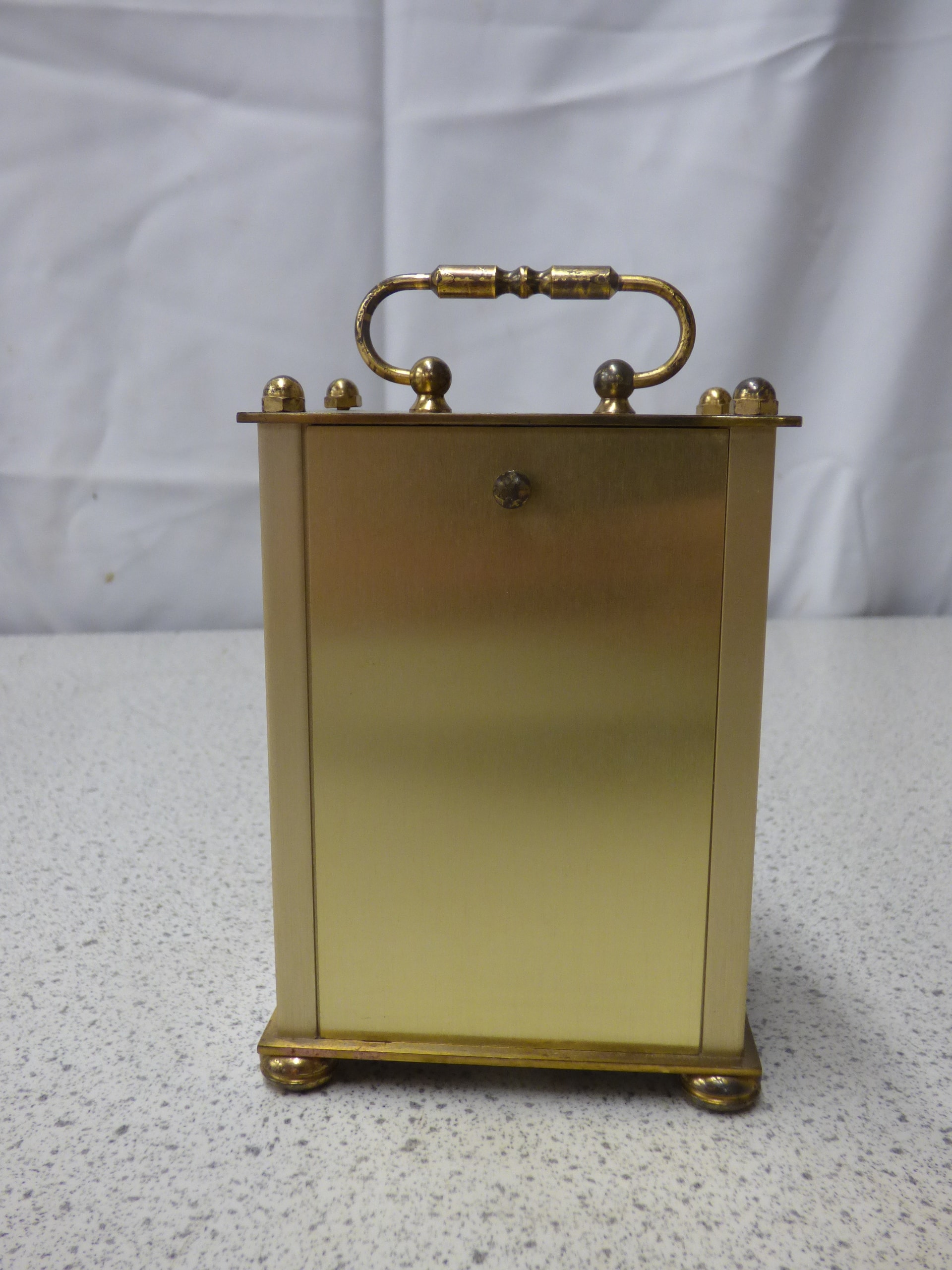 A gold-coloured carriage clock features a brushed metal face with Roman numerals, minute markers, a fleur-de-lis symbol, and is inscribed ‘GERMANY’ and ‘QUARTZ’.