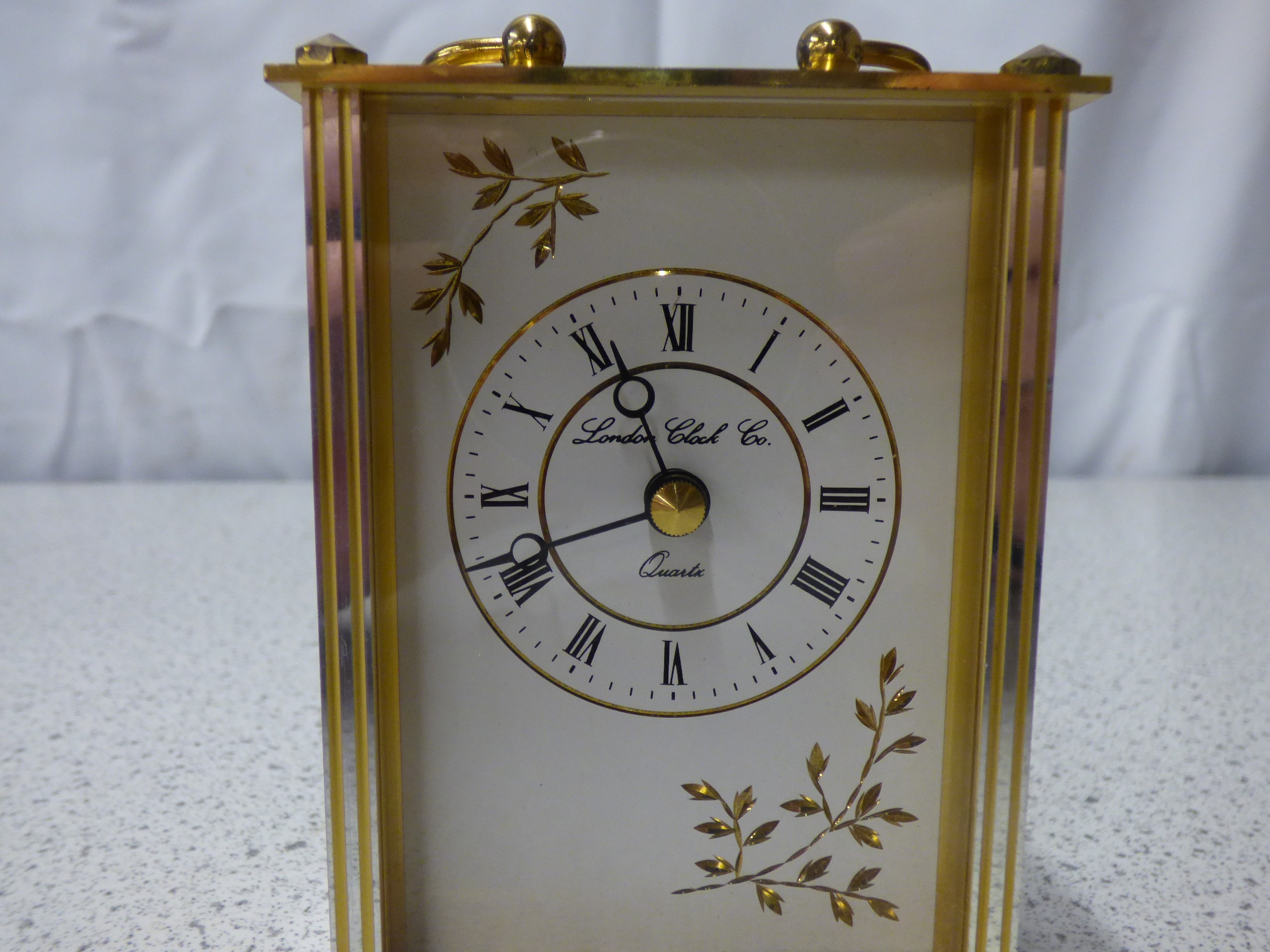A gold-toned carriage clock with a white face featuring Roman numerals, gold-leaf accents, and visible text “London Clock Co.” and “Quartz”.