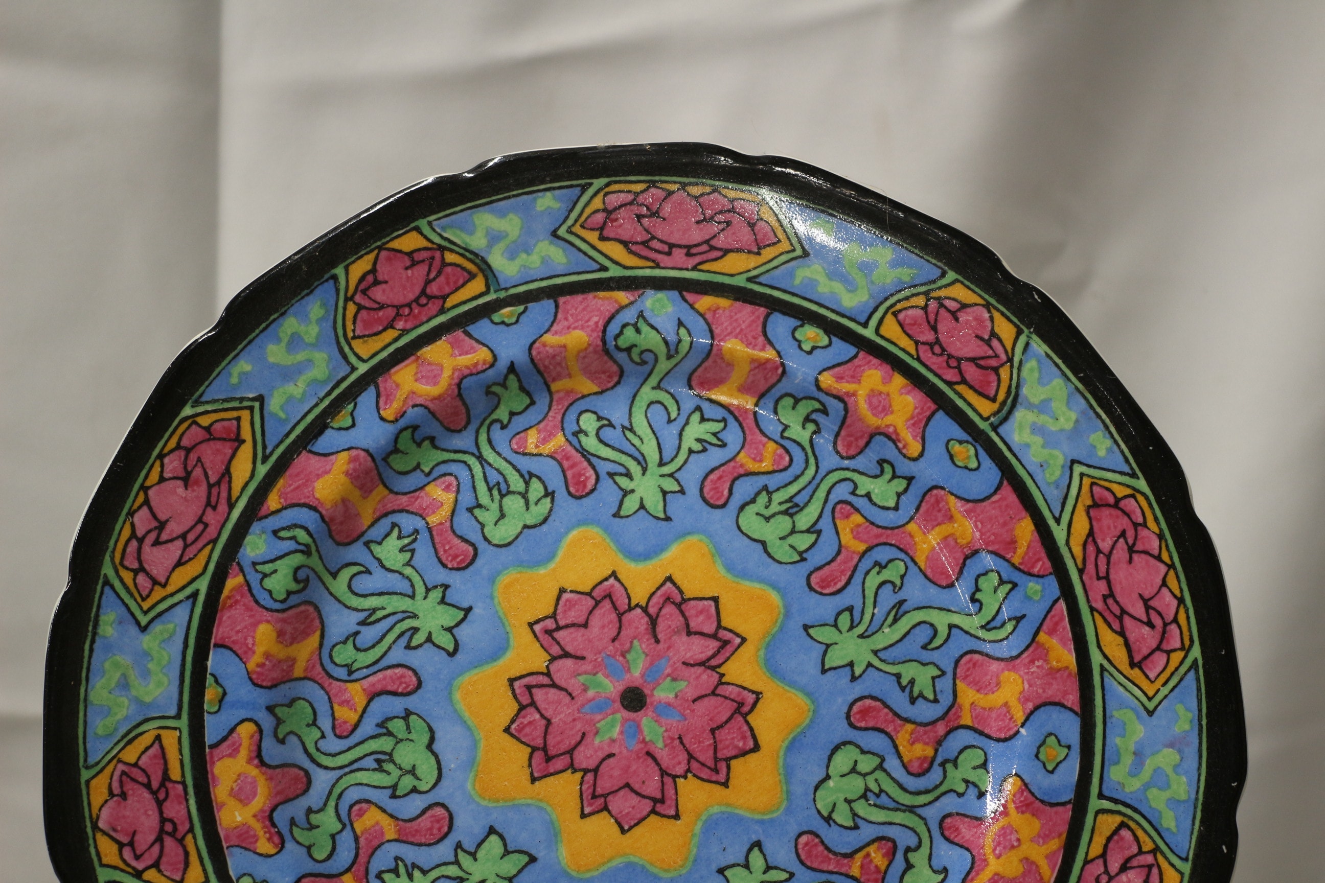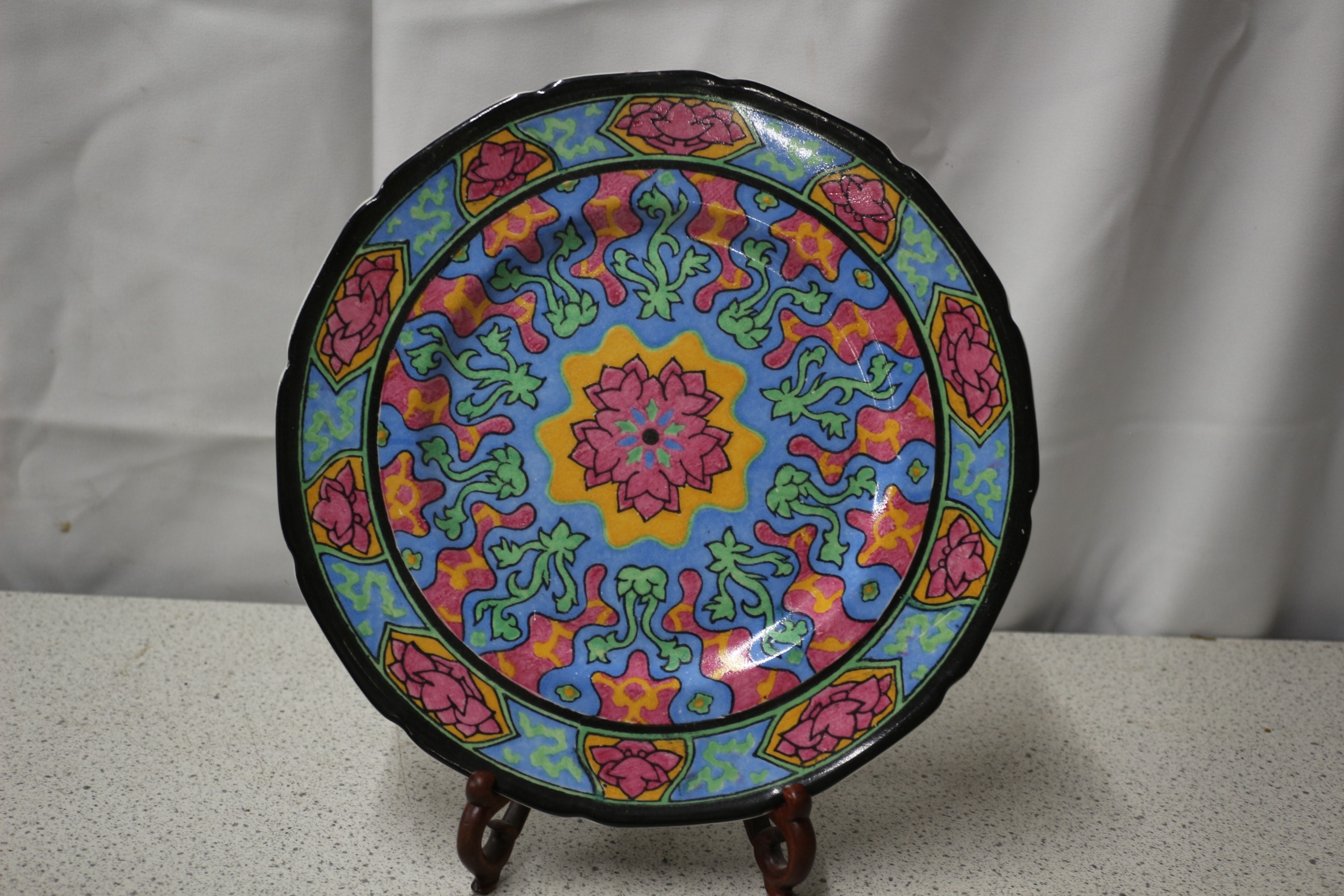 A multi-coloured Rosette decorative plate, primarily blue, pink, yellow, and green with a black rim, bearing a green ‘ROYAL DOULTON ENGLAND’ backstamp with a lion and crown, and the number ’11’ in black below it. 10.5″