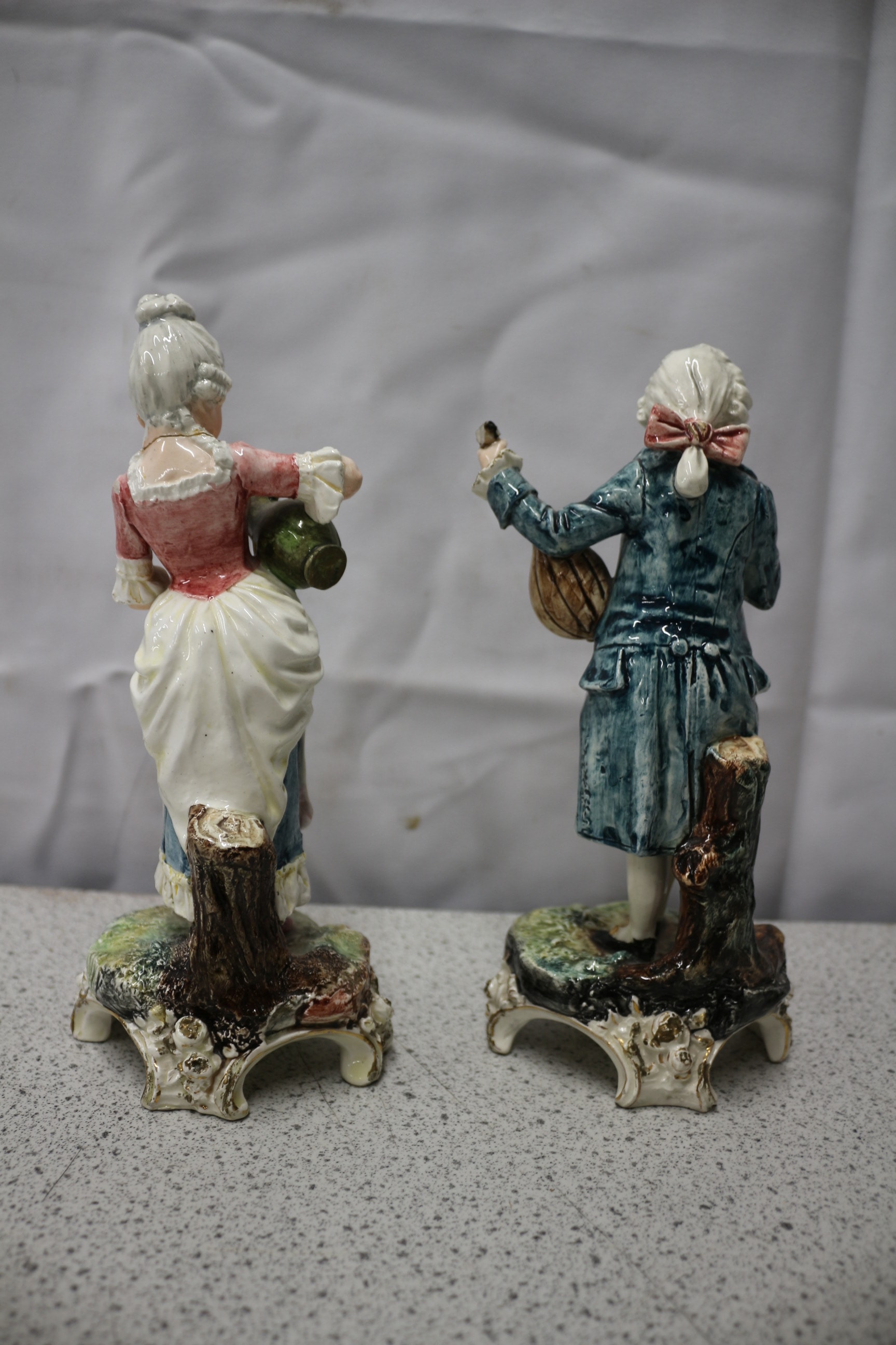A pair of porcelain figurines depicts a woman pouring from a green jug and a man holding a mandolin, coloured white, pink, blue, green, and brown, with ‘4854 B’ on the woman’s base. 21.5cm tall. 1x AF