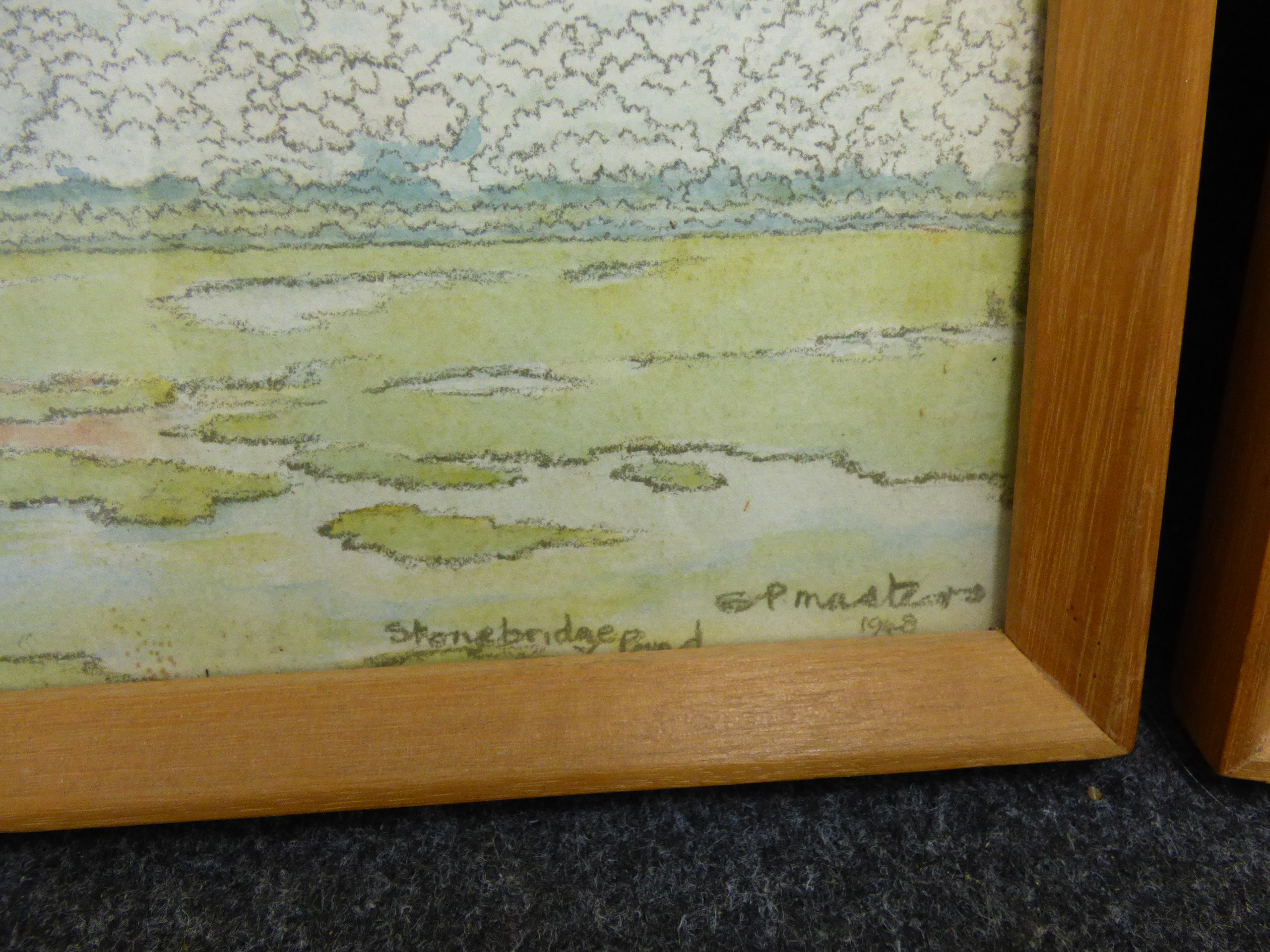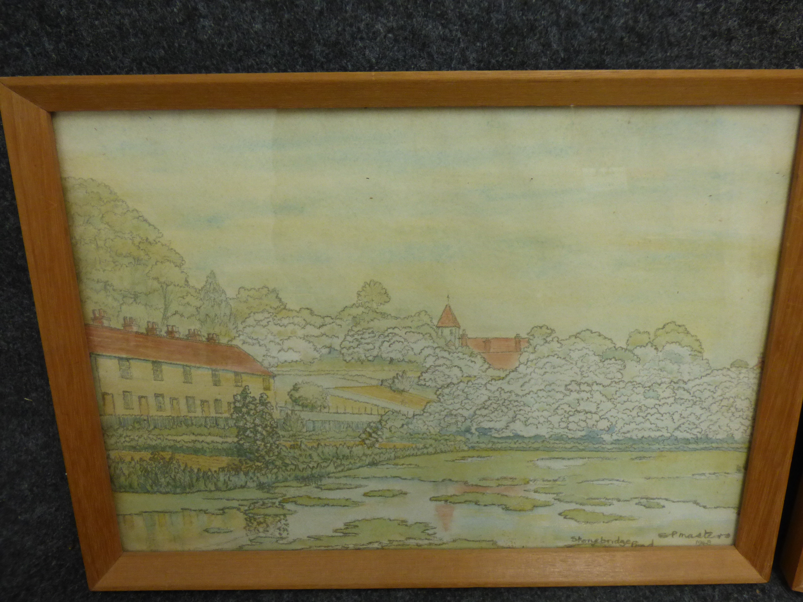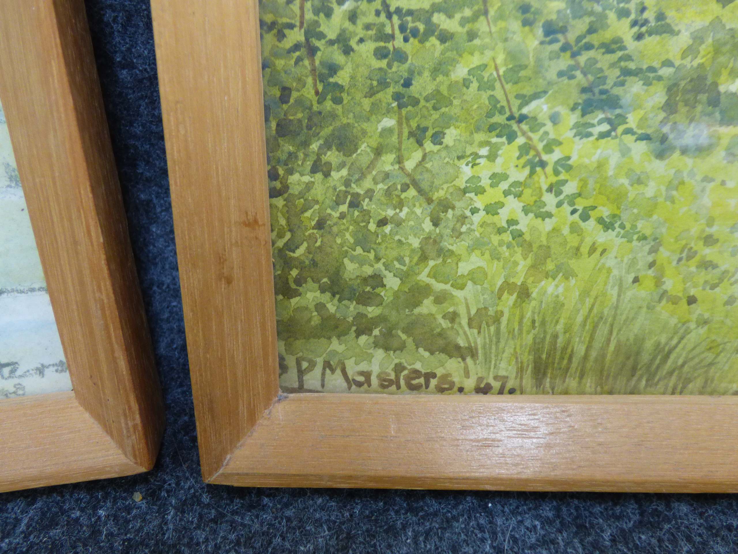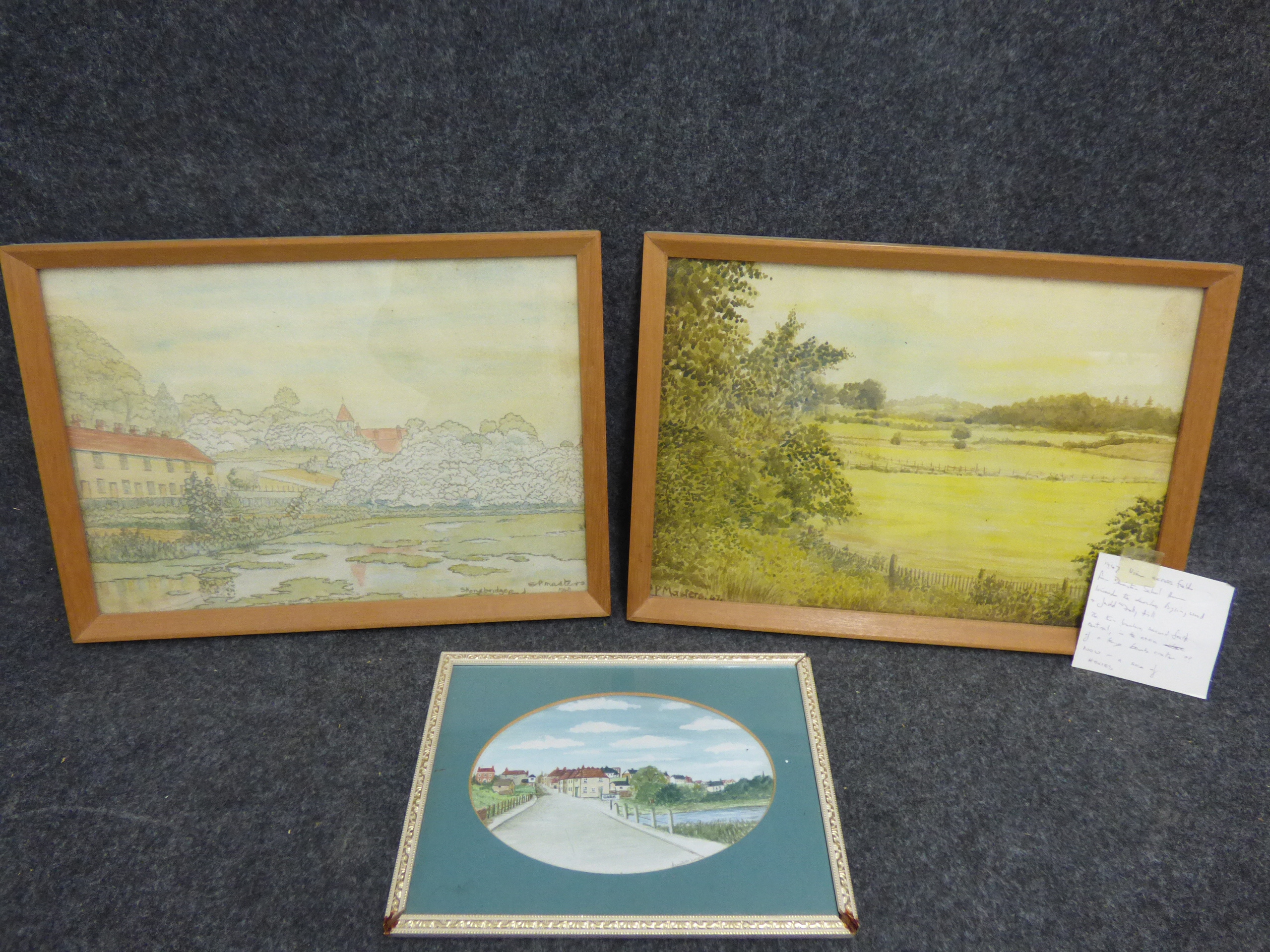A trio of framed landscape paintings including two pen and wash signed by P. Masters dated 1947 and 1948 and one oval-mounted scene signed by Annette Day. 2x 36.5×26.5cm 1x 24.5x19cm