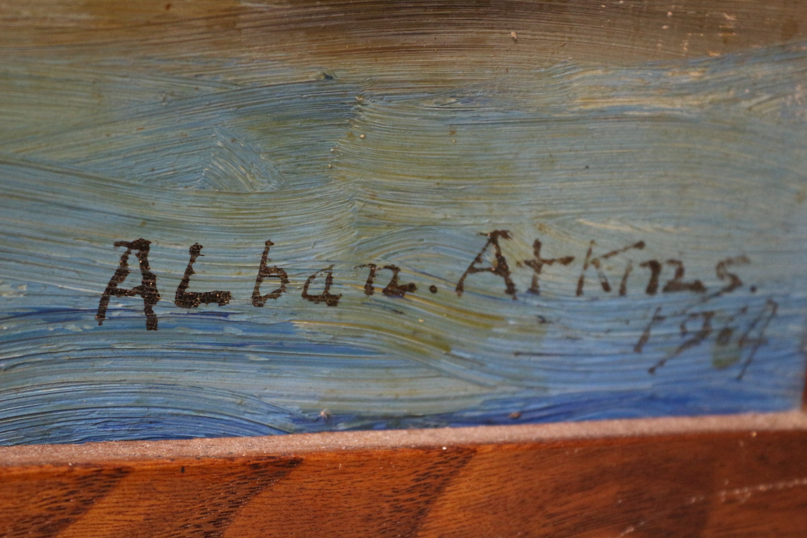 An oil painting depicting a farm landscape with two conical haystacks, a brown barn with blue doors, and another building with a red door, signed ‘Alban Atkins. 1964’. 110.5x141cm