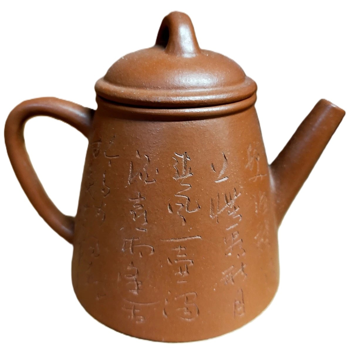 A Chinese Yixing Zisha stoneware teapot, unglazed reddish-brown, featuring a bulbous body, a short curved spout, a C-shaped handle, and a fitted domed lid with a loop finial. The exterior surface is extensively incised with Chinese calligraphy, including phrases such as ‘清泉活水煮’ (Qīngquán huóshuǐ zhǔ – ‘Clear spring living water boiled’) and ‘詩書畫印’ (Shī shū huà yìn – ‘Poetry, calligraphy, painting, seal carving’), suggesting a poetic or literati theme. The base bears an impressed square seal mark with stylized Chinese characters, likely a maker’s mark. Internally, a perforated filter is visible at the base of the spout. 11cm tall