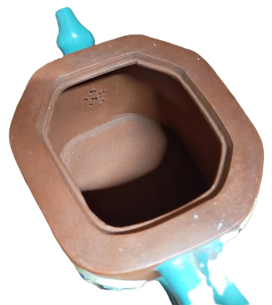 An antique Chinese Yixing zisha octagonal teapot, featuring an unglazed reddish-brown earthenware body. The handle, spout, and finial are sculpted in a naturalistic bamboo or branch-like form and are glazed in a vibrant turquoise. The body is further adorned with applied light green, pink, and blue polychrome enamel decorations depicting floral sprigs and a circular medallion with abstract motifs on one side. Internally, seven small perforations are visible behind the spout, serving as a tea strainer. The base bears an impressed square four-character seal mark, which appears to include the characters `葛順` (Gé Shùn), a name associated with Yixing potters. 10.5cm tall