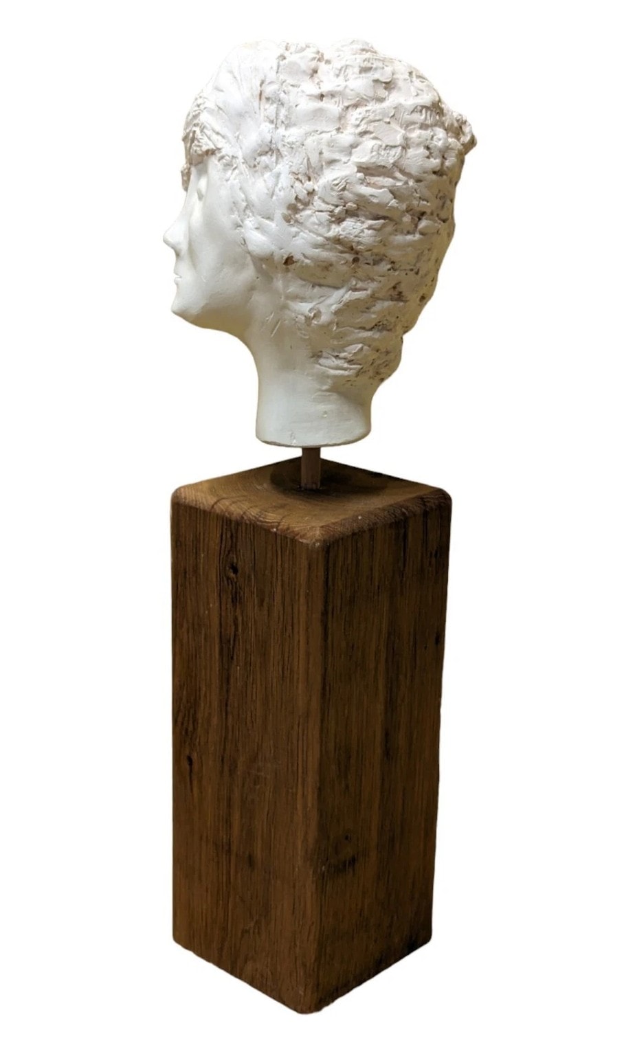 A modern sculpture by renowned artist, Sarah Huggett of Cornwall, depicting a female head with a serene expression and dynamically textured, wind-swept hair. The head is rendered in a matte off-white material, likely plaster, with a contrast between the smooth facial features and the rough, expressive surface of the hair. It is mounted on a tall, rectangular plinth crafted from natural, dark-stained wood, featuring prominent grain and a rustic aesthetic.