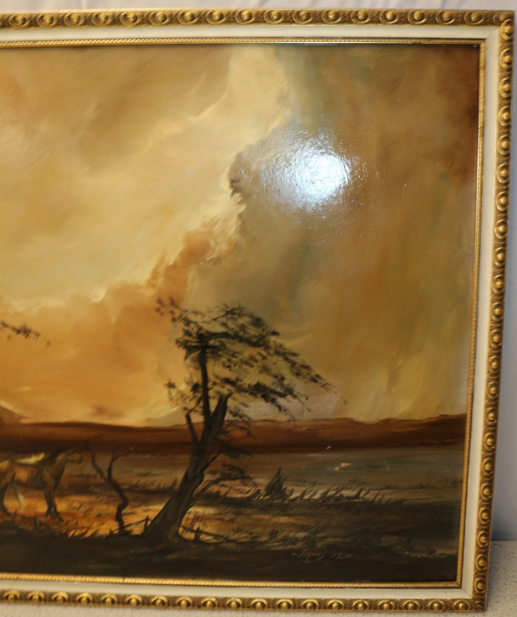 An oil painting on board, signed “Scanes. 69”, (possibly John Scanes?), in the lower right corner, depicting a dramatic landscape scene. The artwork features two horses, one light and one brown, standing amidst windswept trees under a turbulent, glowing sky. The style is naturalistic with expressive brushwork. The painting is housed within a gilded wood or composite frame featuring a repeating circular motif and an inner white liner. 97.5×67.5cm