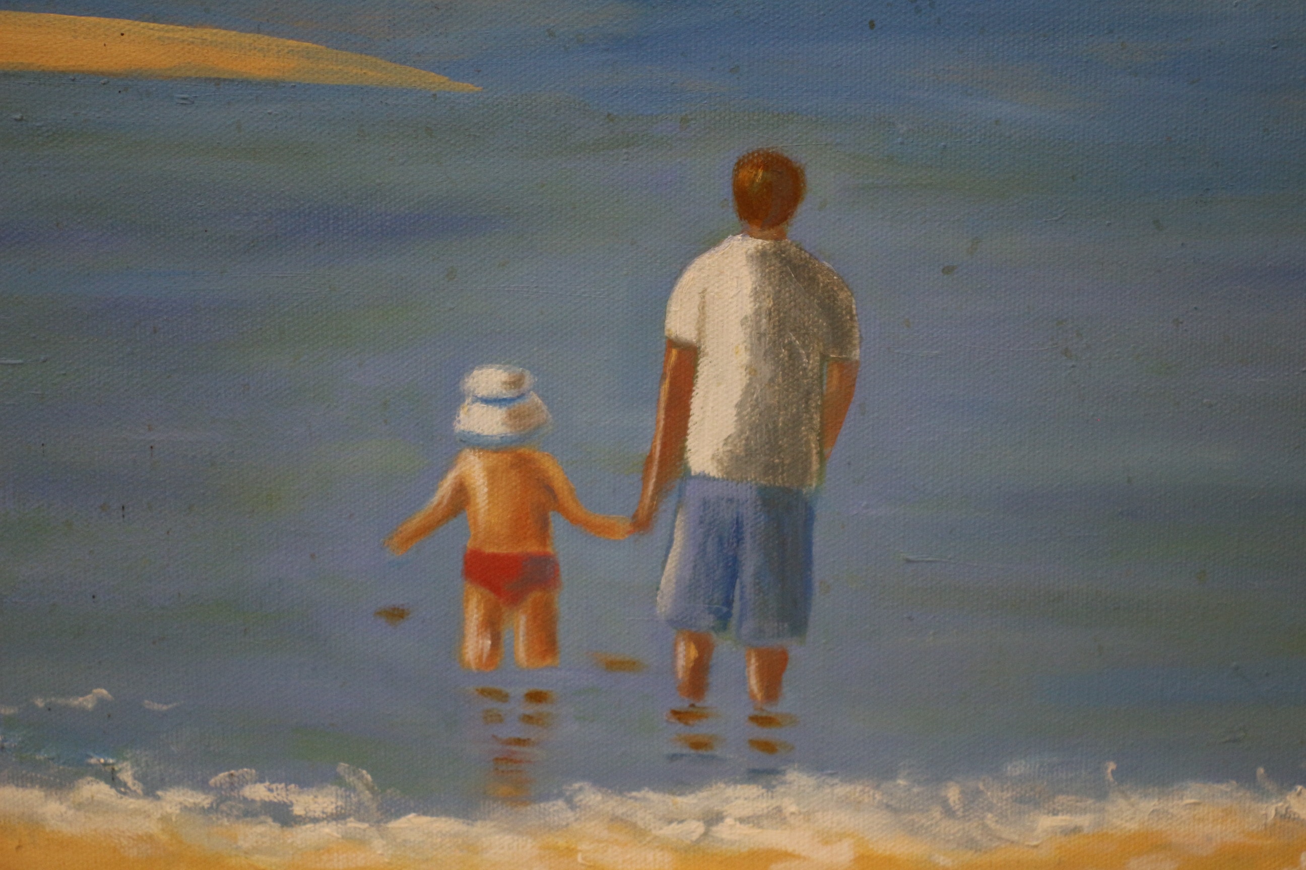 A modern representational painting, likely executed in oil or acrylic on stretched canvas, depicting a calm beach or shallow ocean scene by Sarah Huggett. The artwork features a man and a young child holding hands in the immediate foreground, standing in shallow, clear blue Cornish water with a sandy shore at their feet. In the midground, a solitary child figure is seen wading, with several other distant figures visible further out in the water, under a sky filled with distinct white clouds. The painting exhibits a somewhat simplified or naive style, characterized by a bright colour palette. There are no discernible signatures but we are assured of the artist as the vendor is related. 61x54cm
