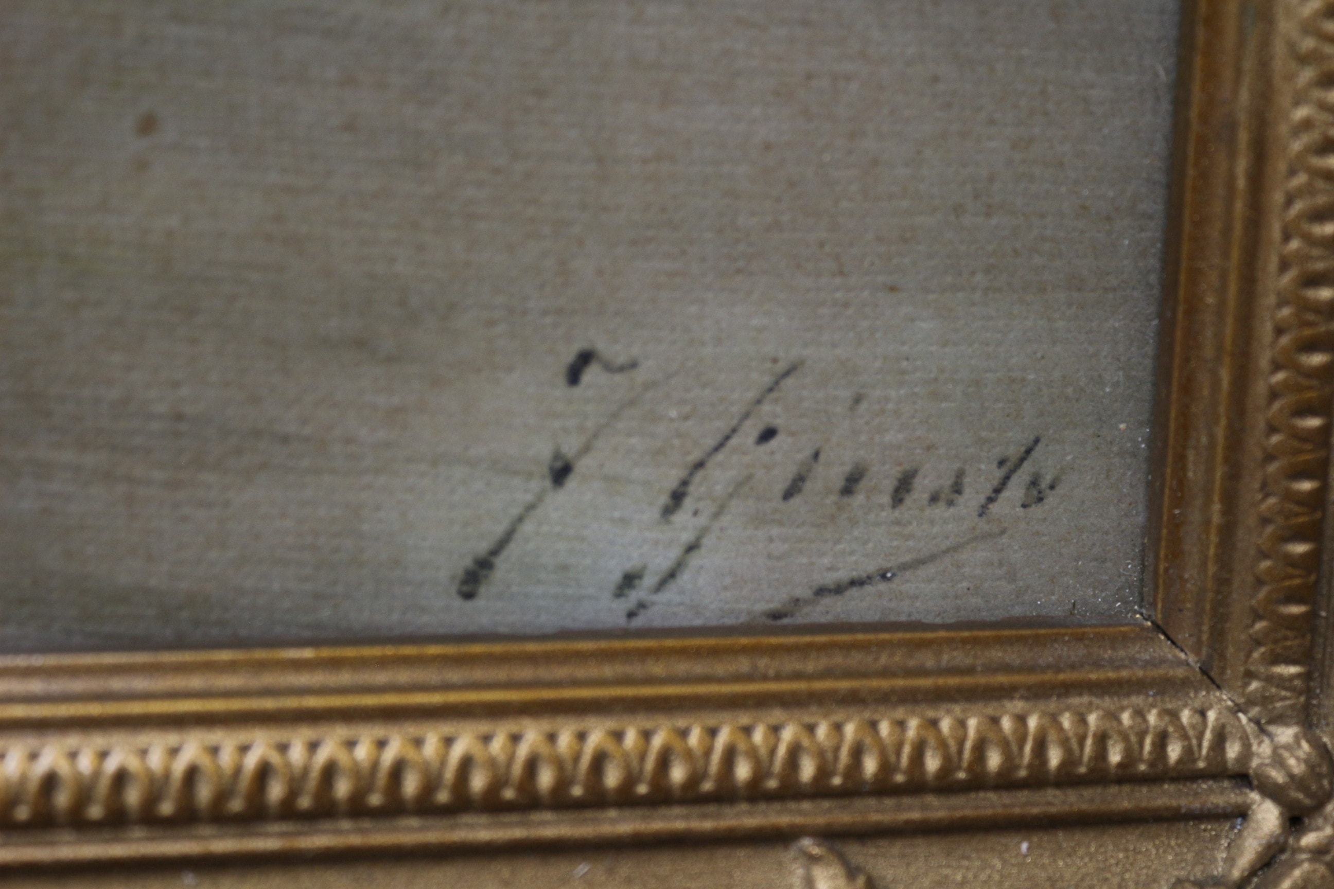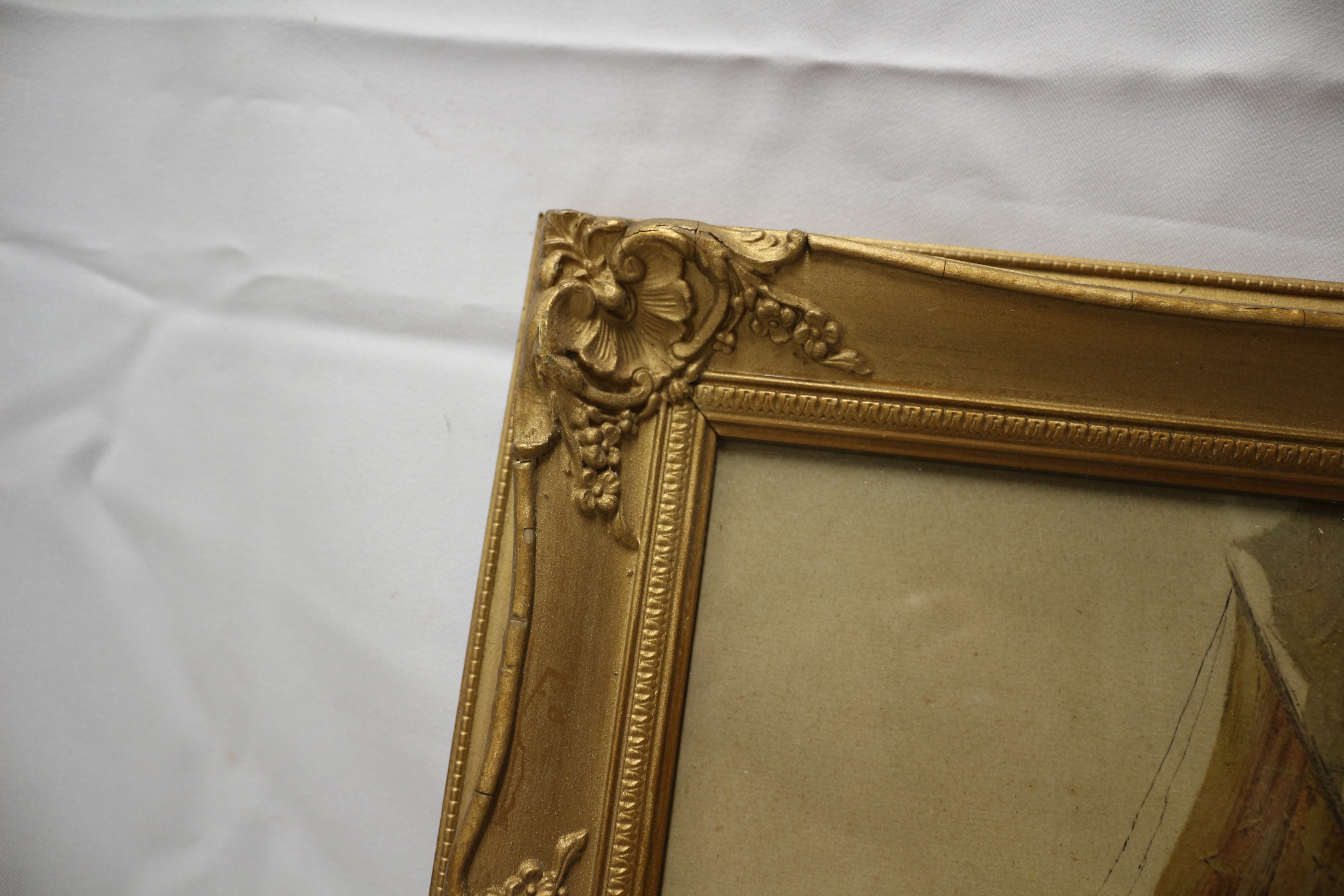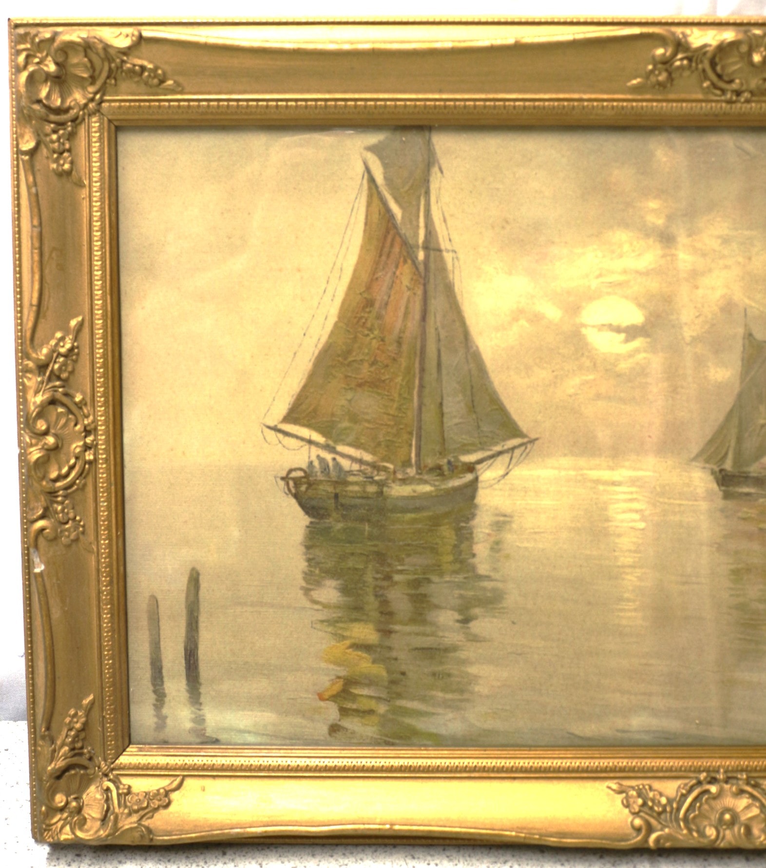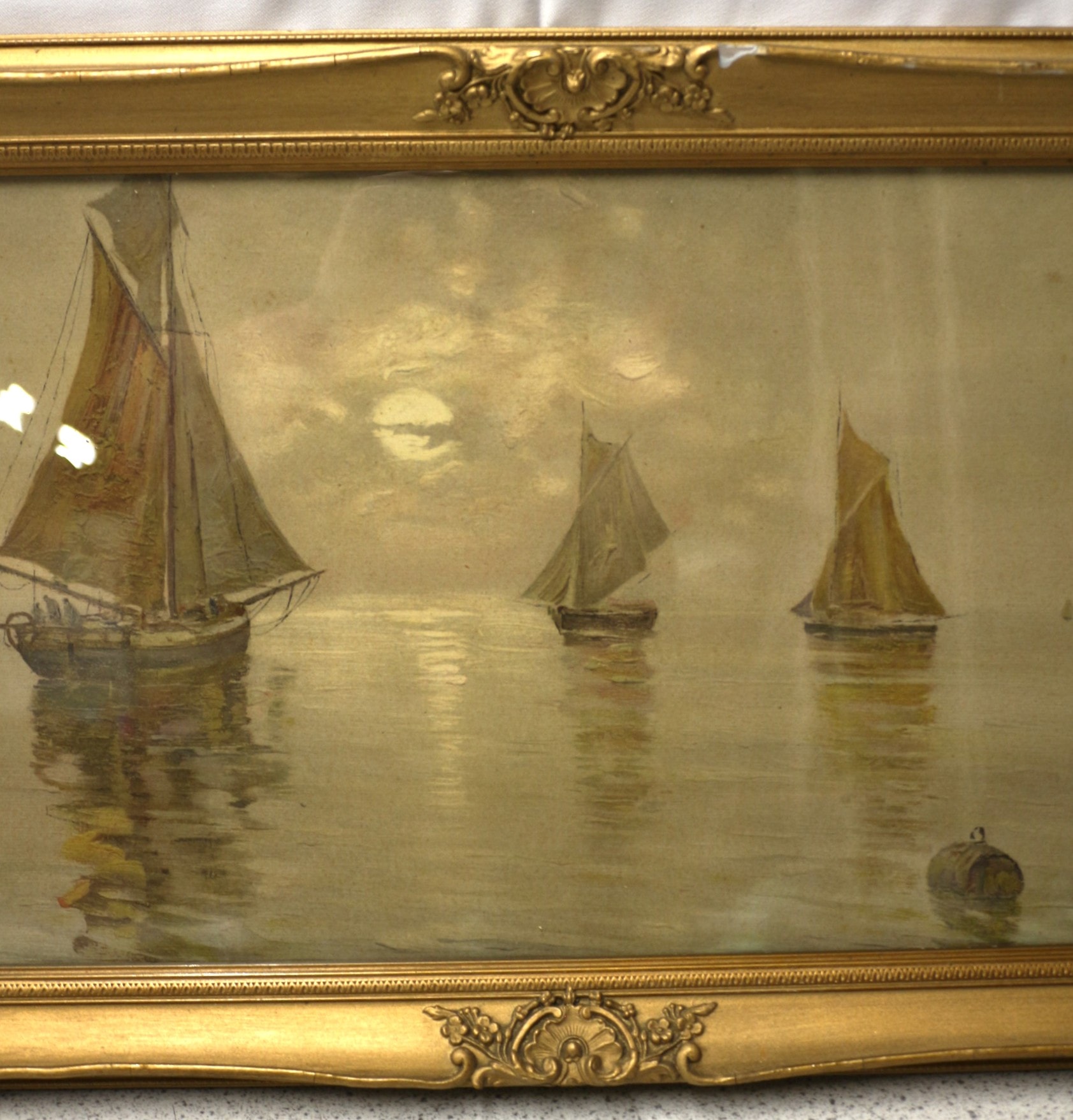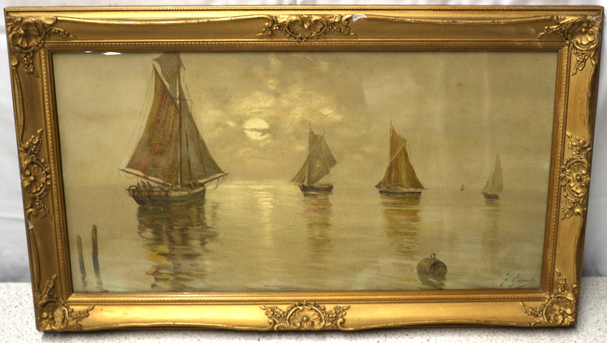 An oil on board or canvas painting, under glass, depicting several sailboats on calm waters beneath a hazy sky, possibly moonlit or at sunset. The artwork is rendered in an Impressionistic or Tonalist manner with a muted, yellowish-brown palette. It bears a script signature in the lower right corner, appearing to be Fausto Giusto. The painting is presented in an ornate, gilded wood or gesso frame, characteristic of late 19th or early 20th-century Rococo Revival styles, featuring floral and scrollwork decoration. 64.5×37.5cm