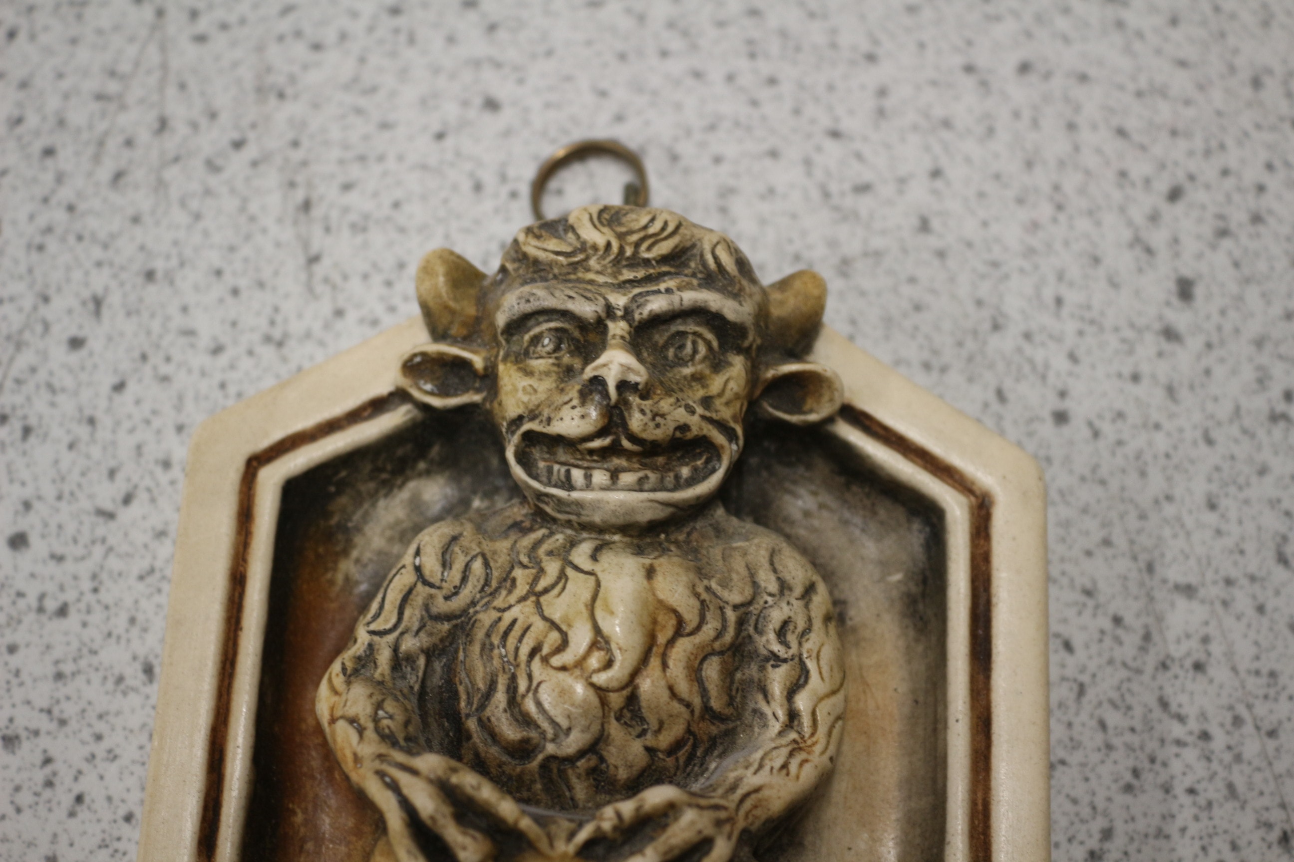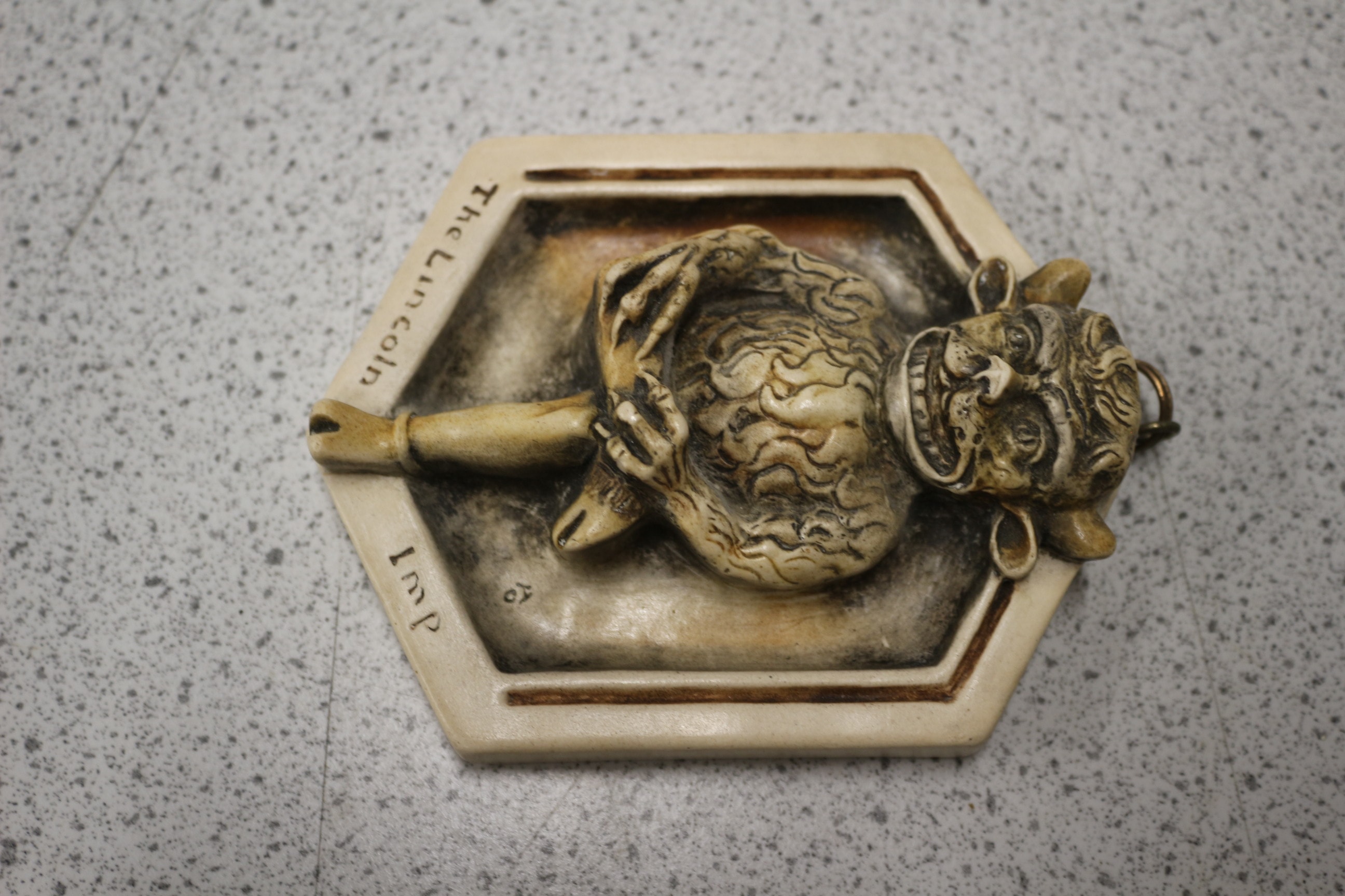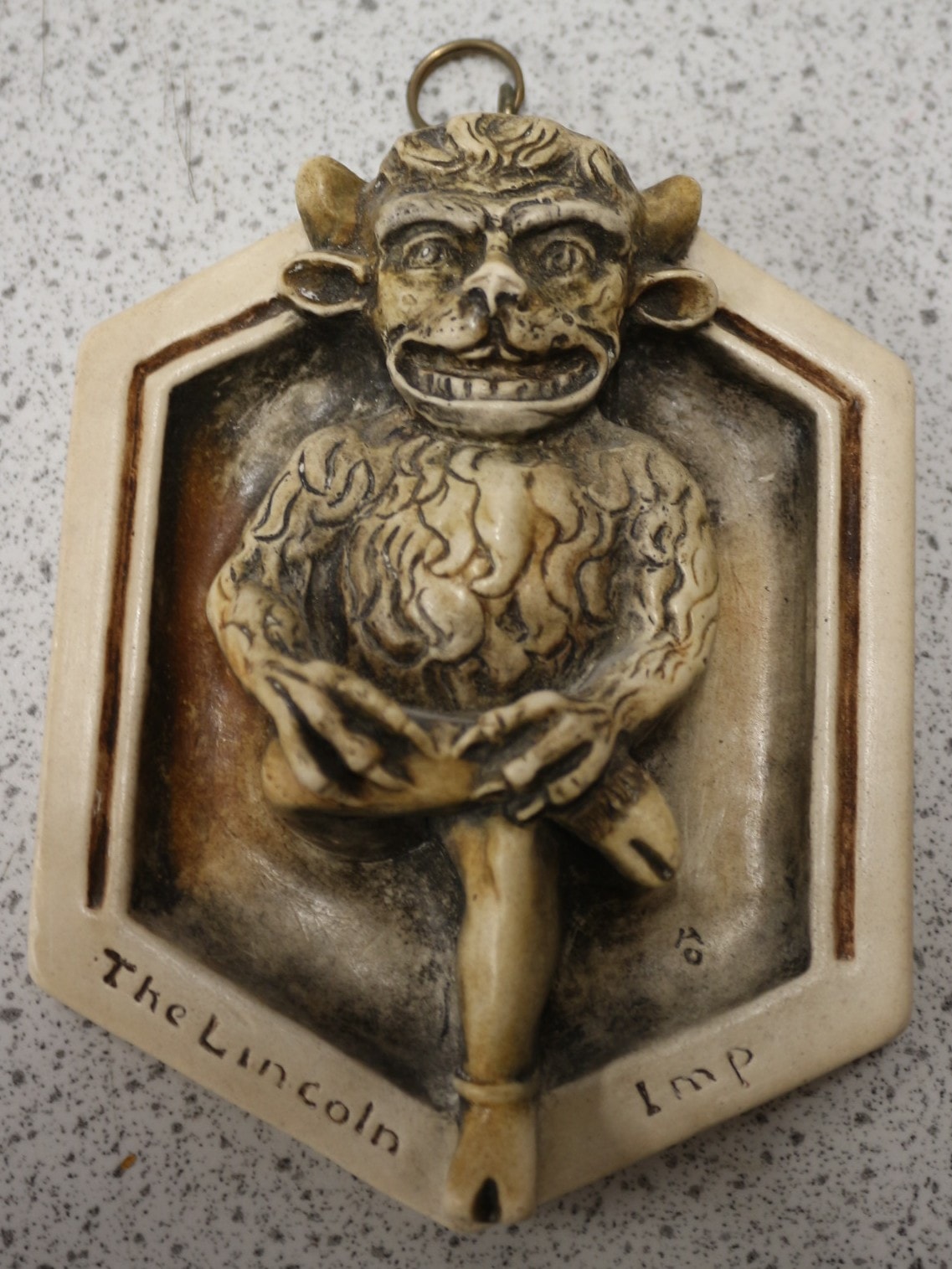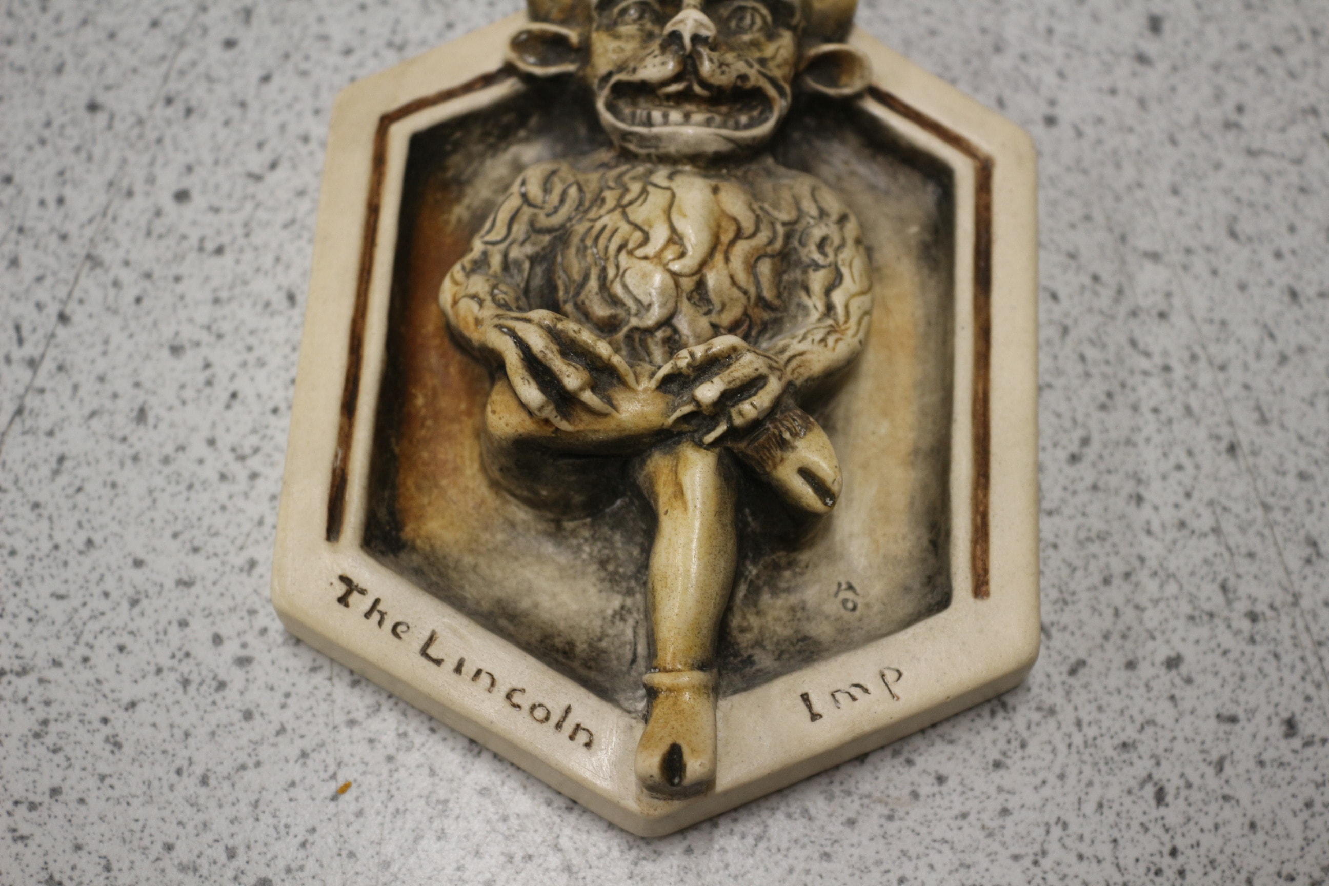 A rare hexagonal wall plaque, possibly by Osborne Ivorex, featuring a high-relief depiction of a grotesque, imp-like figure with horns, pointed ears, and a wide, toothy grin, seated with crossed legs, known as The Lincoln Imp. The figure exhibits textured fur-like details and is set within a recessed rectangular frame against a darker, mottled background. Crafted from a cast material, likely resin or a composite, it displays a variegated cream, brown, and dark grey coloration, giving it an antiqued appearance consistent with aged bone or stone. Inscribed along the lower edge of the hexagon is the text “The Lincoln Imp.” A small, stylized mark, possibly “AC” or “AG” with a number “6”, is visible near the imp’s right knee. A brass-coloured metal loop is affixed at the top for suspension. 14cm