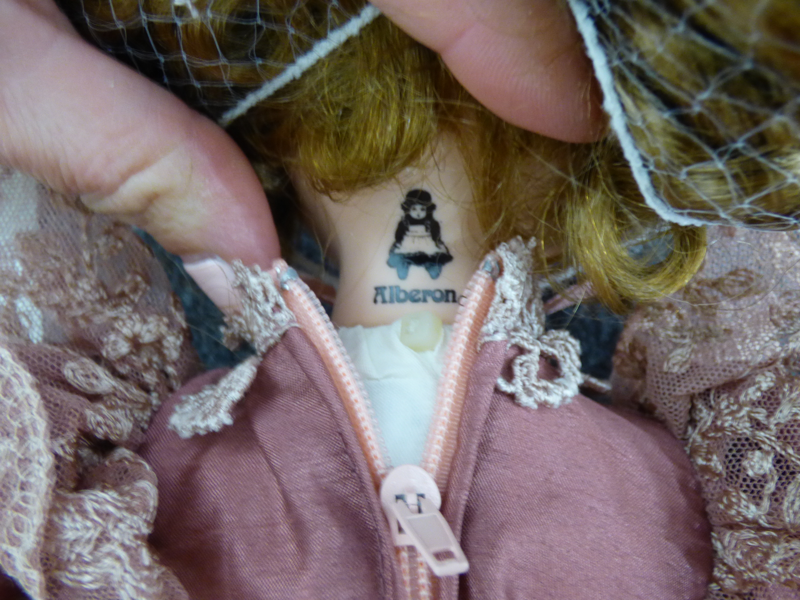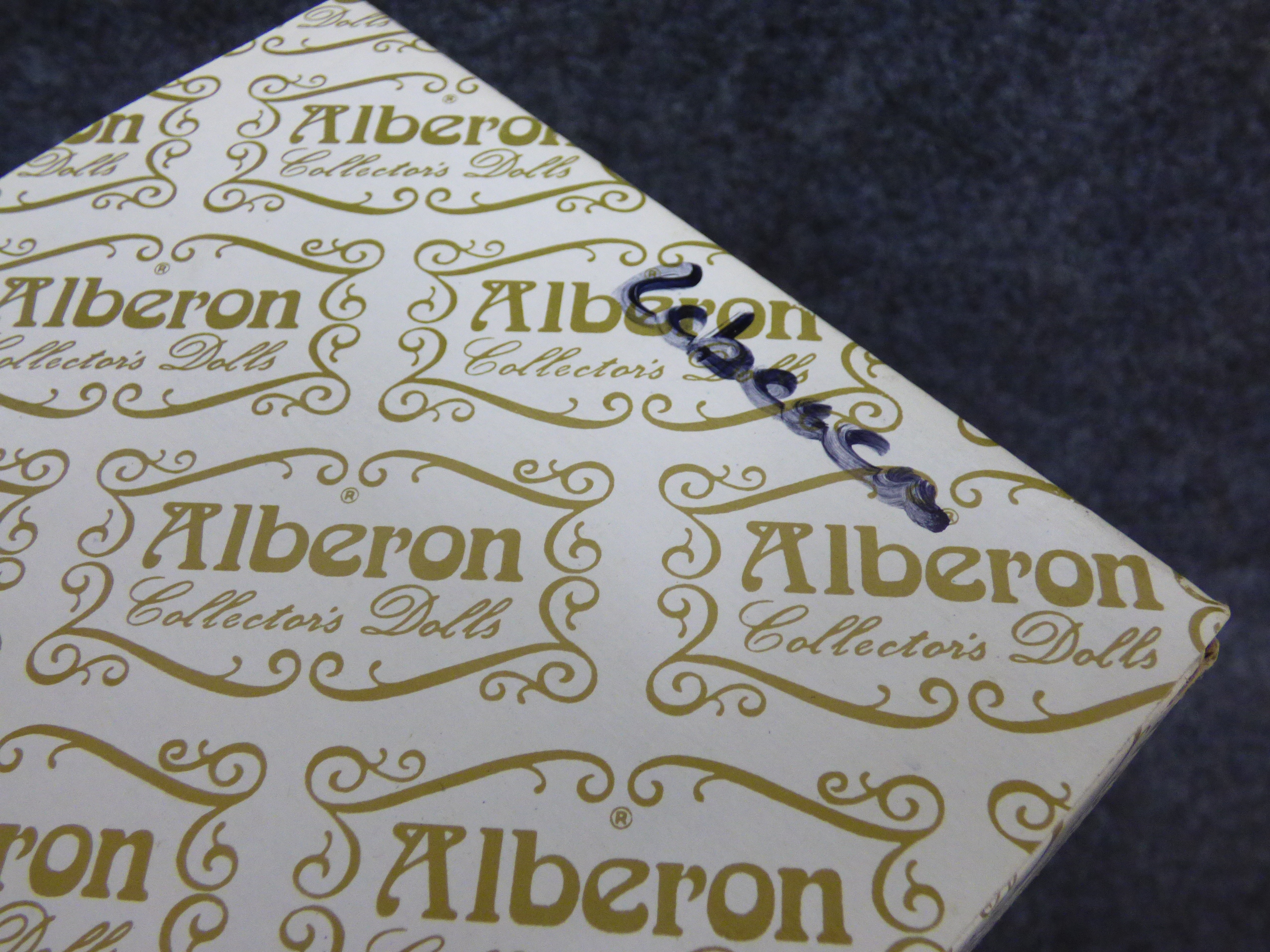 A rose-coloured Alberon porcelain collector’s doll named Rebecca featuring a lace-trimmed dress and matching bonnet, accompanied by its original box, display stand, and tags. 36cm tall