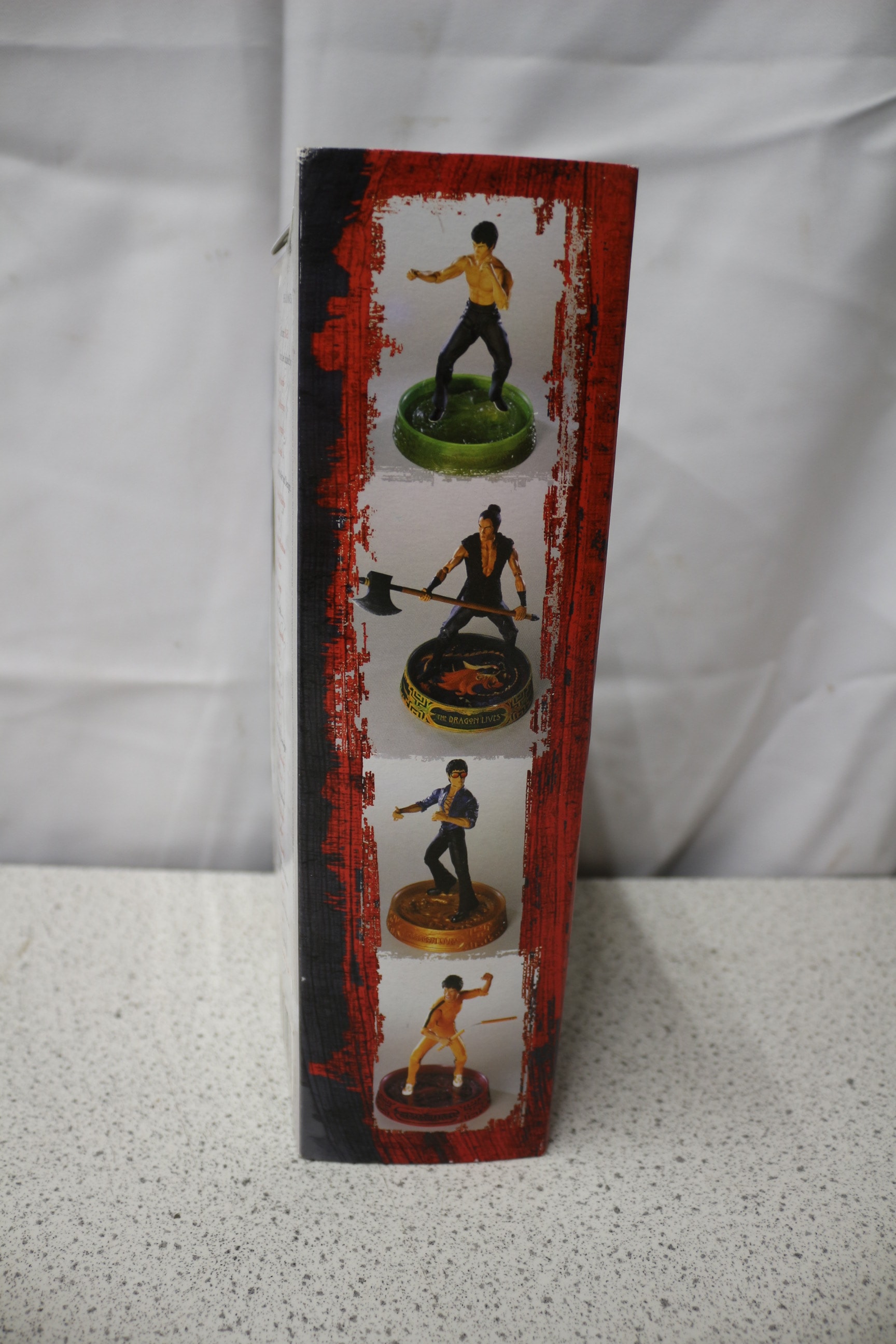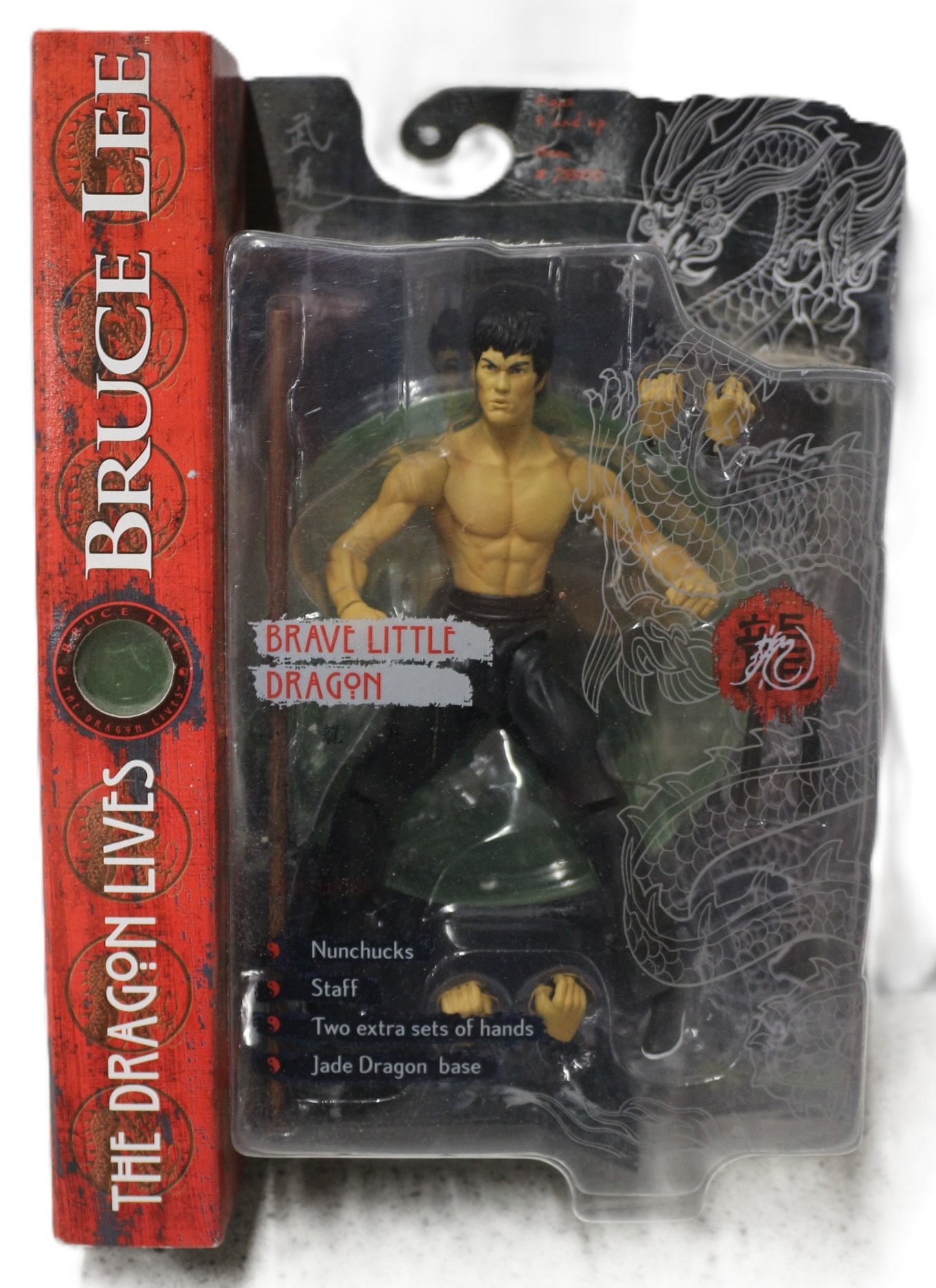 An Art Asylum Bruce Lee ‘The Dragon Lives’ ‘Brave Little Dragon’ action figure, identified as a mouth variant. The figure is presented new in its original, sealed blister packaging. It depicts Bruce Lee shirtless with black pants and comes with accessories including nunchucks, a staff, two extra sets of hands, and a “Jade Dragon base.” The cardboard packaging features stylized dragon artwork and prominent English text such as “THE DRAGON LIVES BRUCE LEE” on the spine, and “BRAVE LITTLE DRAGON” on the front. The reverse of the packaging includes descriptions for other figures in the series, including “IMMORTAL DRAGON, ” “HONG KONG DRAGON, ” and “ASCENSION OF THE DRAGON.” Visible Chinese characters include “龙” (lóng, meaning dragon) in a red circular emblem on the front; “武道” (wǔ dào, meaning martial arts/the way of martial arts) on the spine; and character sets on the back corresponding to the figure names, such as “不死龙” (bù sǐ lóng, meaning immortal dragon) and “香港龙” (Xiānggǎng lóng, meaning Hong Kong dragon). The packaging was manufactured by JAS Toys.