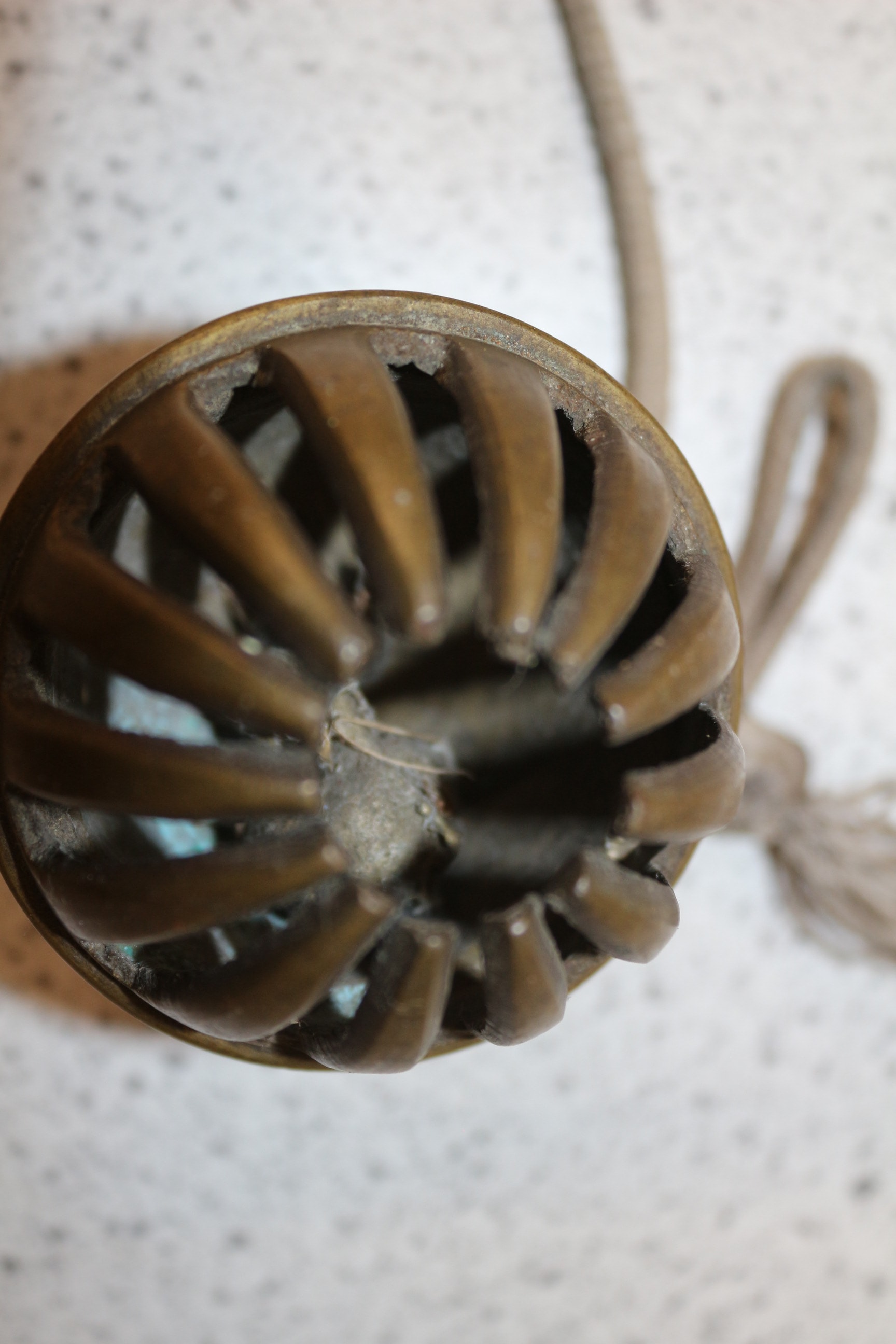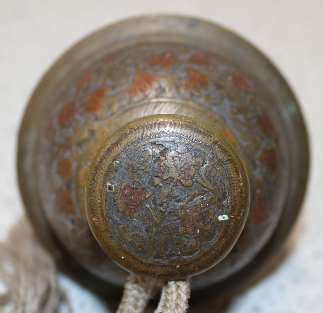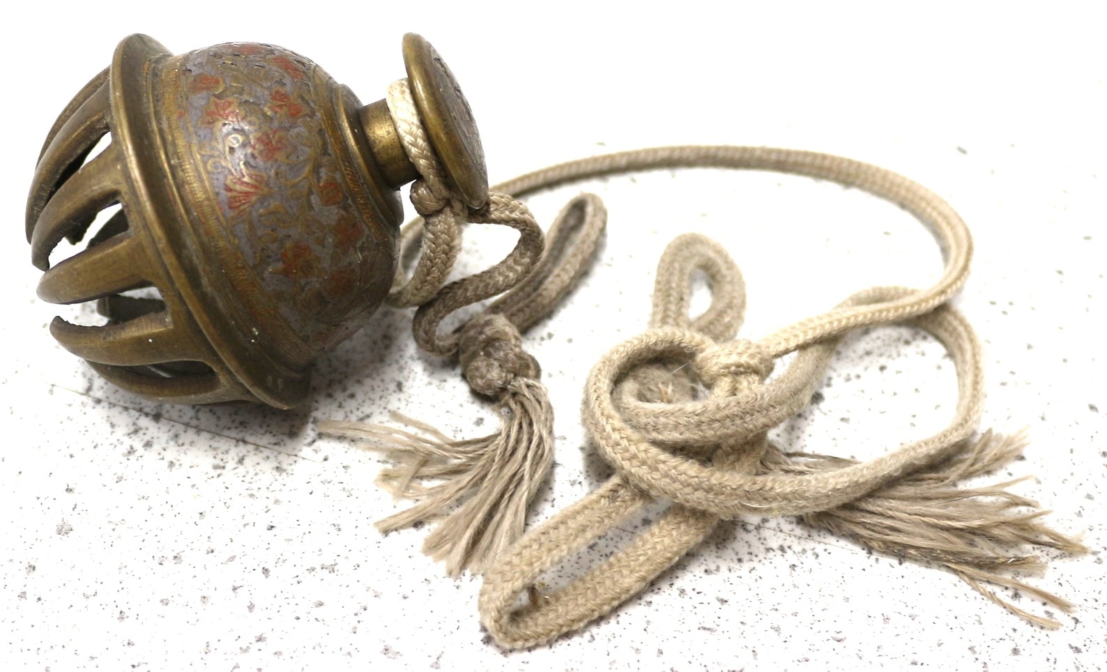 An ornate brass Elephant bell, crafted from brass, exhibiting a heavy, aged patina. The spherical body is adorned with intricate floral and foliate designs in faded red and orange enamelling or inlay against a darkened ground. One end terminates in a cage-like structure of curved metal slats, which contains a ball that creates the bell sound, while the opposing end features a finial decorated with similar motifs, from which a braided natural fibre cord with frayed tassels is attached.