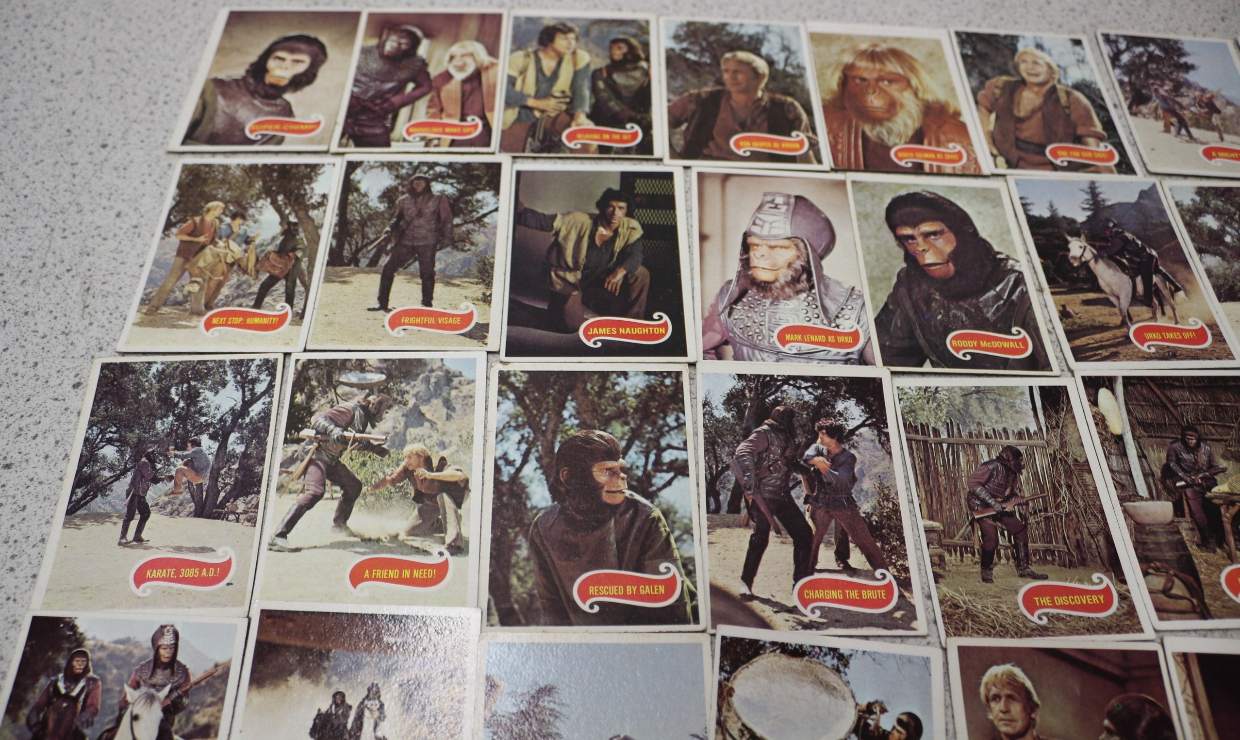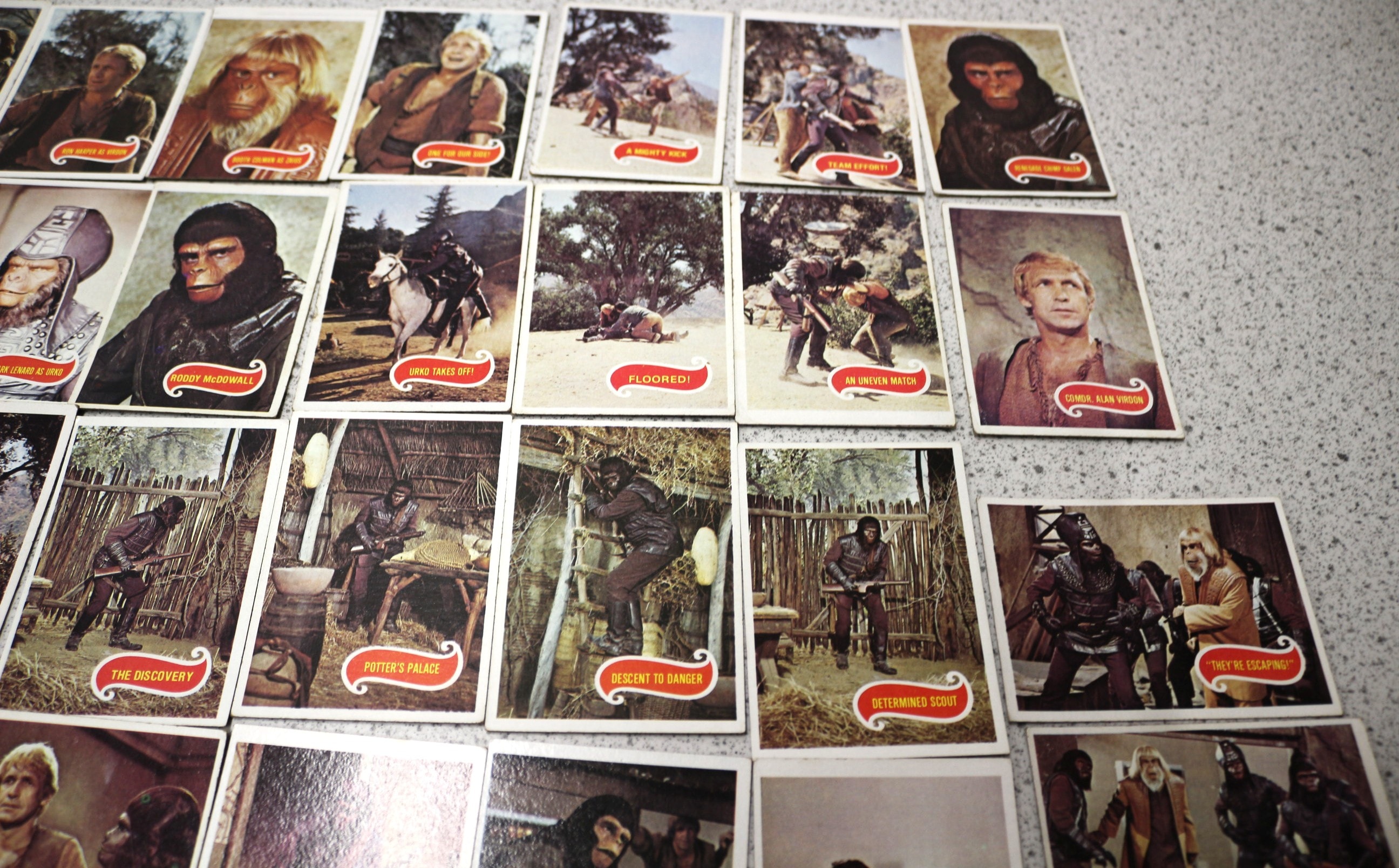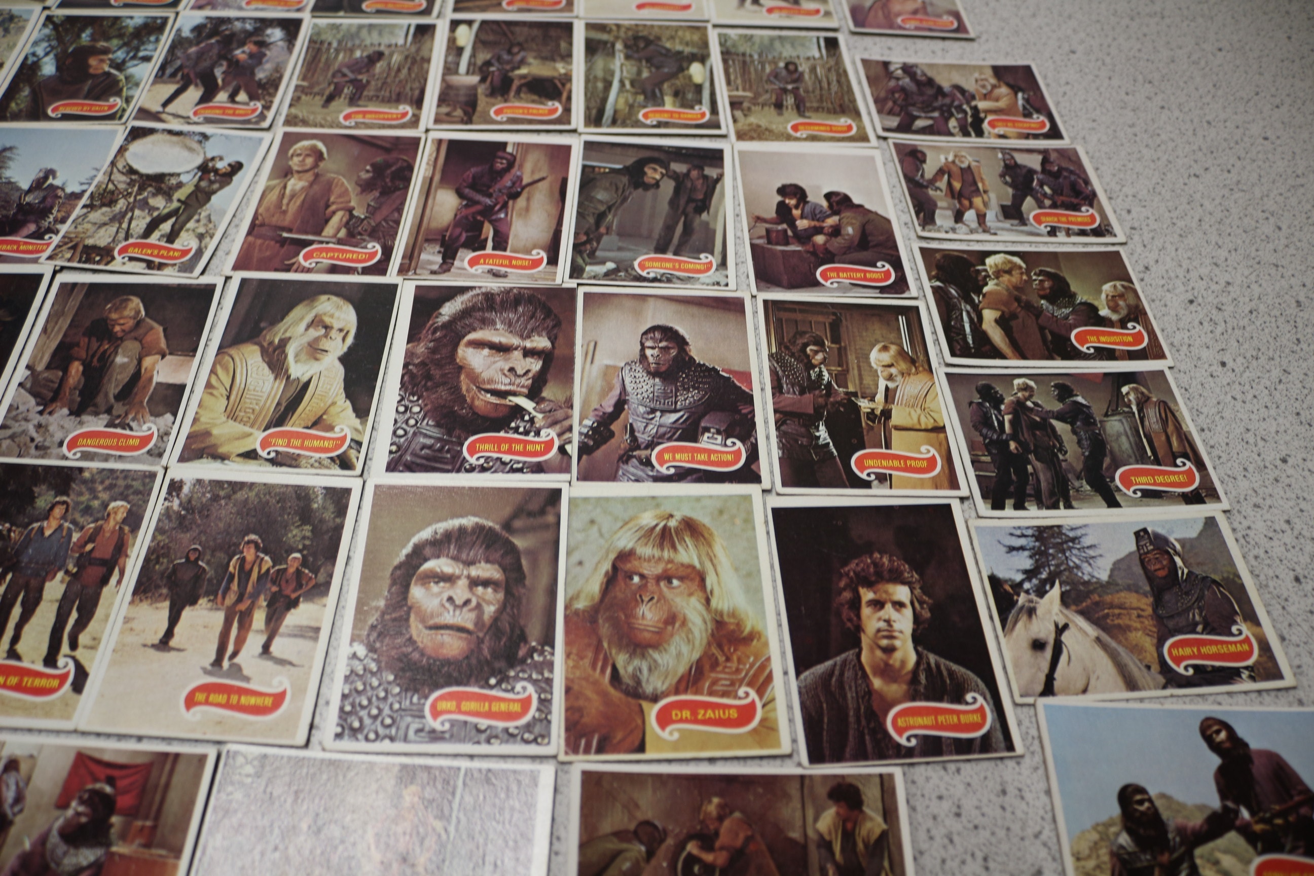 A believed to be full set collection of 66 Rare Topps Planet of the Apes 1975 trading cards. This substantial collection, numbering over one hundred cards, features colour photographic stills from the “Planet of the Apes” media franchise. The cards depict various human and ape characters, scenes, and action shots, consistent with the style and aesthetic of late 1960s to early 1970s film and television productions. Each card is constructed from paper or cardstock and framed by an orange-red border with descriptive white English text at the bottom, identifying characters or plot points, such as “DR. ZAIUS, ” “DOGGY MCDOWALL, ” “THE KEY, ” “CHARGING THE BRUTE, ” and “MARC EVANS IS FREE!”