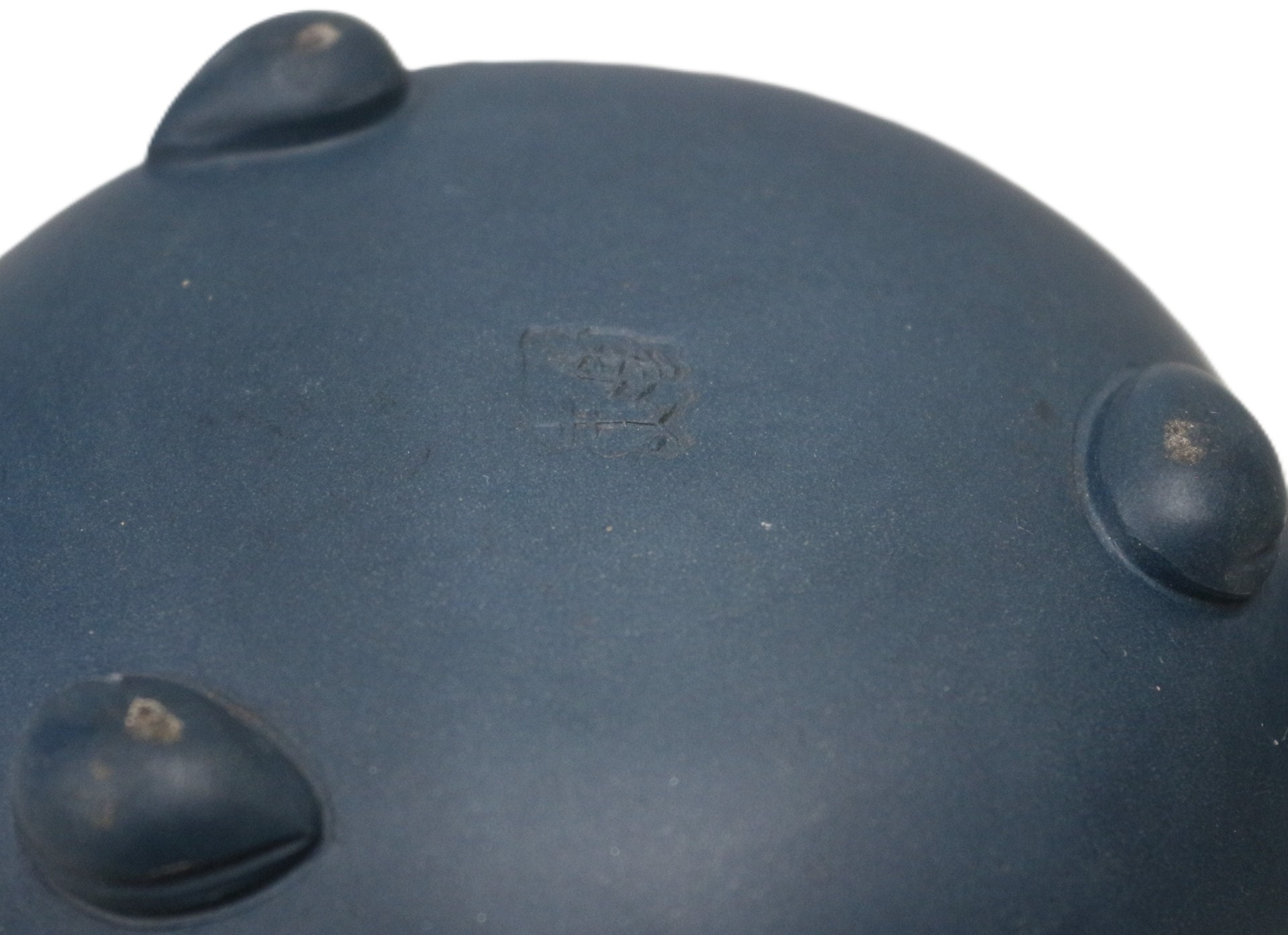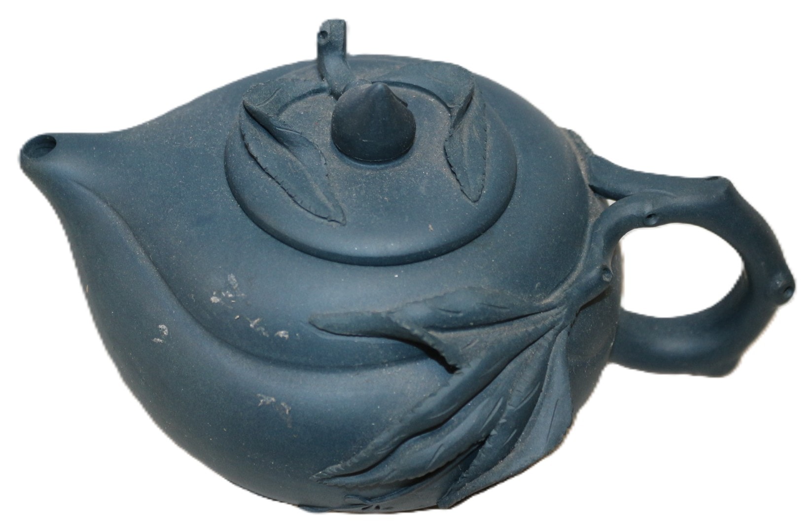 A Chinese Yixing Zisha teapot, unglazed, dark blue-grey stoneware, characterized by a naturalistic or botanical design. The squat, rounded body features sculpted leaves that extend from the side to integrate with the branch-like handle, while the lid is topped with a bud or fruit finial surrounded by further leaf detailing. The teapot rests on three small, conical feet. An indistinct four-character square seal mark is impressed on the underside of the body. 14.5cm spout to handle