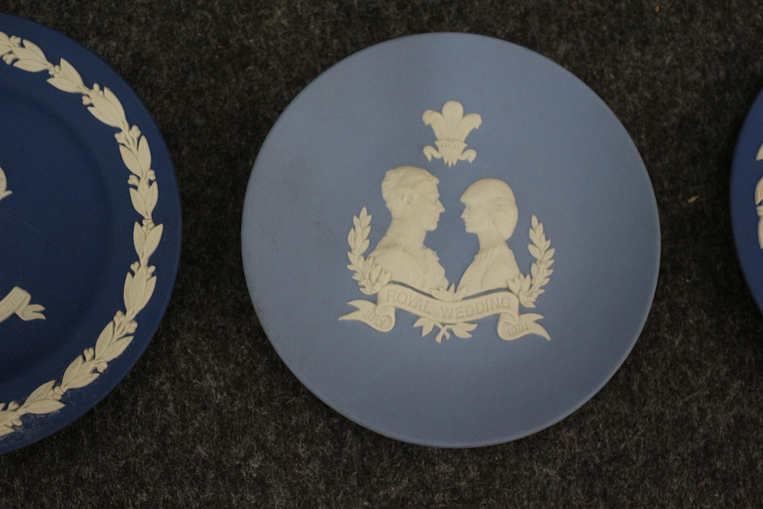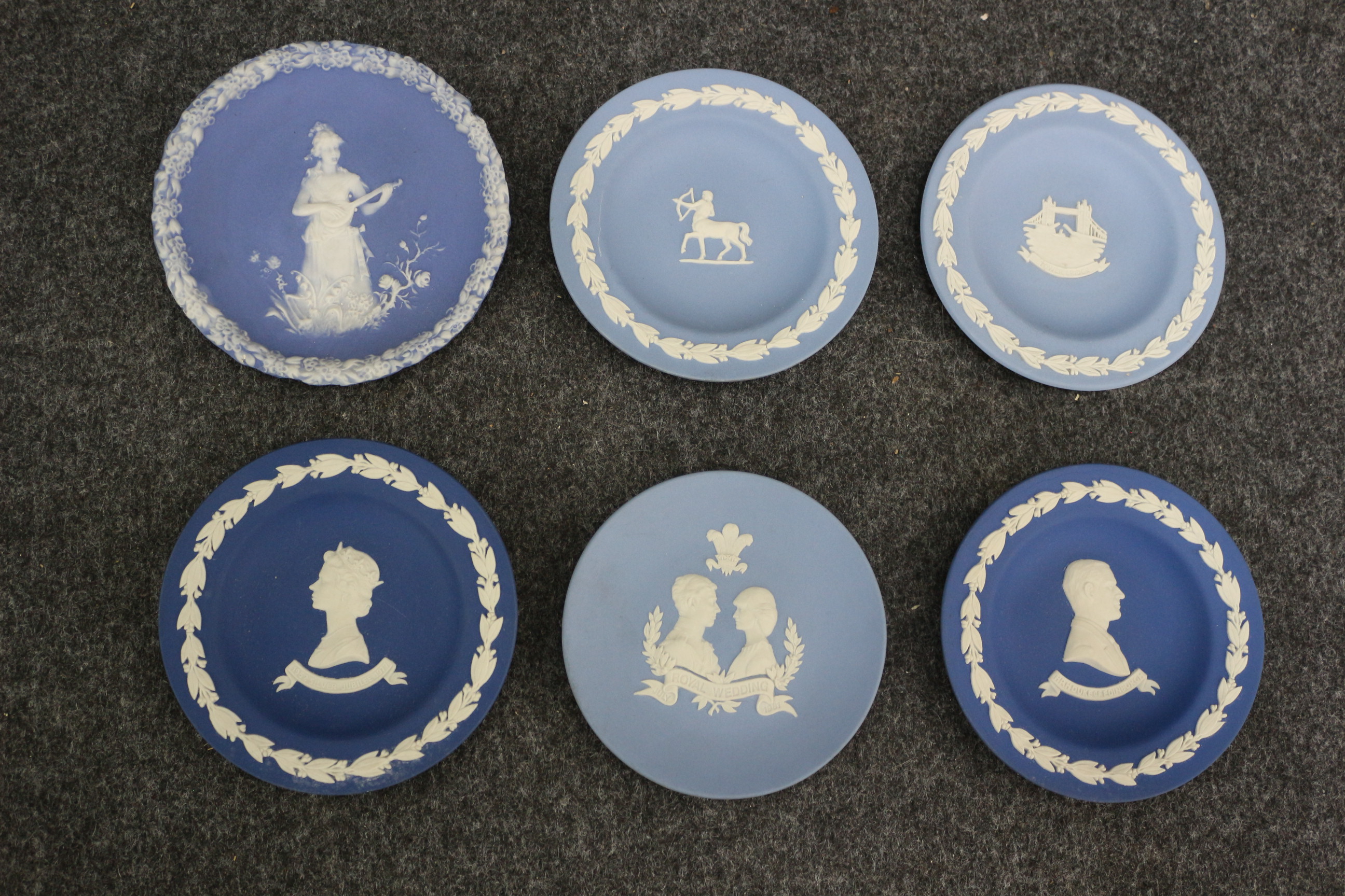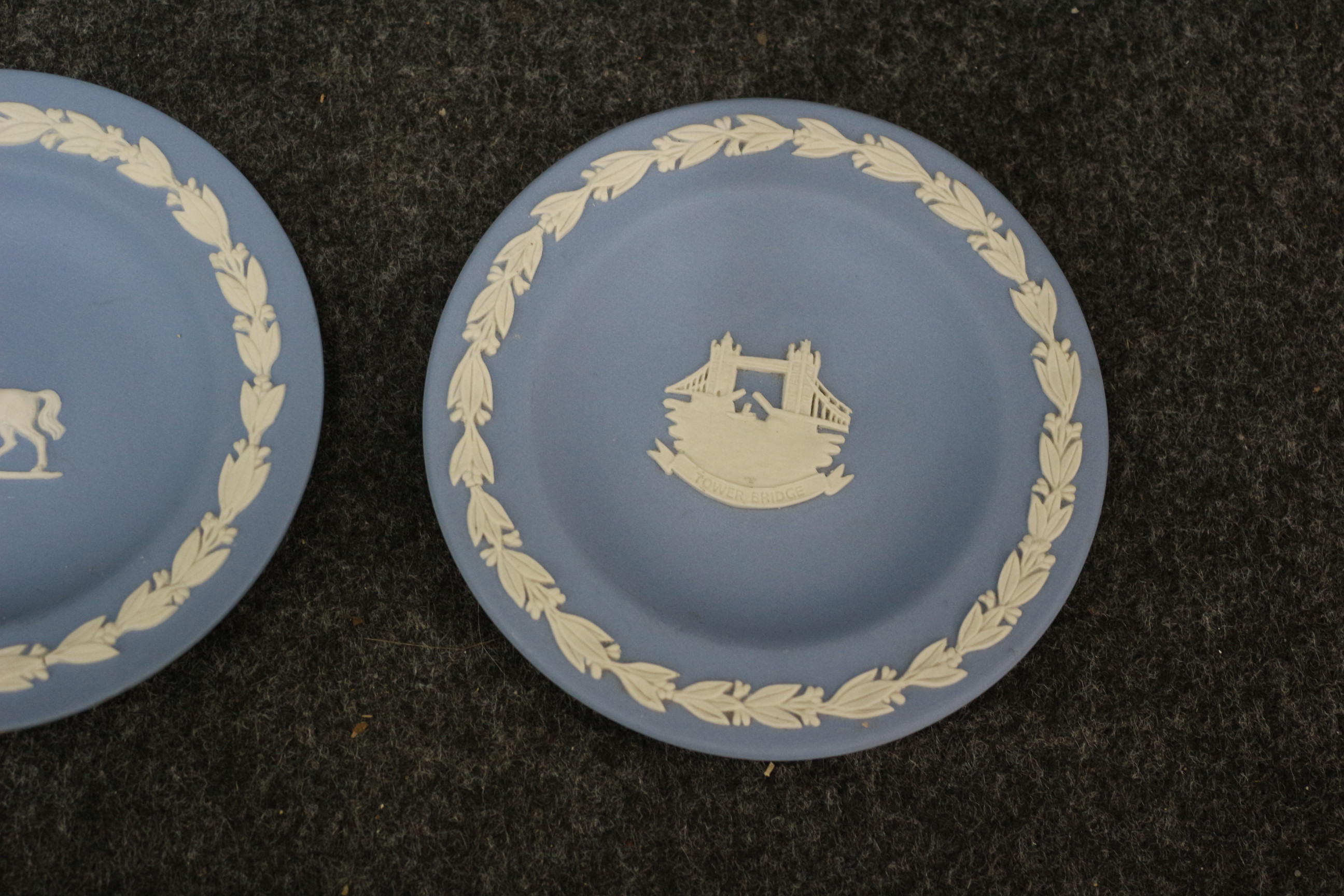 A collection of blue and white Jasperware-style decorative plates featuring central motifs including Tower Bridge, the 1977 Silver Jubilee, and the 1981 Royal Wedding.