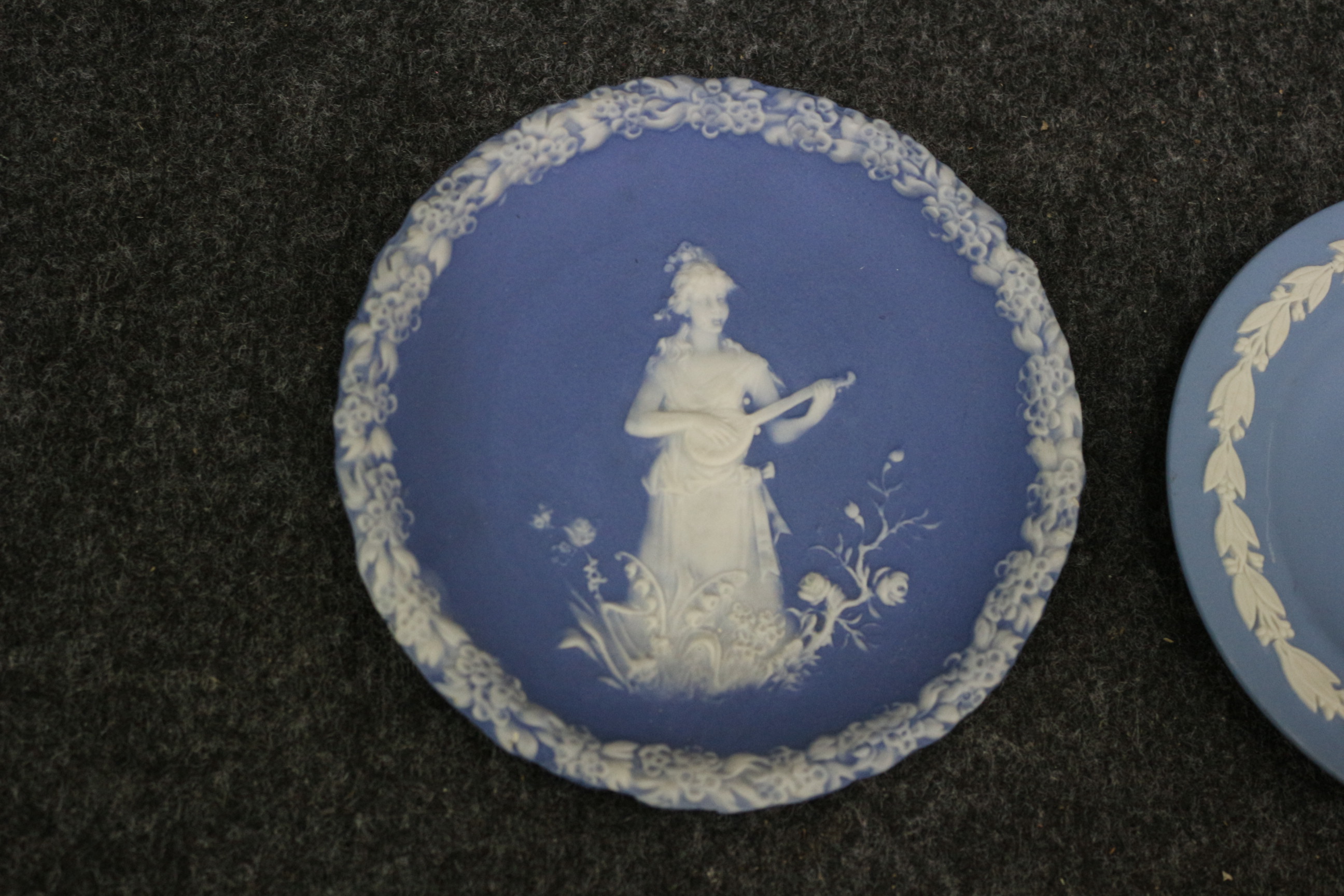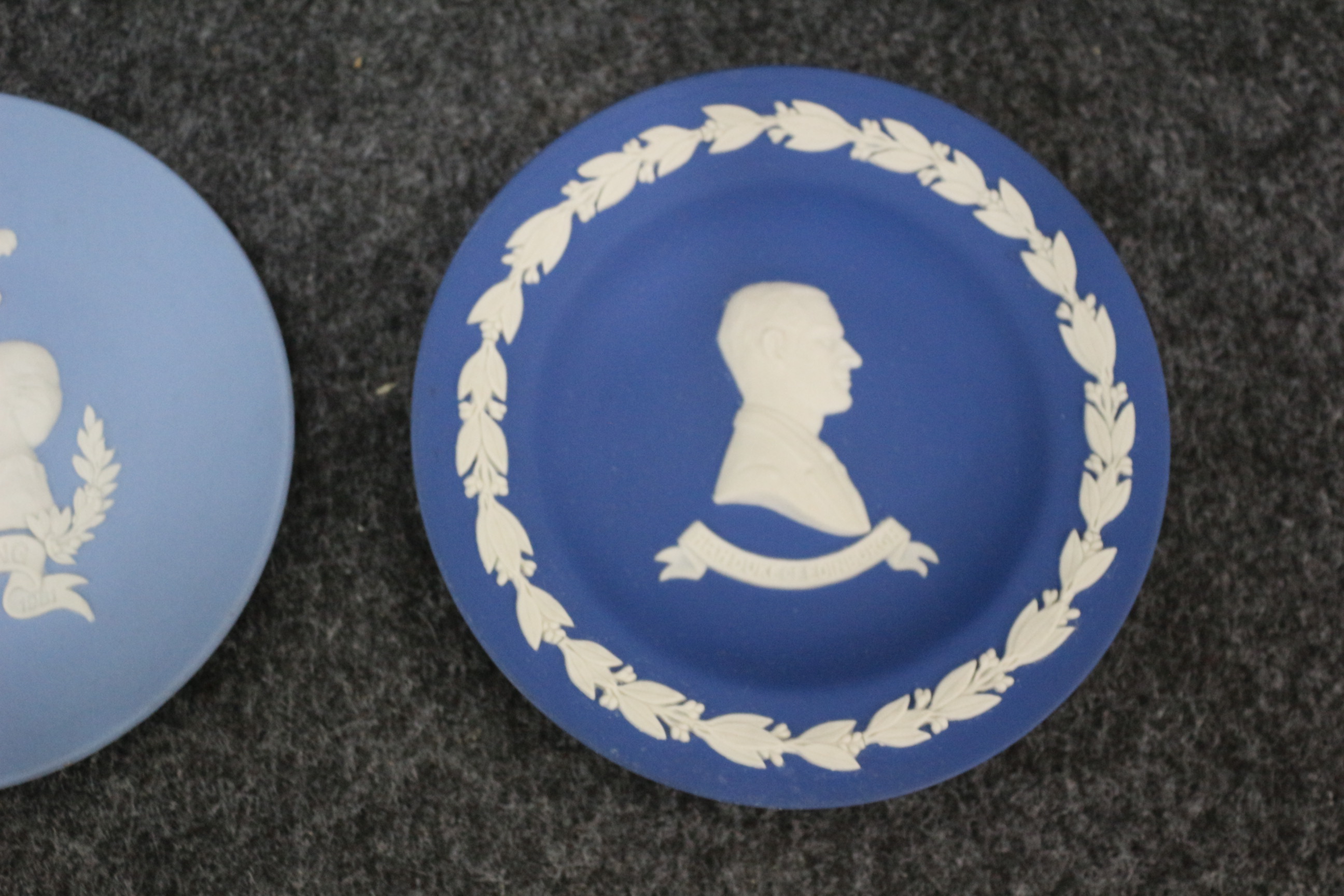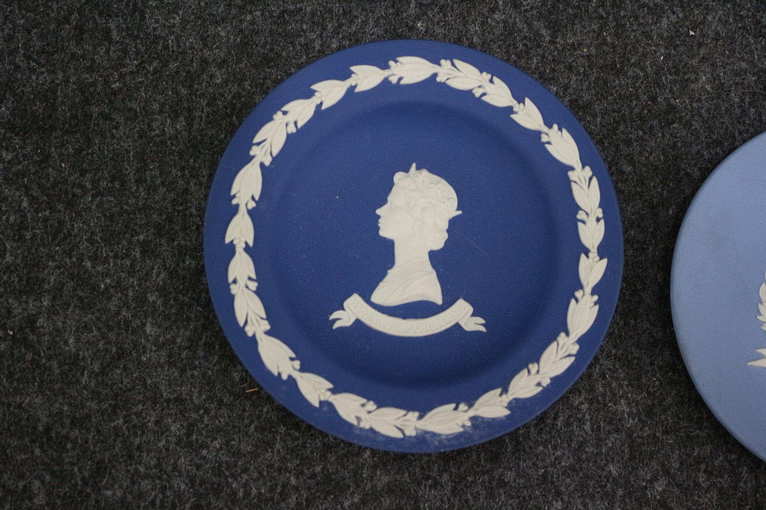 A collection of blue and white Jasperware-style decorative plates featuring central motifs including Tower Bridge, the 1977 Silver Jubilee, and the 1981 Royal Wedding.