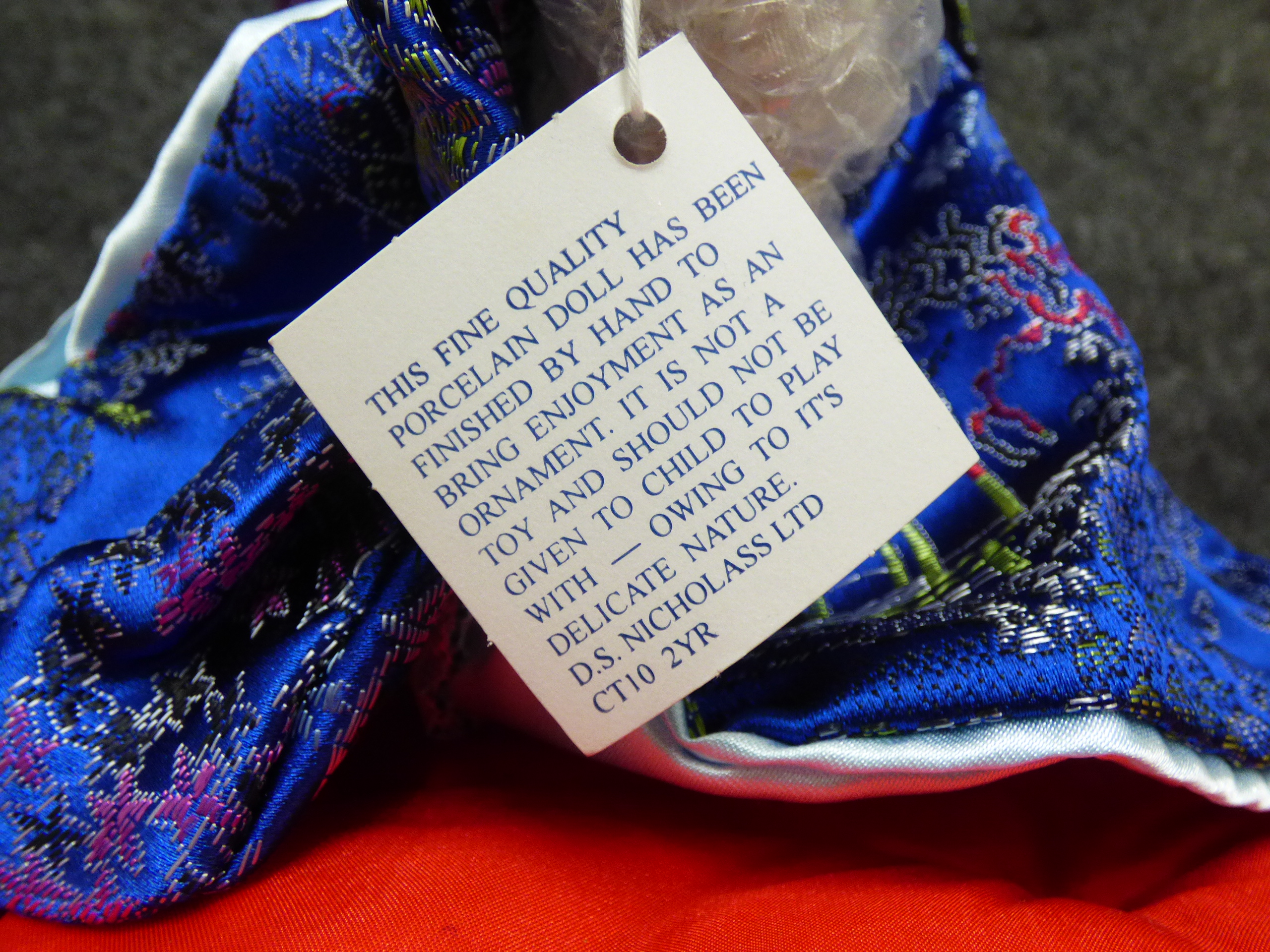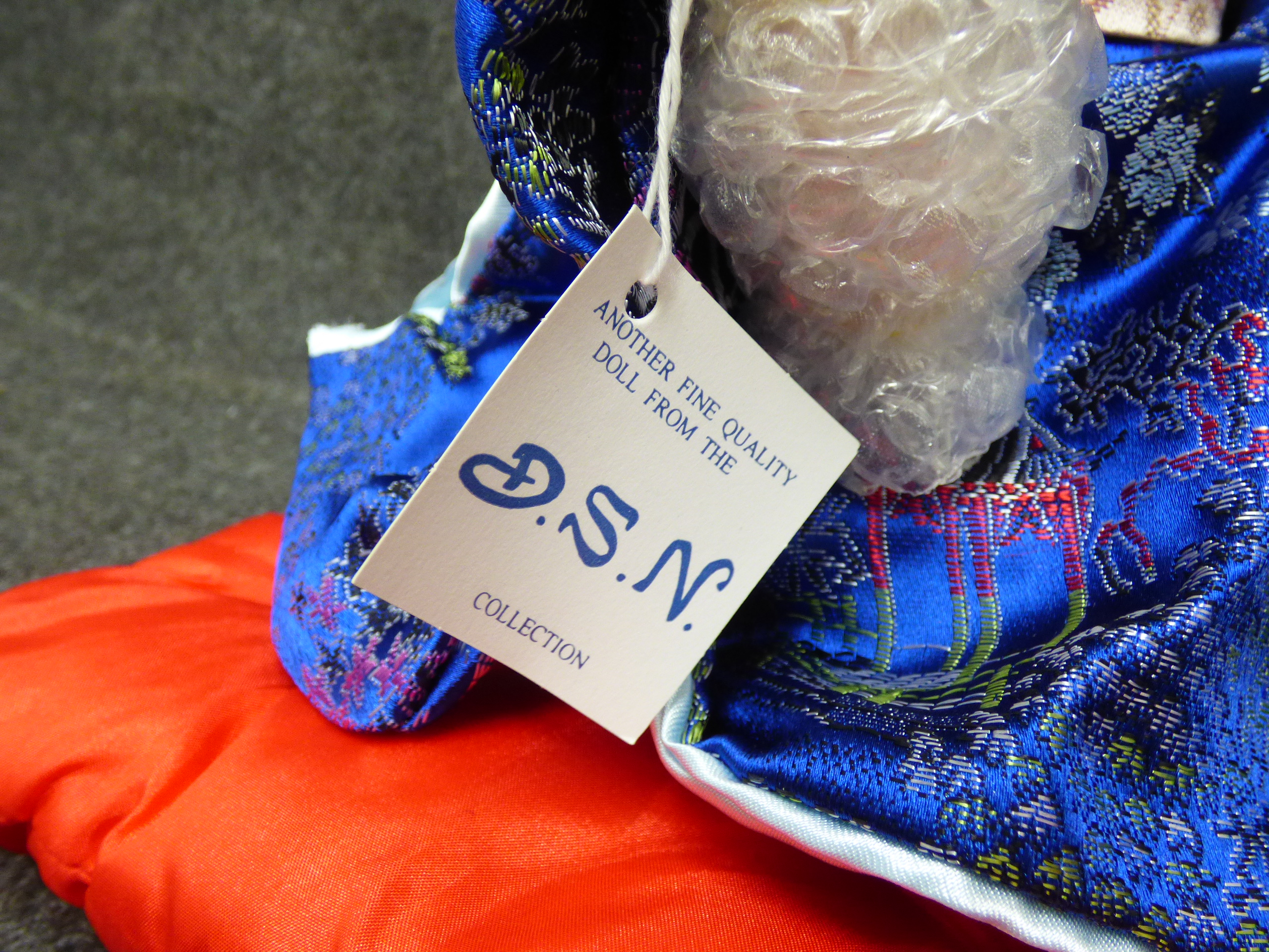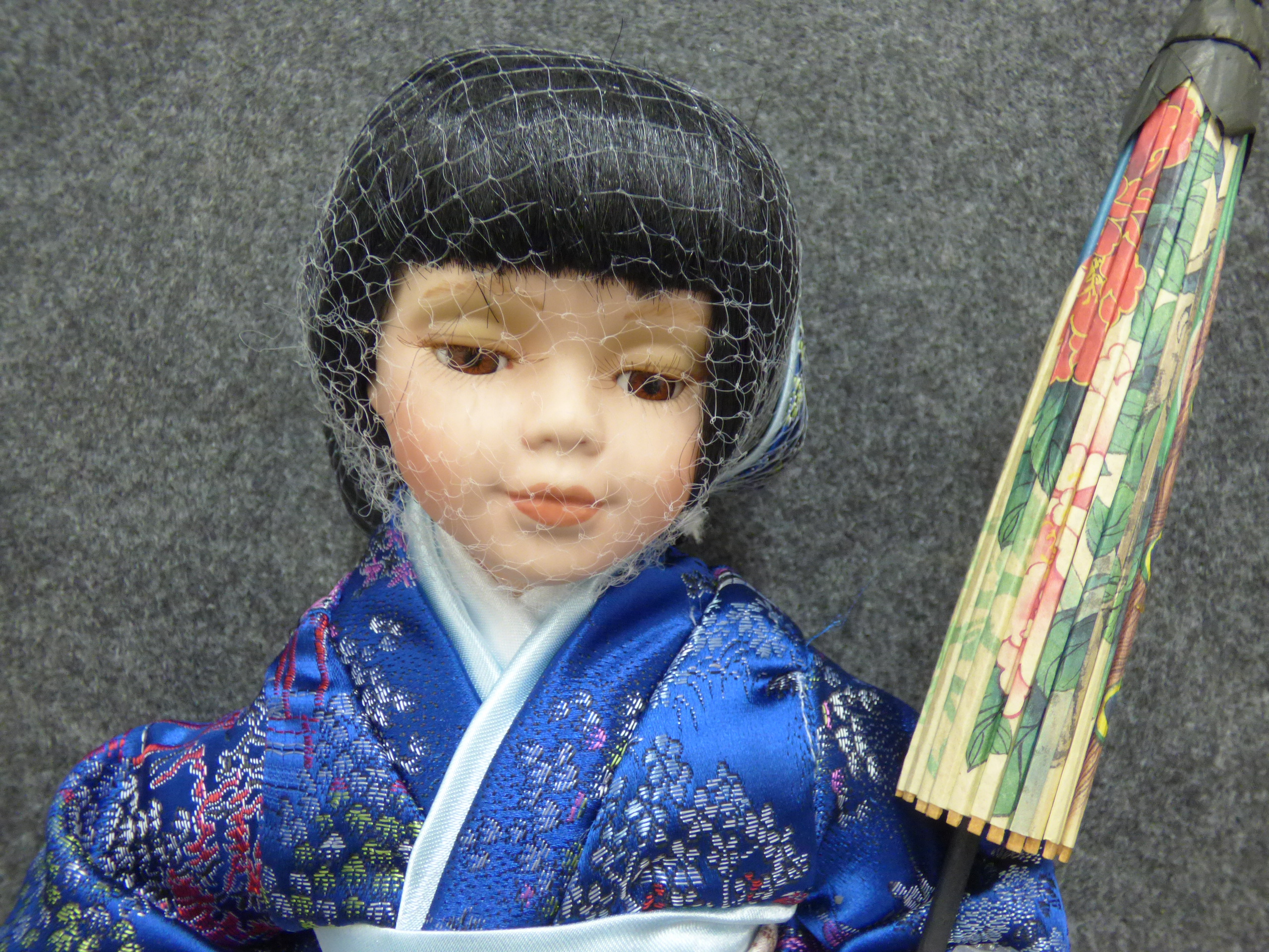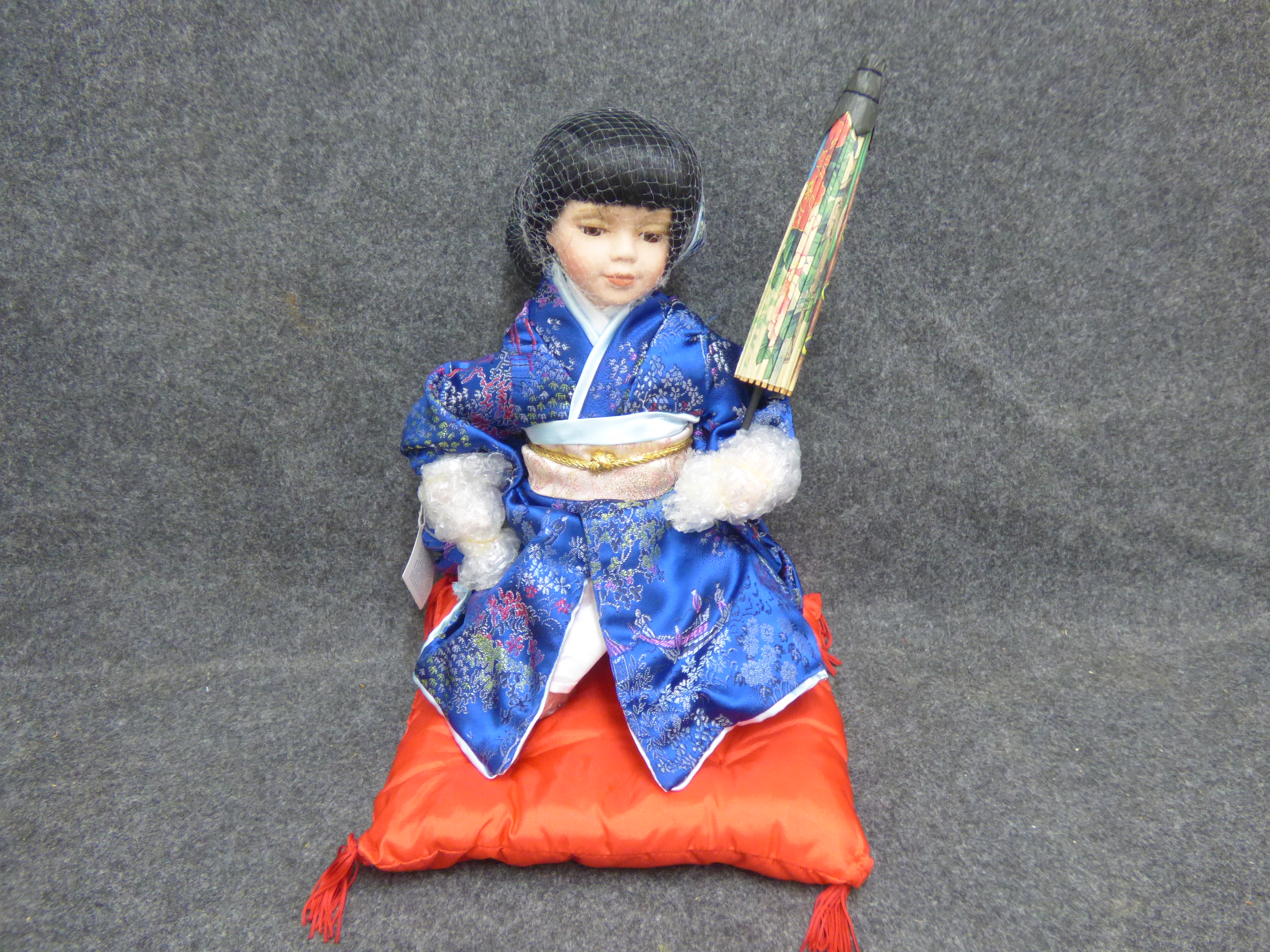 A porcelain geisha doll from the D.S.N. Collection wearing a blue floral kimono and kneeling on a red cushion with a parasol. 28cm