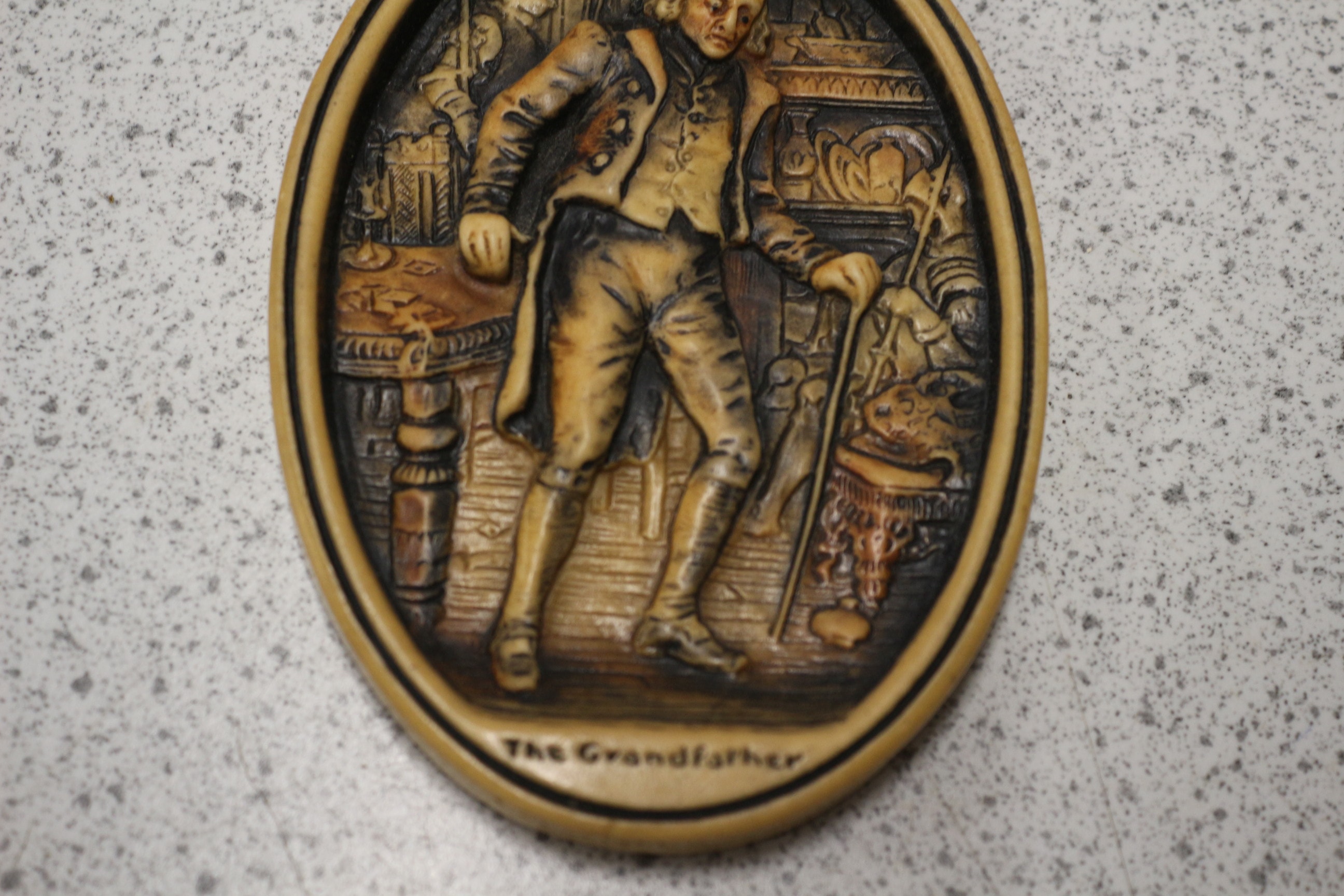 An Arthur Osborne Ivorex Plaque, titled ‘The Grandfather’. This oval-shaped decorative wall plaque features a high-relief carving of a gentleman in 18th-century European-style attire, holding a walking stick amidst ornate furnishings, evoking a historical genre scene. The plaque is made from a molded composite material or resin, finished with a two-tone patina simulating carved wood, with darker hues highlighting the recesses and lighter tan on the raised elements. The item is fitted with a braided brown hanging cord. 12.5cm tall