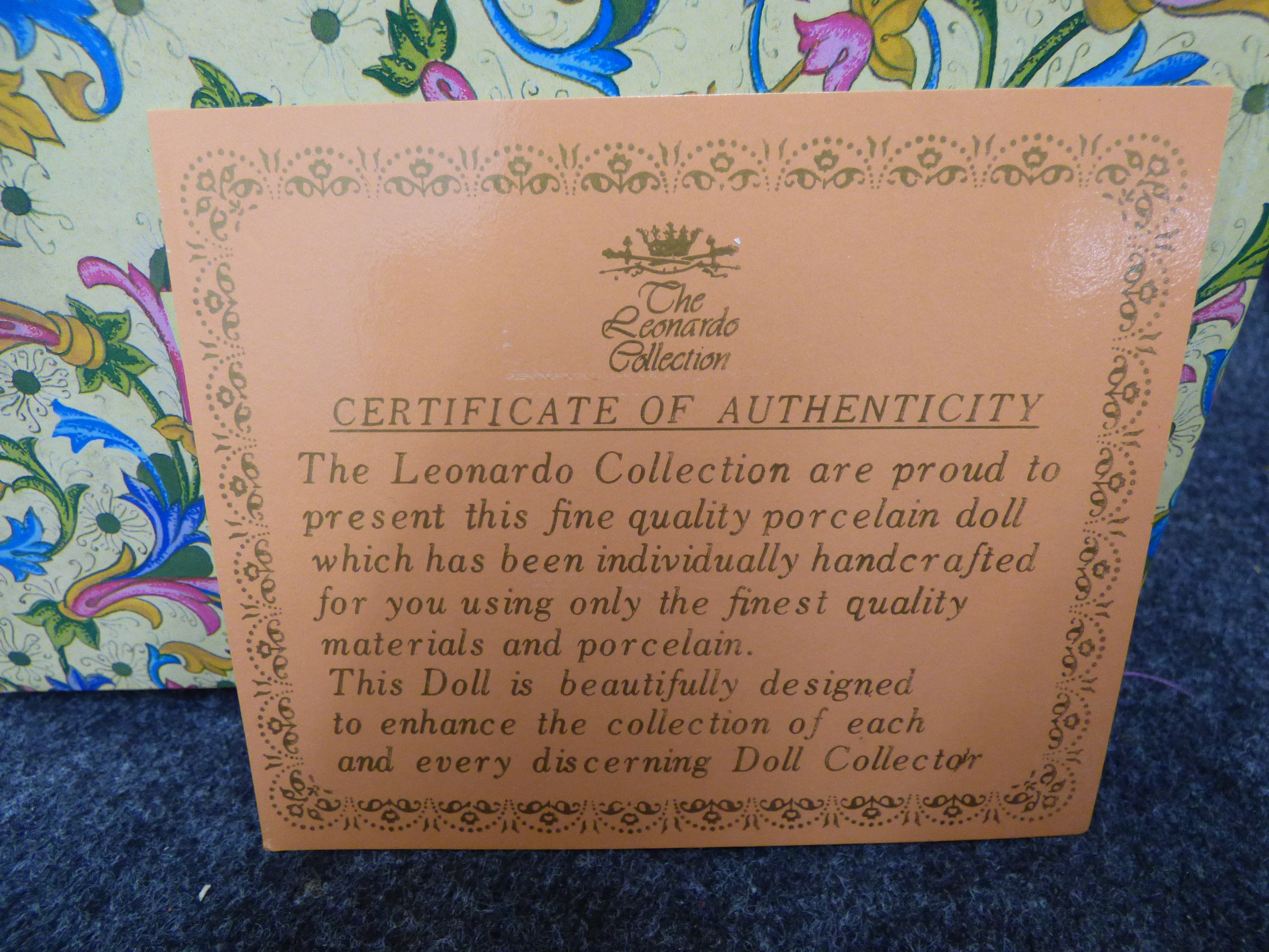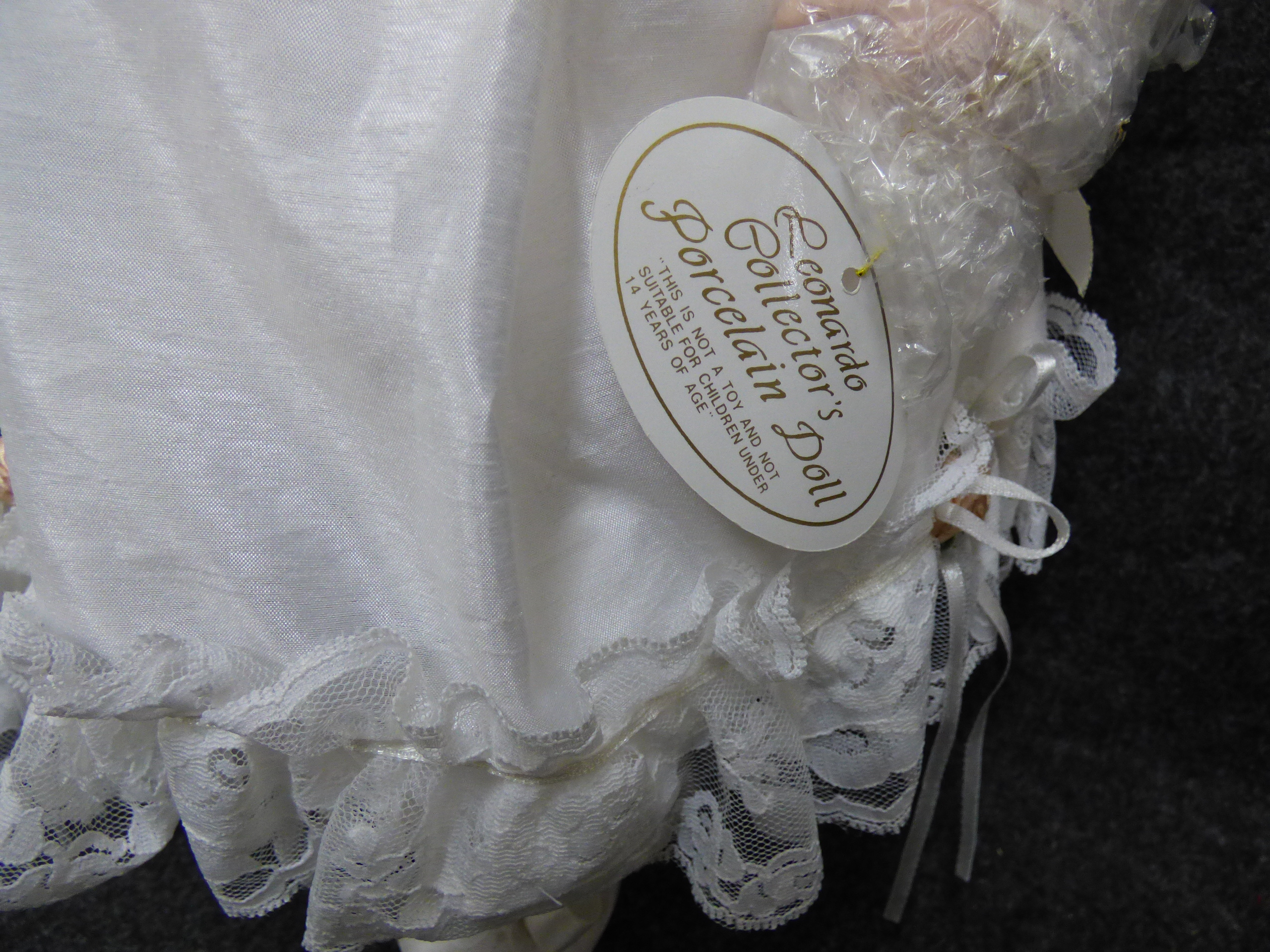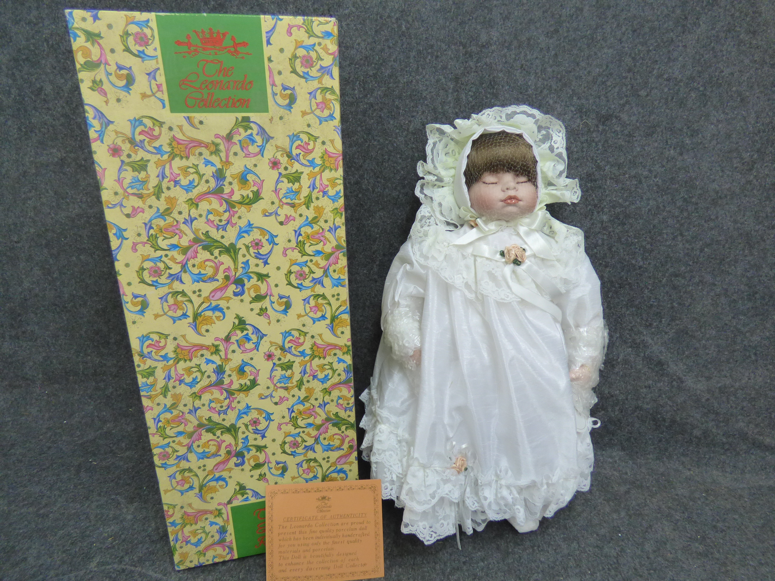 A white porcelain baby doll from The Leonardo Collection featuring a lace-trimmed gown and bonnet, accompanied by its original floral-patterned box, a certificate of authenticity, and a 1998 birthday card.