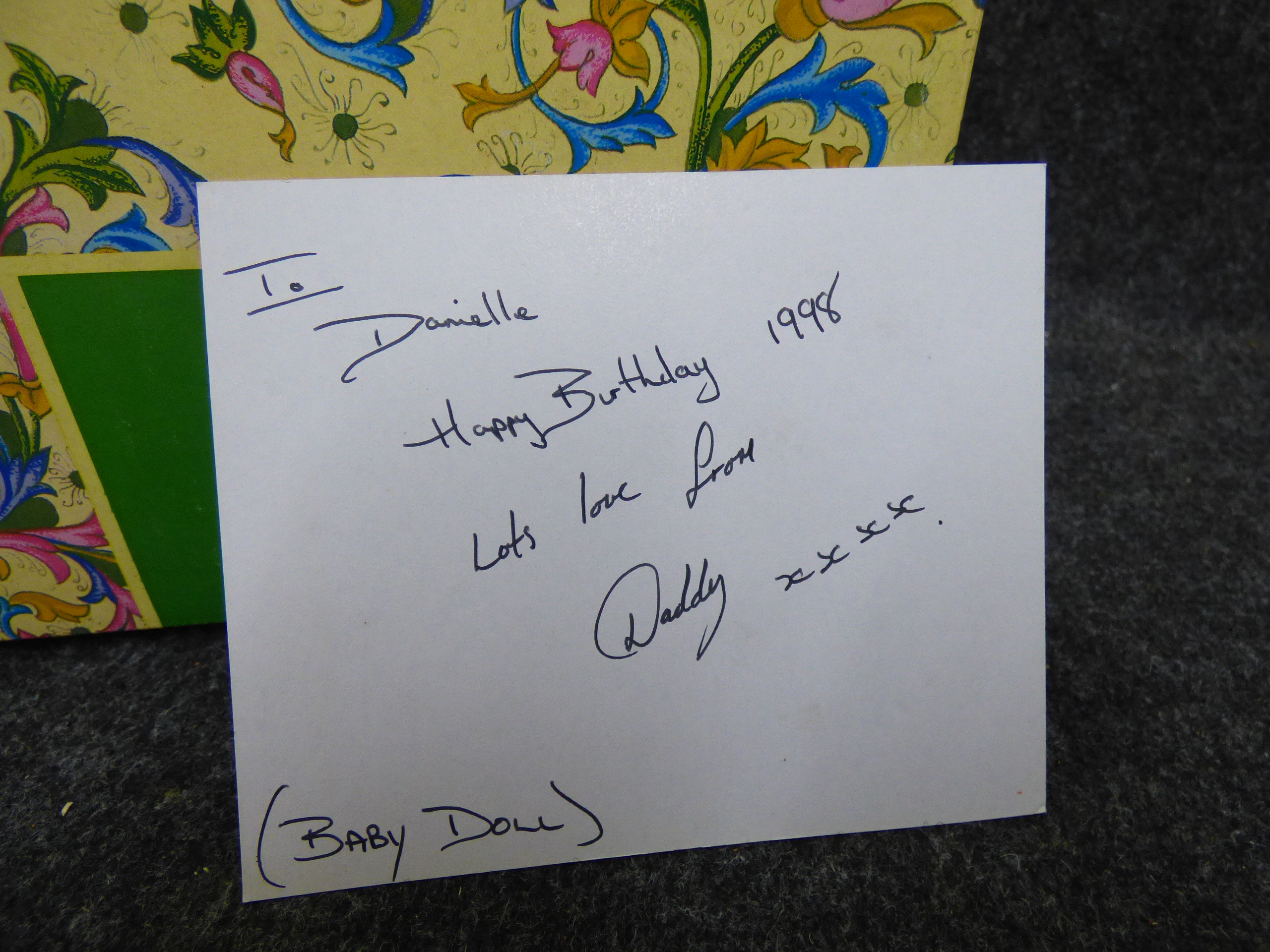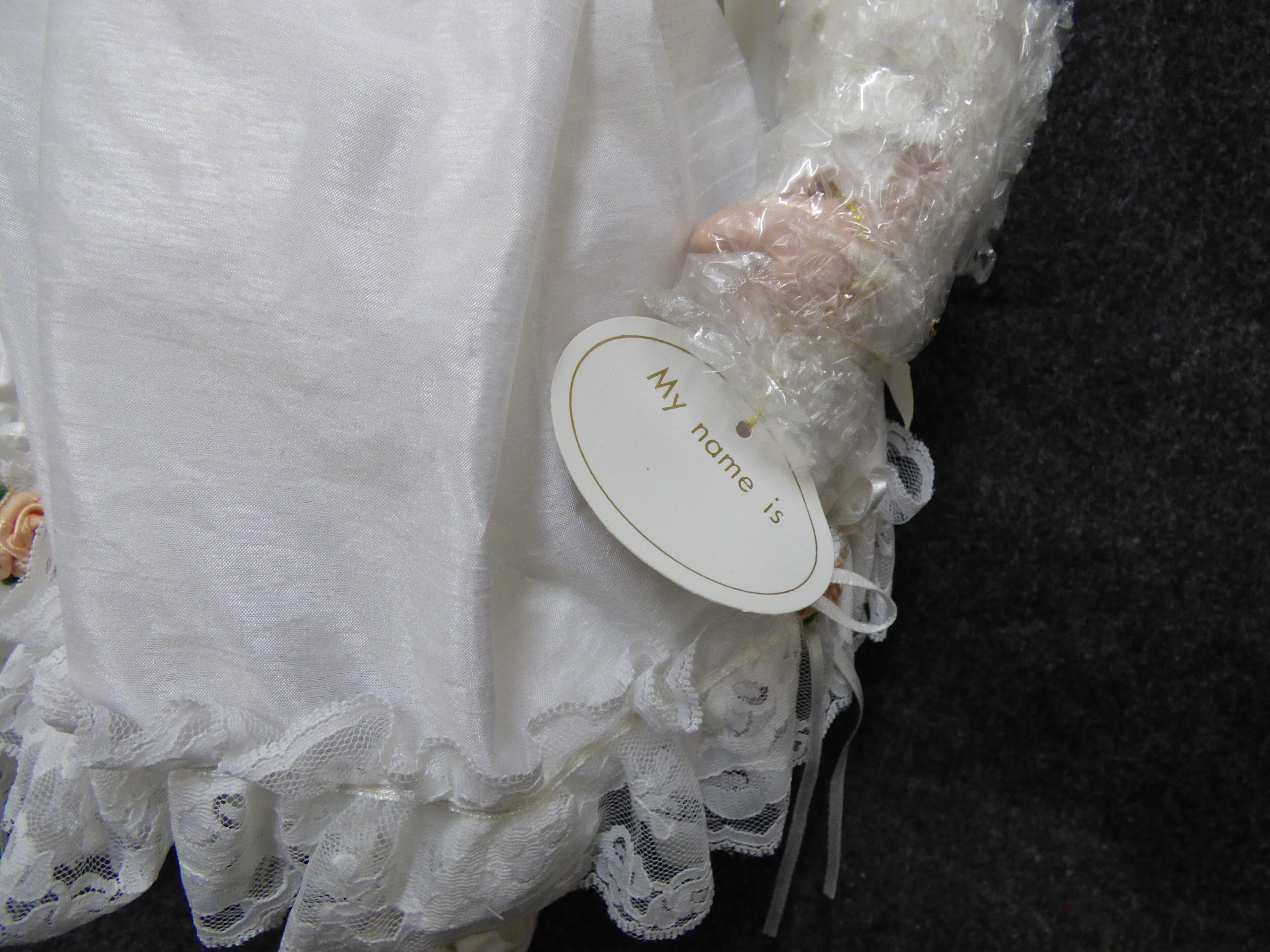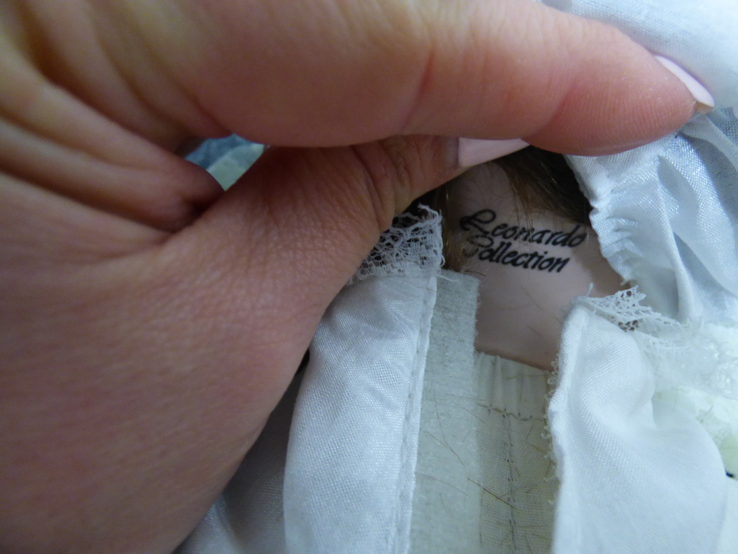A white porcelain baby doll from The Leonardo Collection featuring a lace-trimmed gown and bonnet, accompanied by its original floral-patterned box, a certificate of authenticity, and a 1998 birthday card.