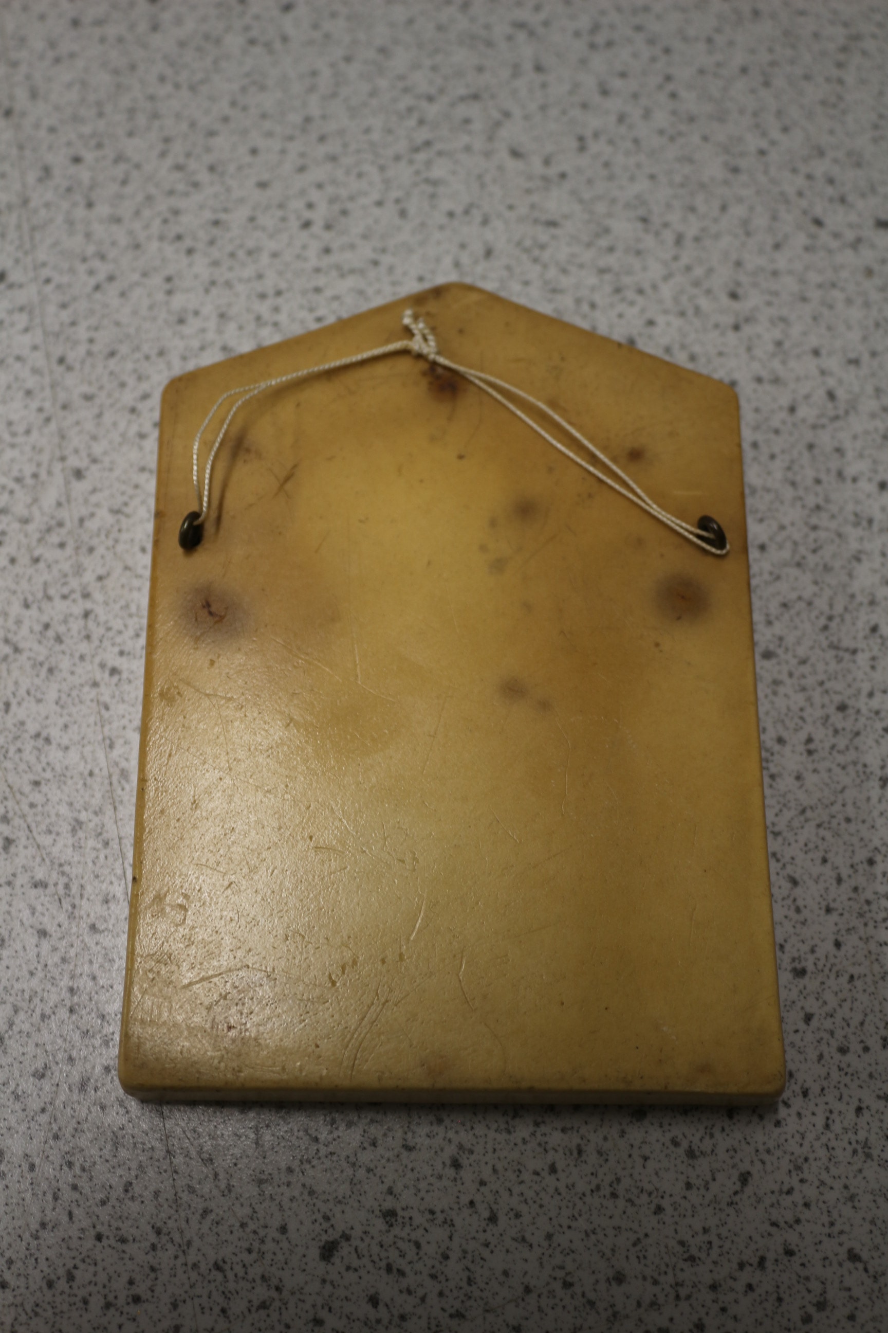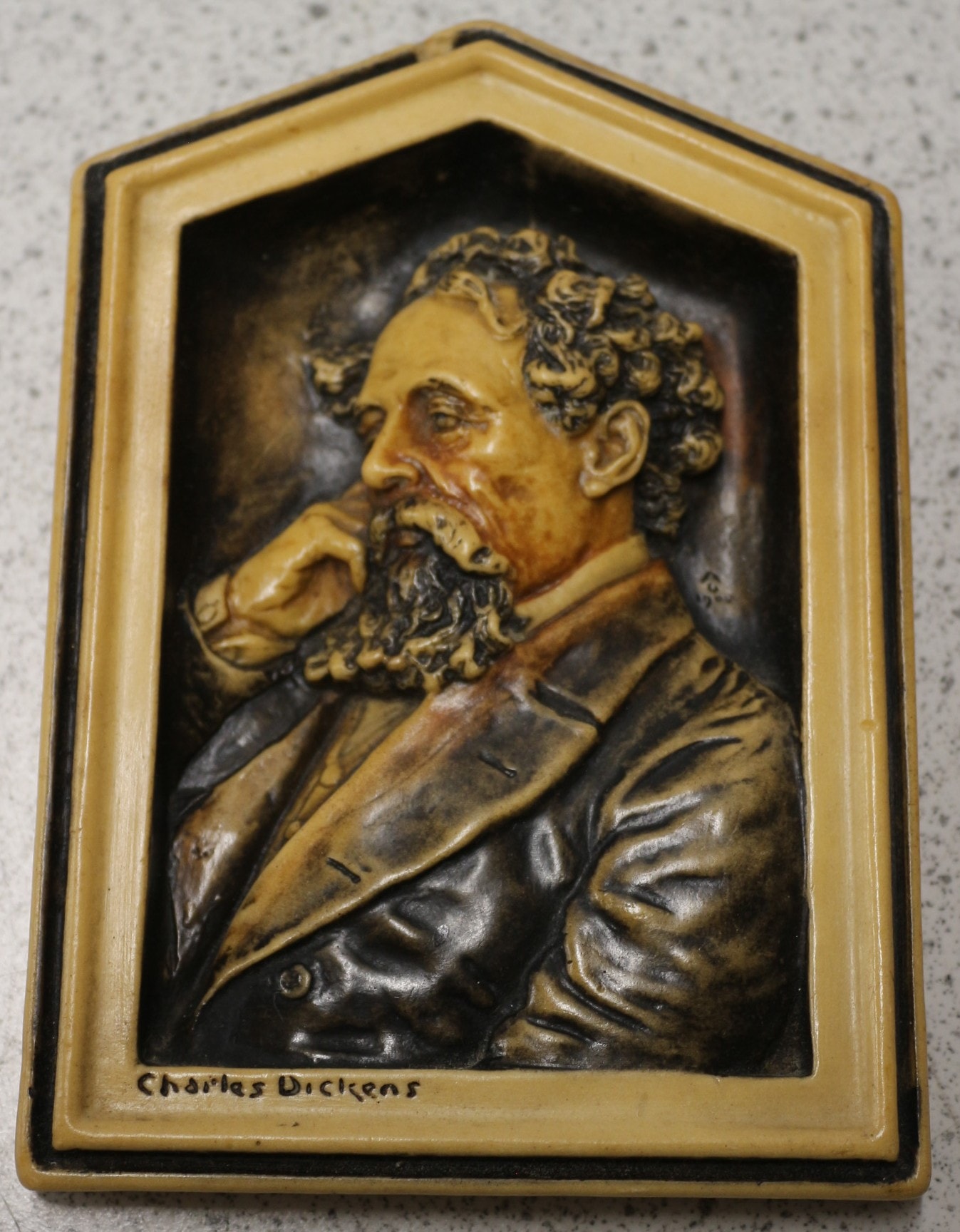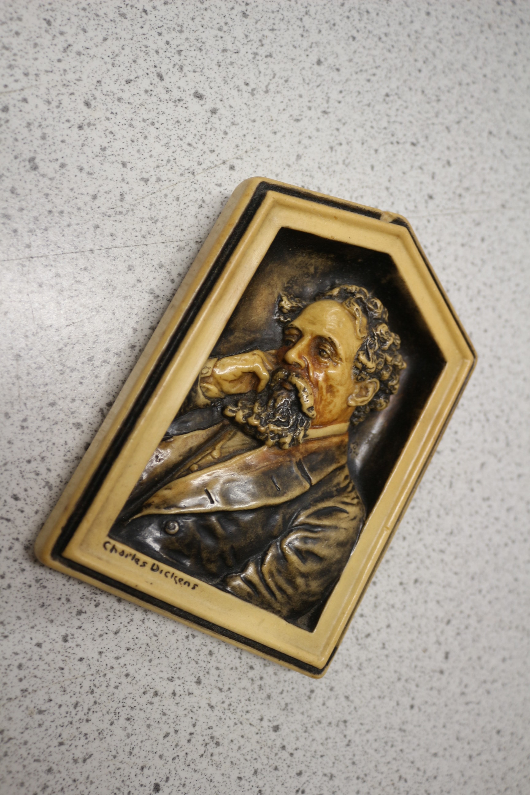 An Ivorex Osborne wall plaque depicting Charles Dickens. This rectangular molded resin or composite plaque features a high-relief portrait of a bearded man with curly hair, depicted in profile, dressed in formal attire, with his hand resting on his chin. The plaque is framed with an angled top, presenting a multi-toned, faux patinated finish in yellowish-cream, brown, and black hues. The name ‘Charles Dickens’ is inscribed in script at the bottom left of the relief, suggesting a Victorian or early 20th-century period. 14.5cm