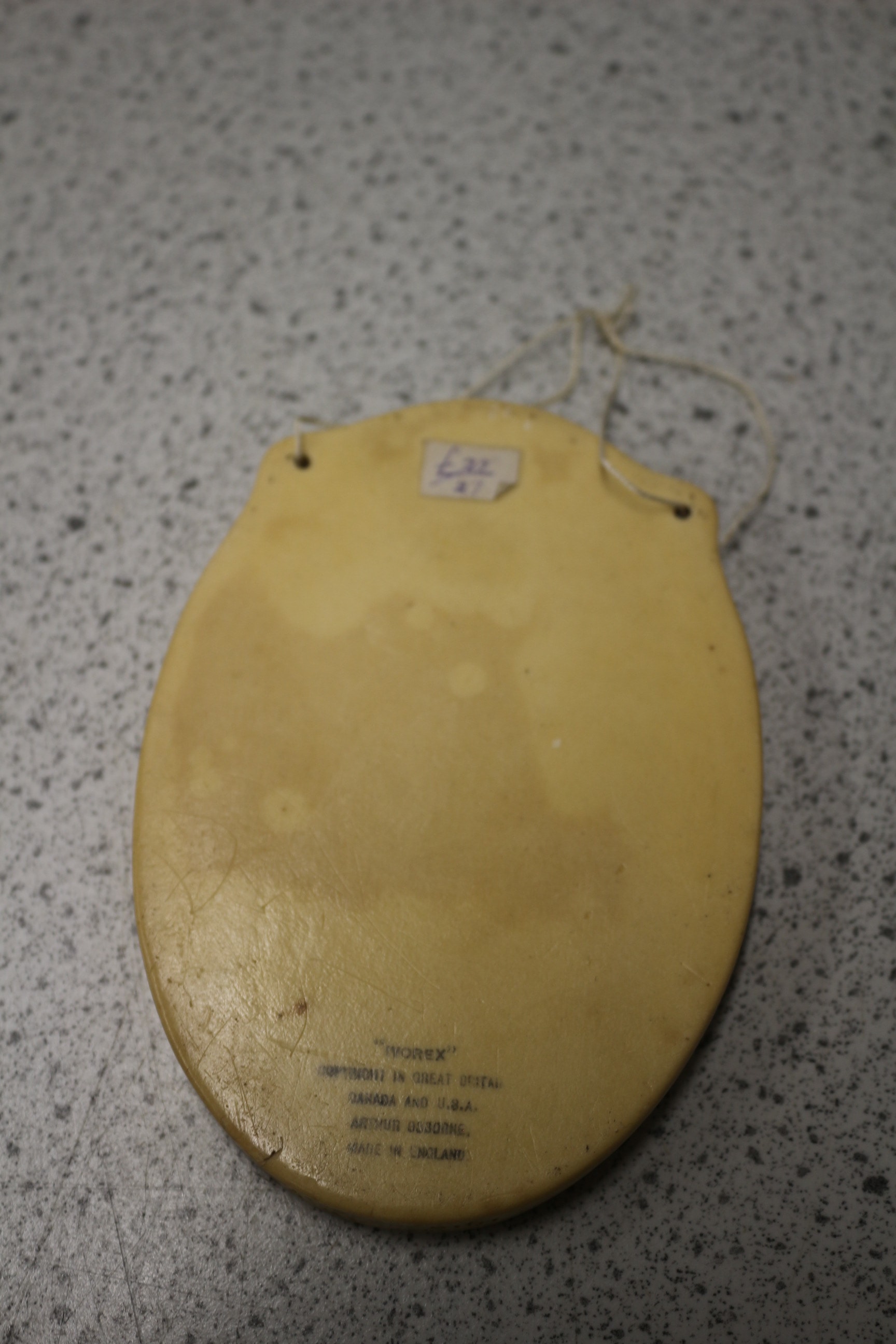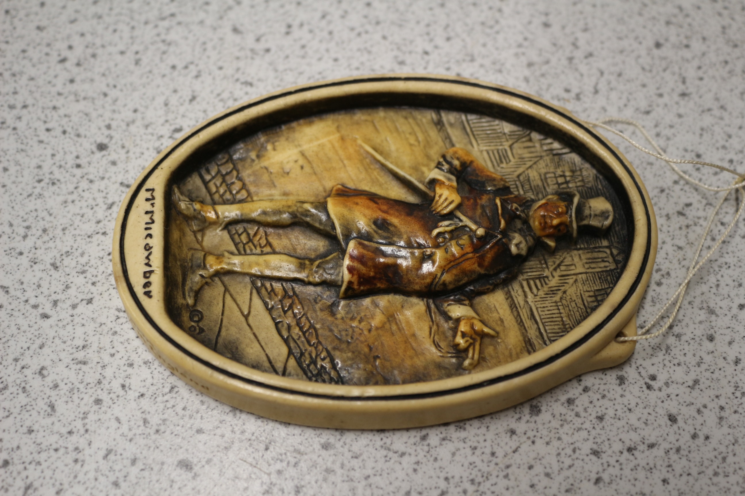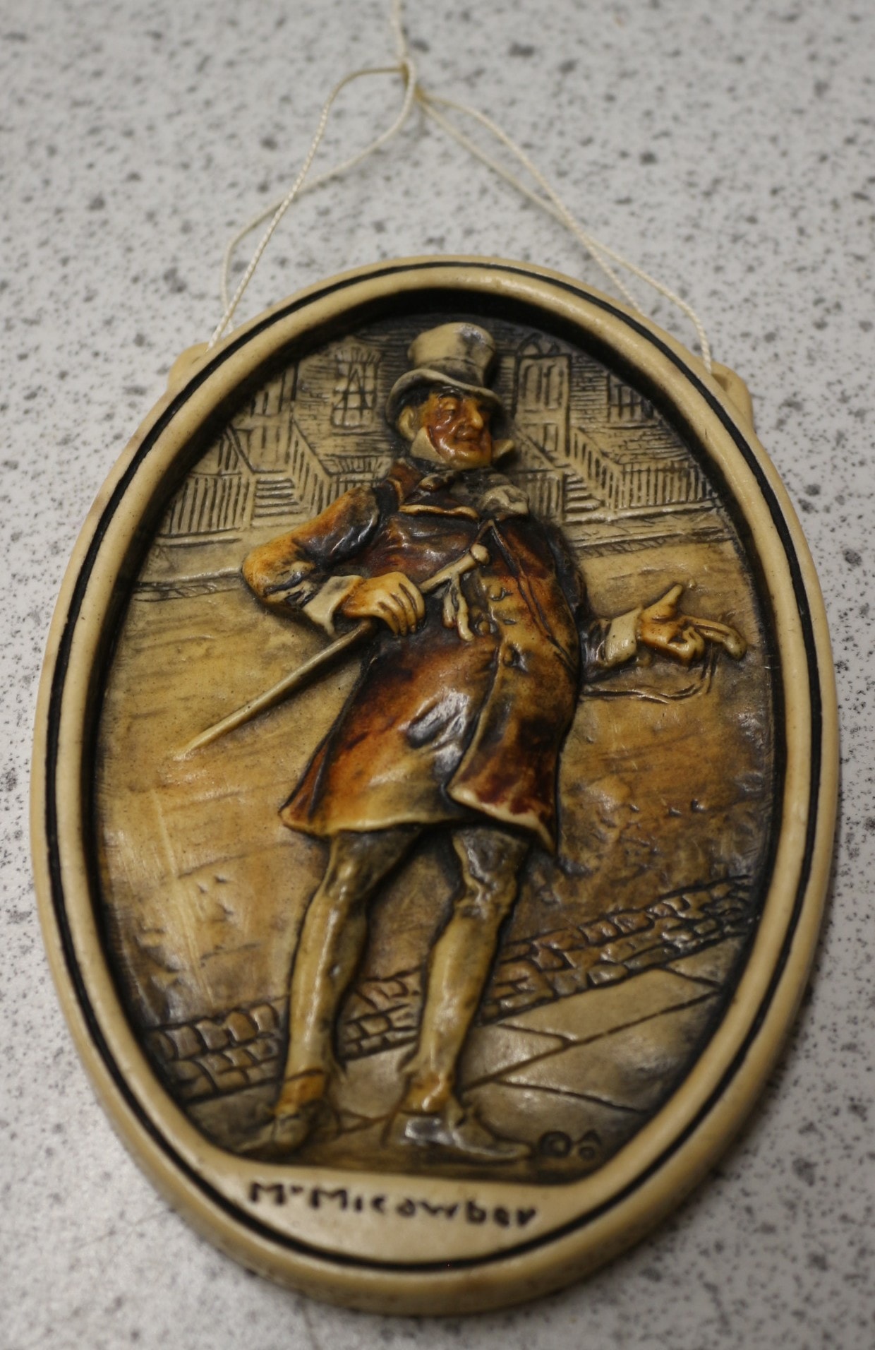 An Arnold Osborne Ivorex Plaque depicting M. Micawber. This oval-shaped decorative wall plaque features a three-dimensional relief of a male figure in 19th-century attire, including a top hat and long coat, holding a walking stick and gesturing, set against an urban architectural background. The item is crafted from a molded resin or composite material, finished with varied brown and beige tones to create an aged, faux ivory or wood effect. Along the bottom edge of the front, the name “M. Micawber” is inscribed. The reverse side features impressed text indicating “MOREX”, “COPYRIGHT IN GREAT BRITAIN, CANADA AND U.S.A.”, “ARNOLD OSBORNE”, and “MADE IN ENGLAND”, along with an affixed sticker displaying “LRL” and numerical information. The plaque is equipped with a string for hanging. 12.5cm