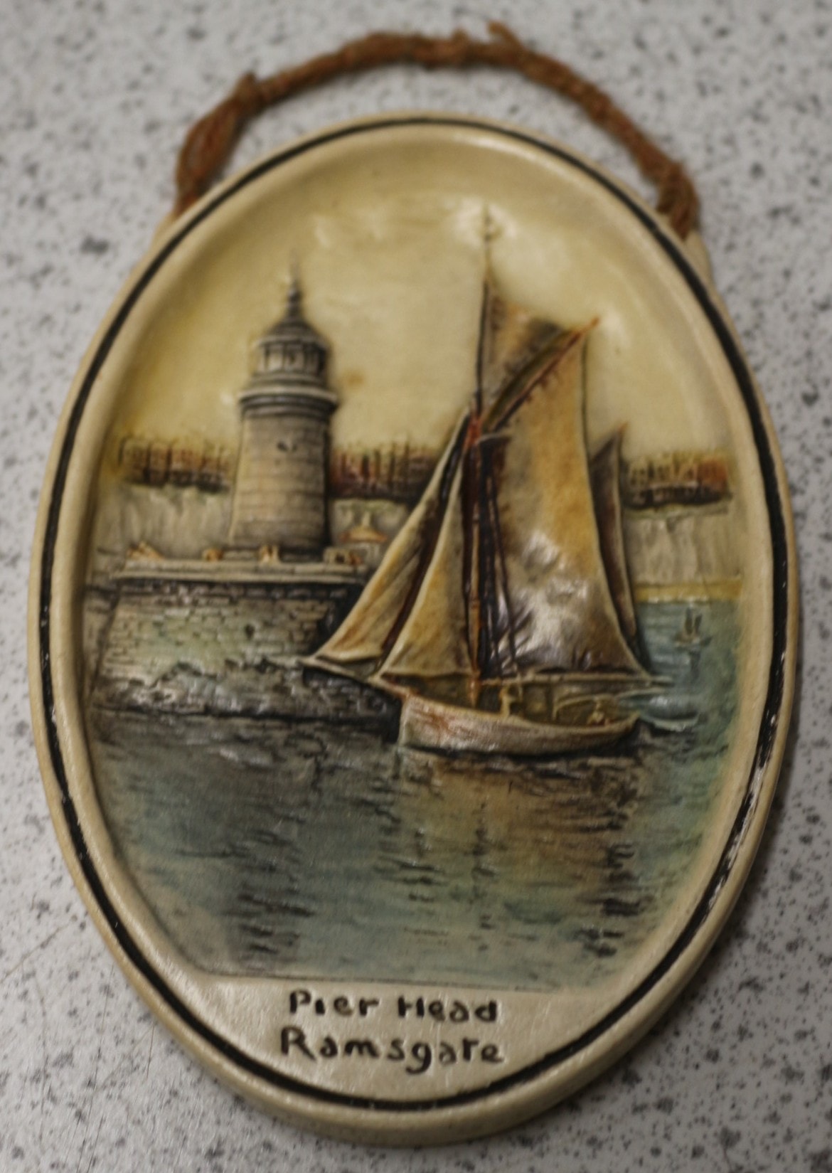An Artini Engraving wall plaque. This oval-shaped decorative item features a low-relief maritime scene, depicting a lighthouse situated on a stone pier, with a two-masted sailing vessel prominently positioned in the water in the foreground, and a distant shoreline visible behind. The color palette is muted. The front is inscribed “Pier Head Ramsgate.” The reverse side bears faint embossed text including “THORAX, ” “COPYRIGHT, ” and “MADE IN ENGLAND.” A twisted natural fiber rope is affixed as a hanger at the top. 12.5cm