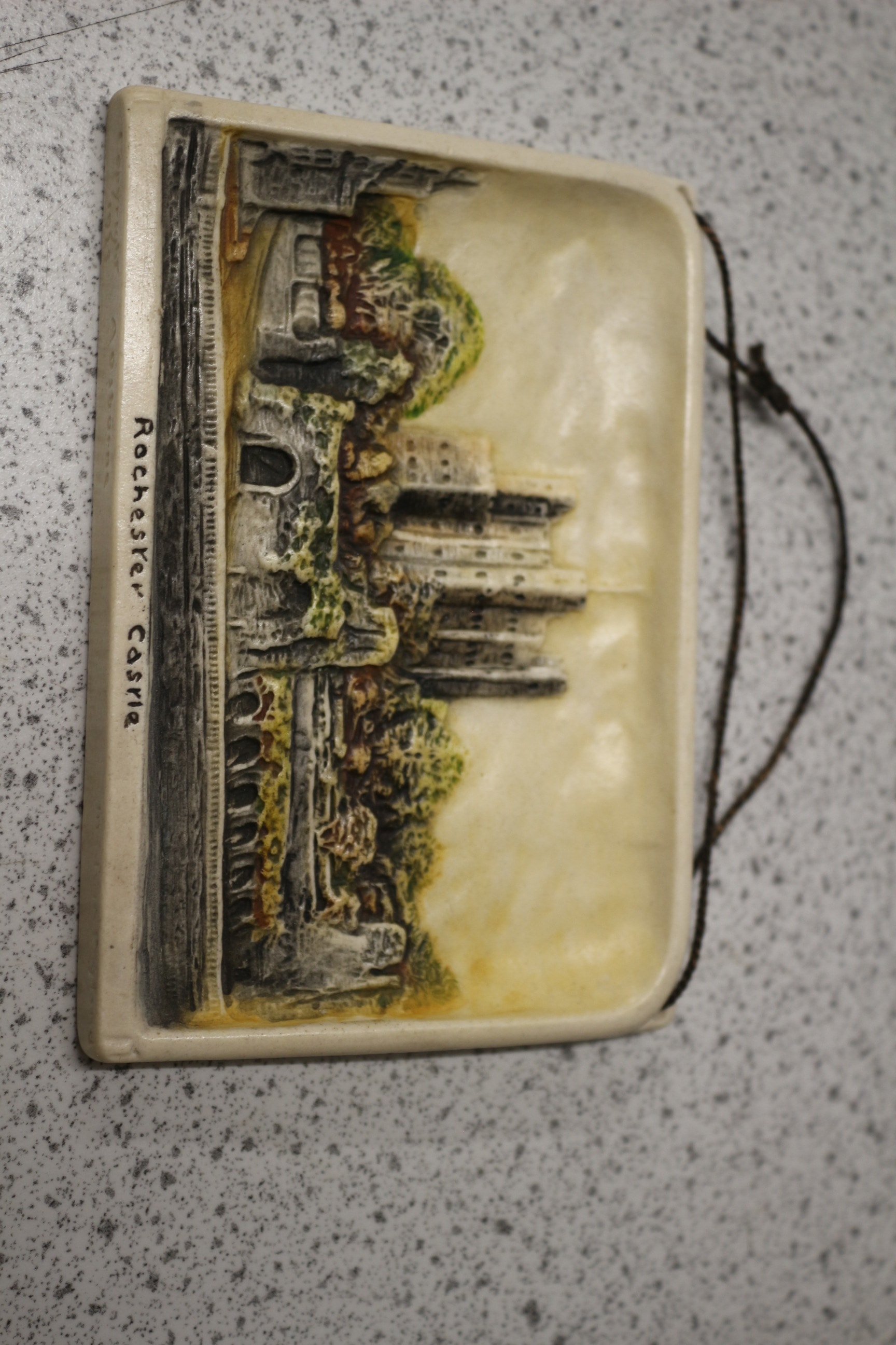 An Ivorex Osborne wall plaque depicting Rochester Castle. This rectangular molded relief plaque, likely dating from the mid-to-late 20th century, is crafted from a painted composite material, simulating aged stone and natural elements. It features a detailed landscape with a prominent castle structure. The inscription “Rochester Castle” is clearly visible in a cursive style at the bottom front. A dark braided cord is attached for hanging. 9cm